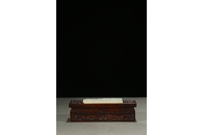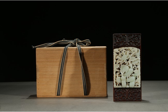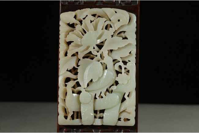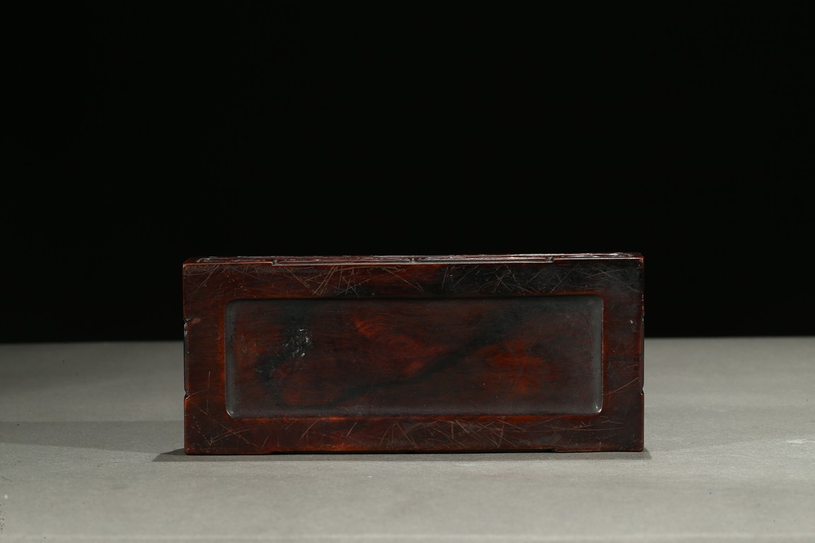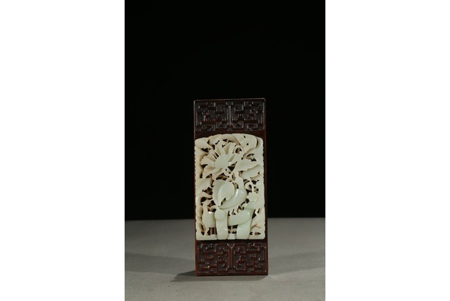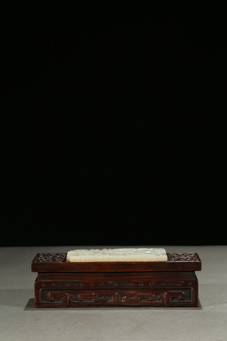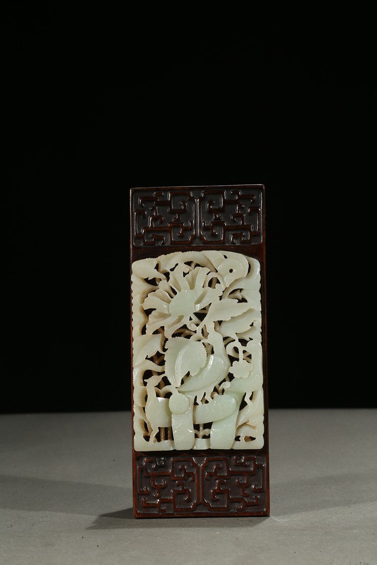 The rectangular box is embellished with a delicately reticulated white jade panel depicting birds and peonies, the wood cover and sides carved with stylized cloud design in relief. Qing Dynasty period.