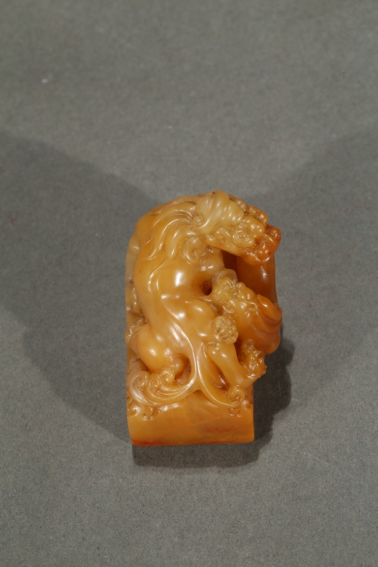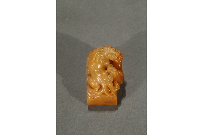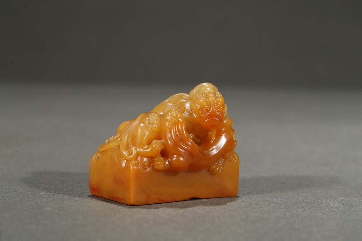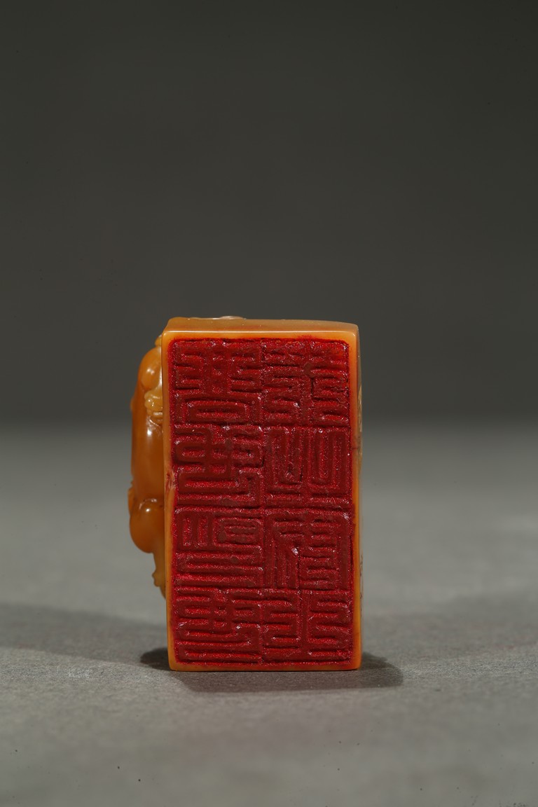 The rectanuglar seal carved with two playful buddhist lions, one side with inscription, the seal face carved.