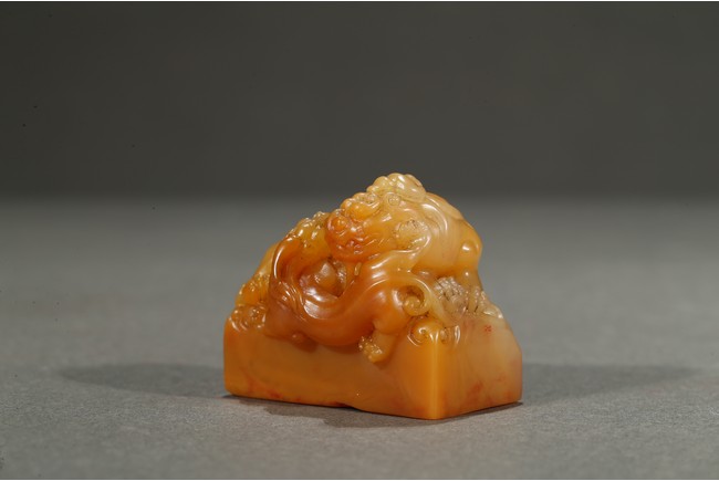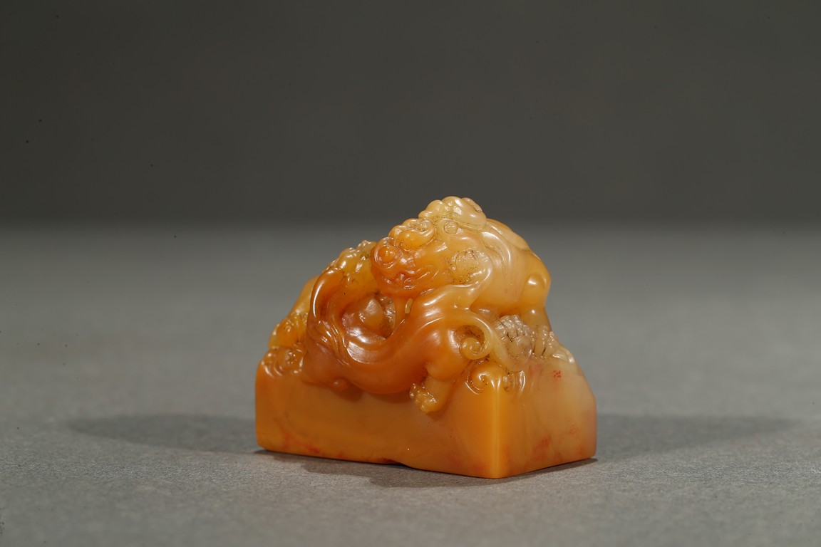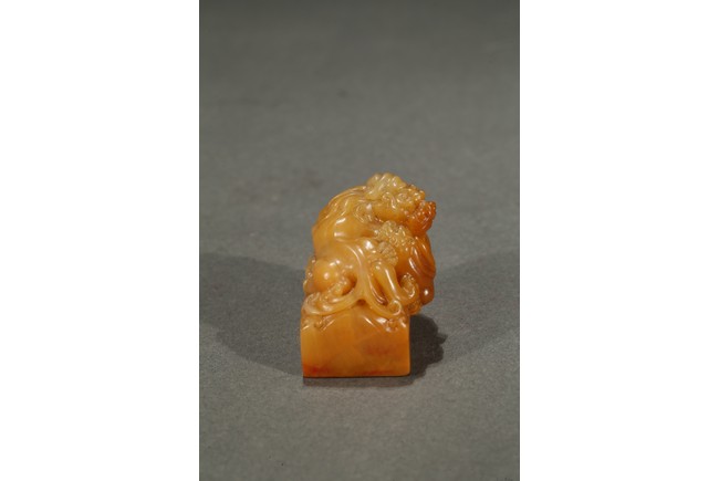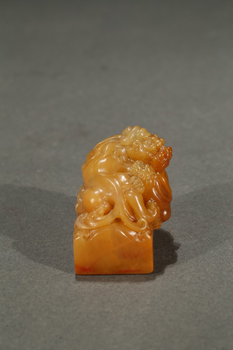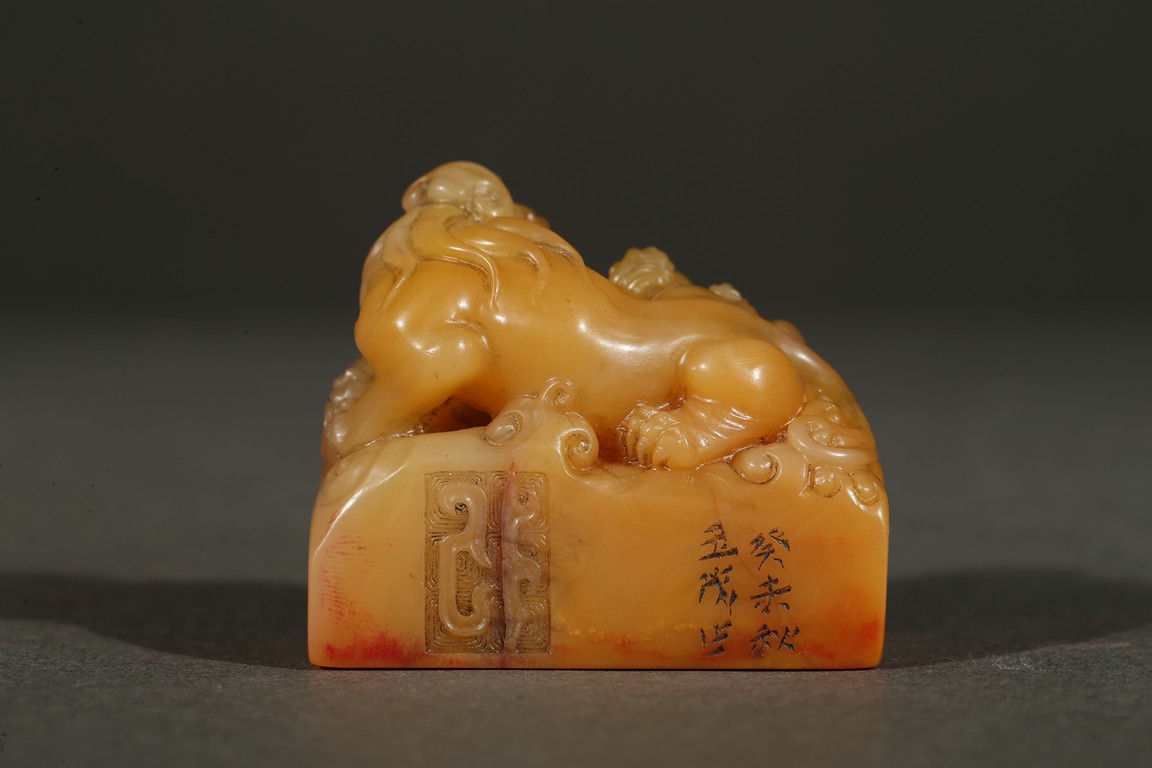 The rectanuglar seal carved with two playful buddhist lions, one side with inscription, the seal face carved.