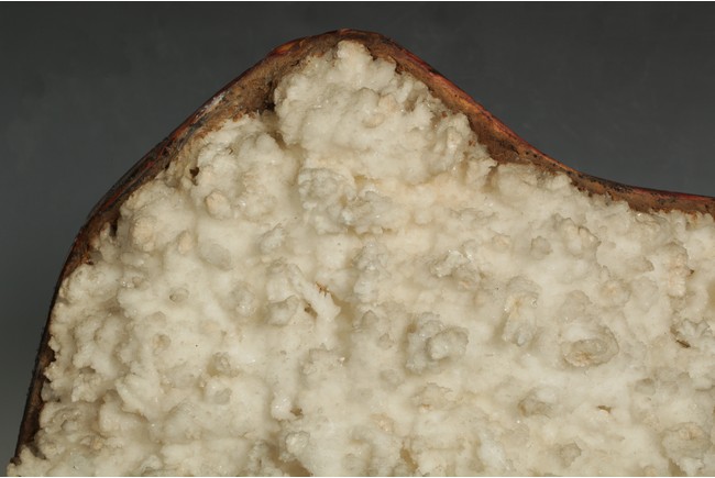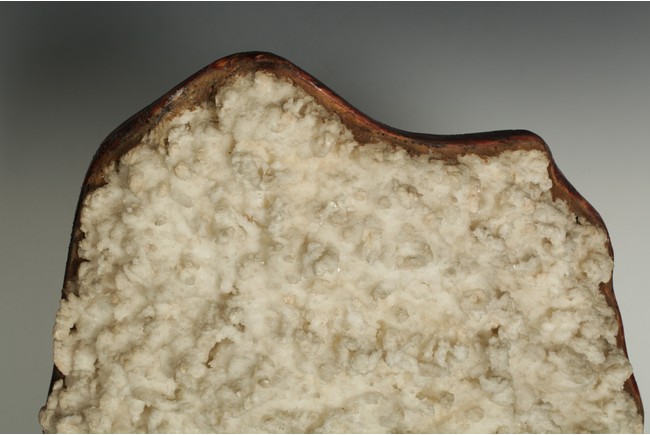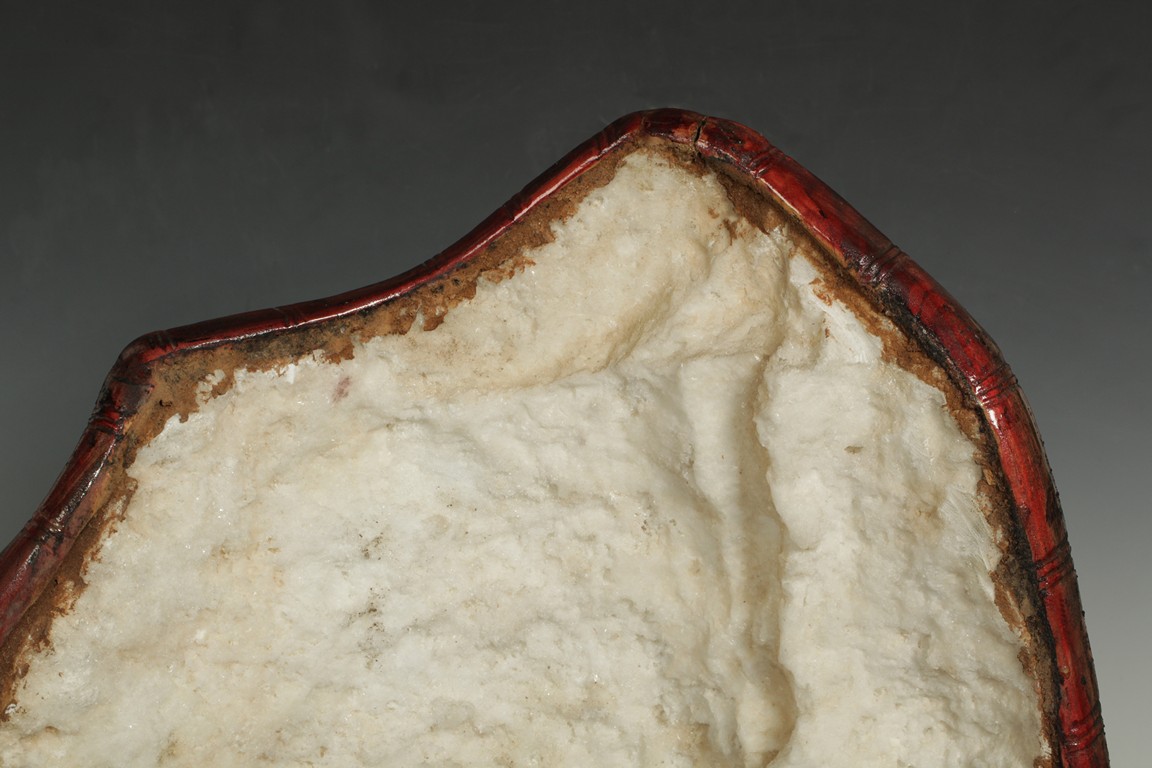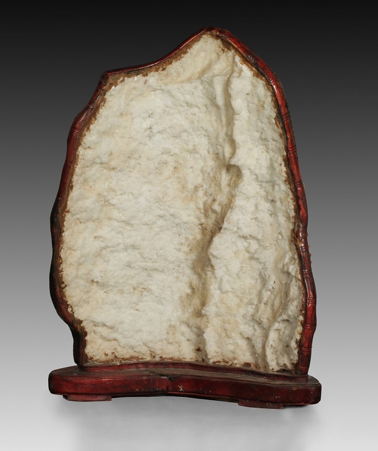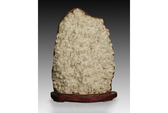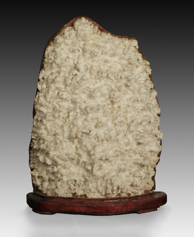 This large beautiful naturalistic dolomite stone formation is set on a wooden stand, fitted with the edge frame in wood as well.