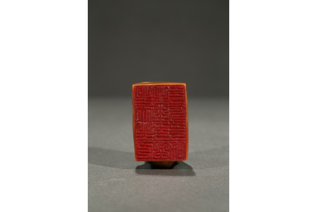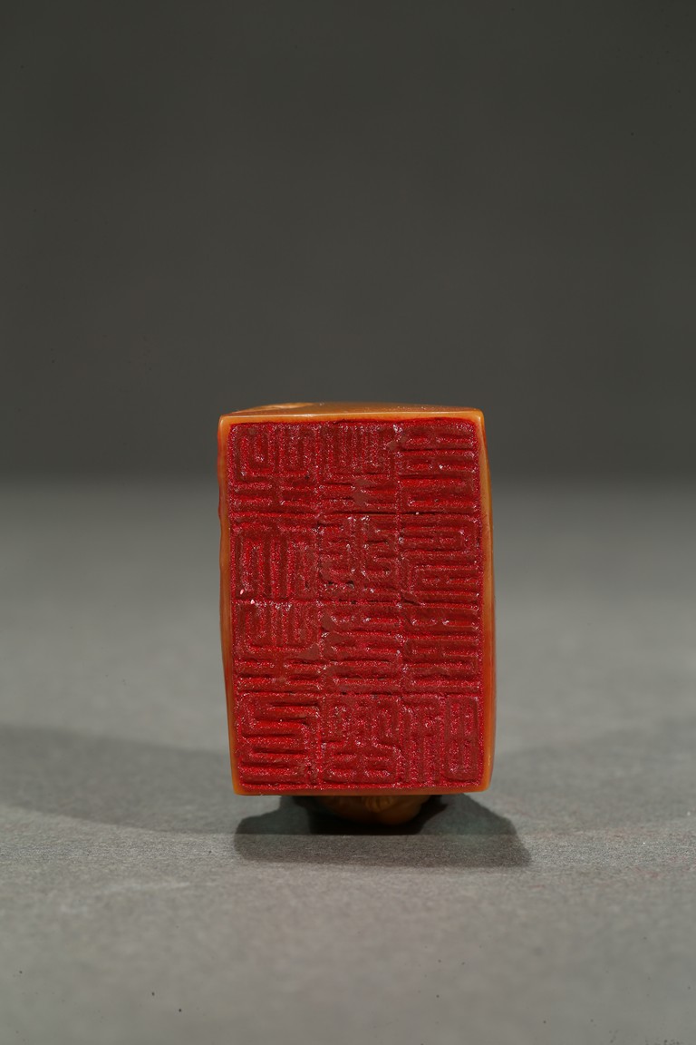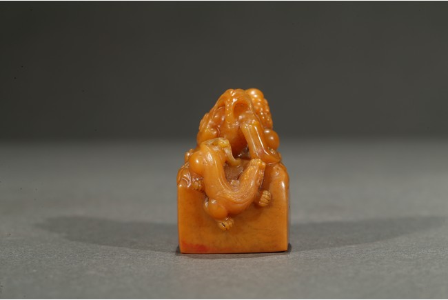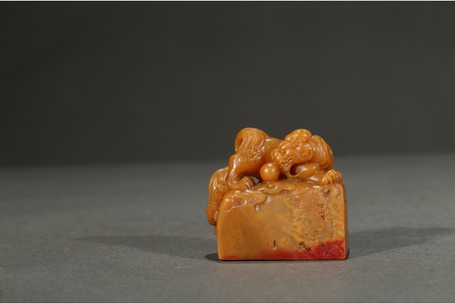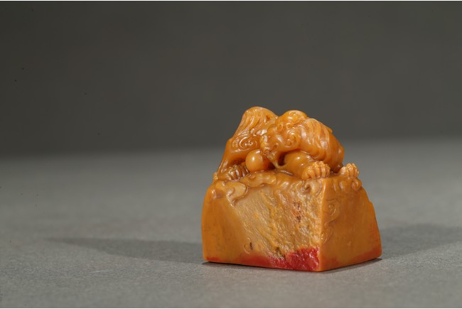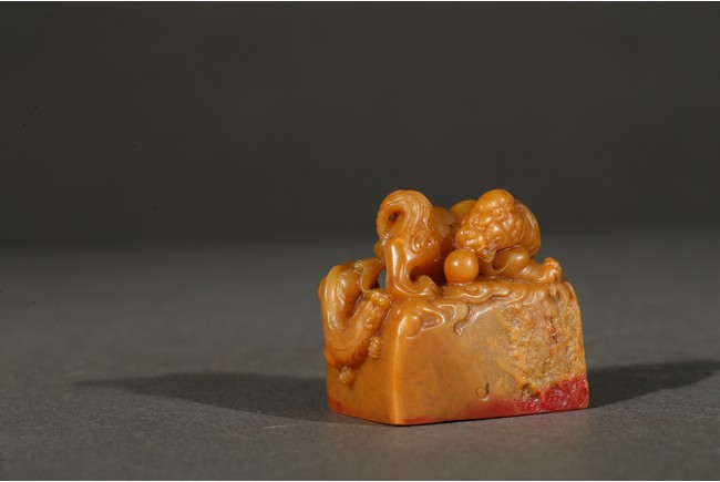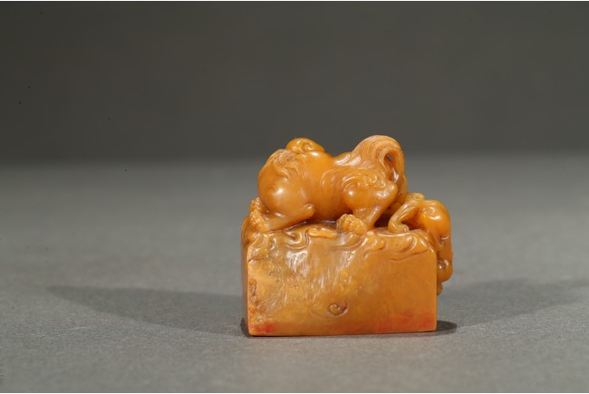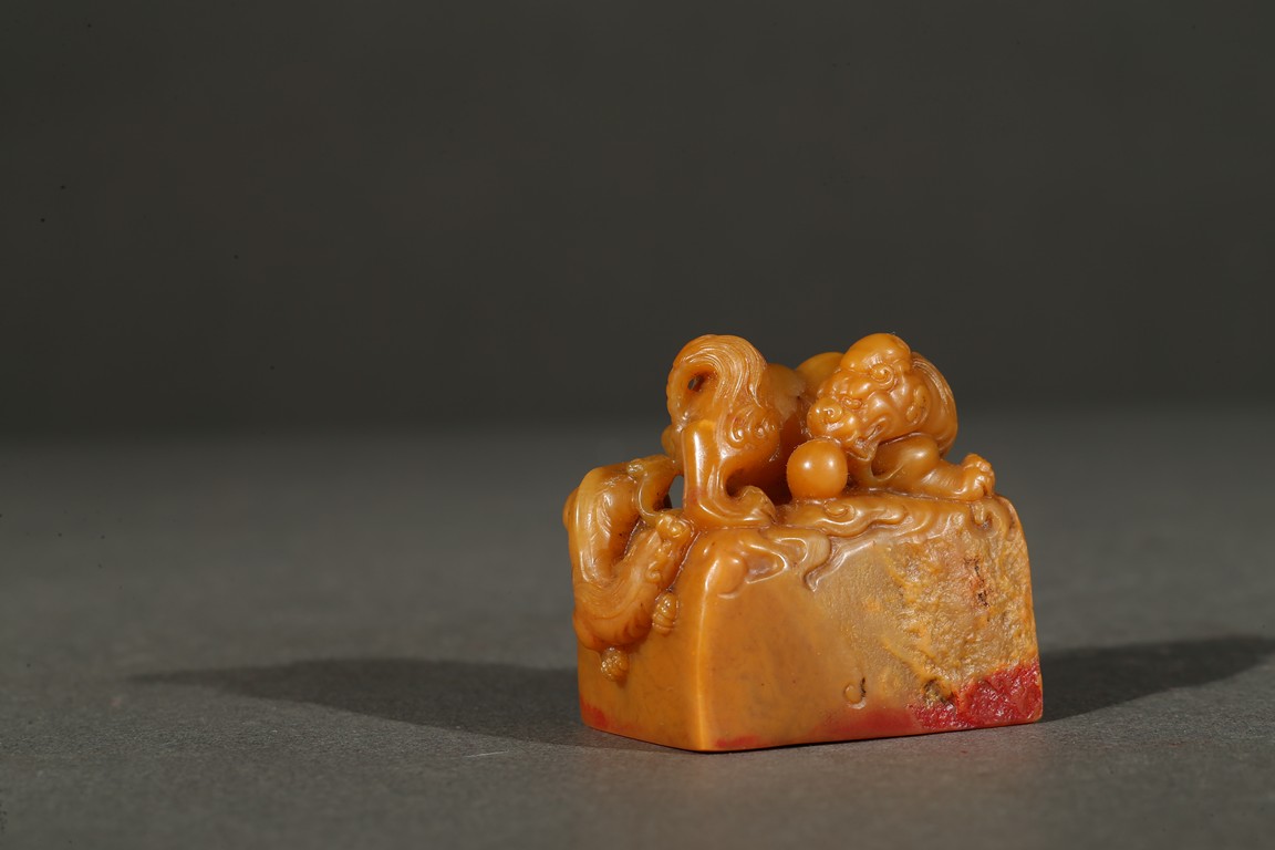 Of rectangular section, the seal carved with two buddhist lions with a brocade under its paw in high relief, one side uncarved, the seal surface carved with twelve characters.