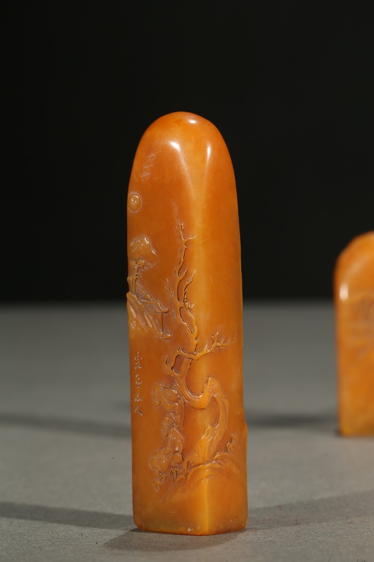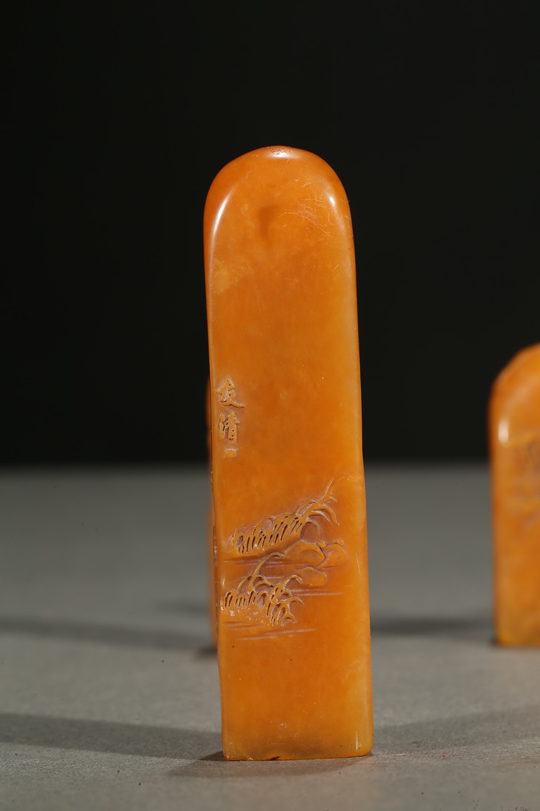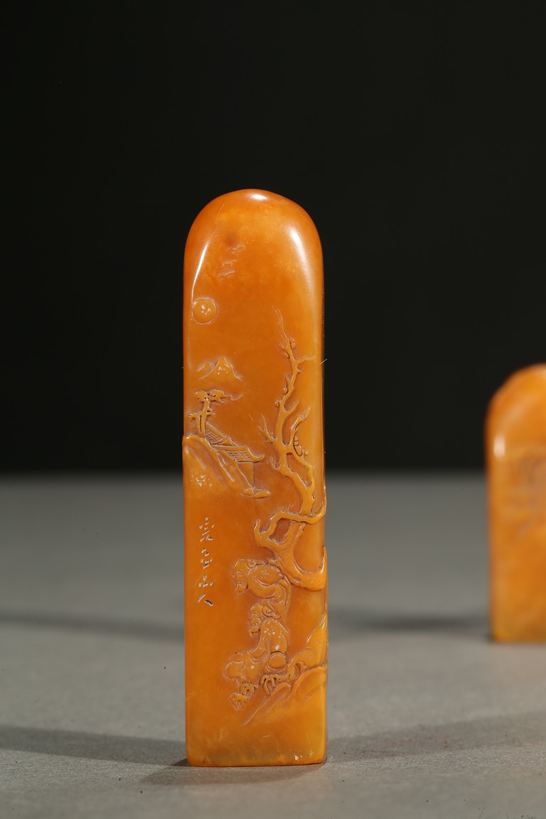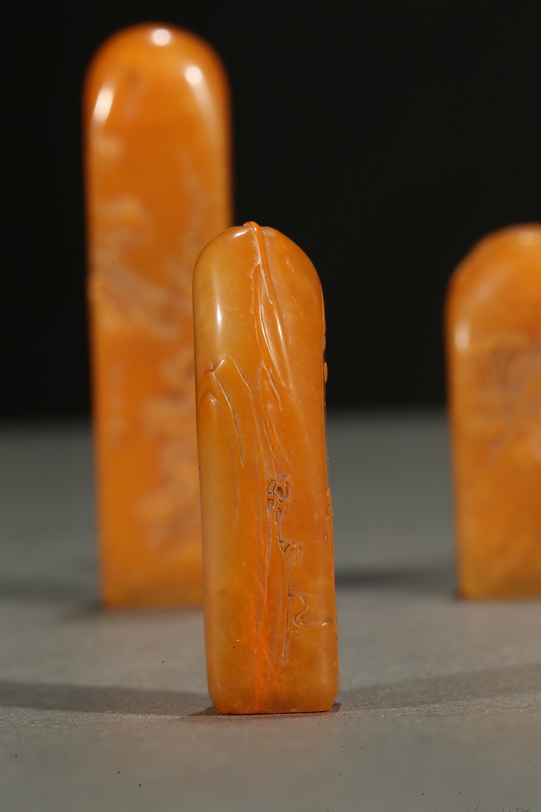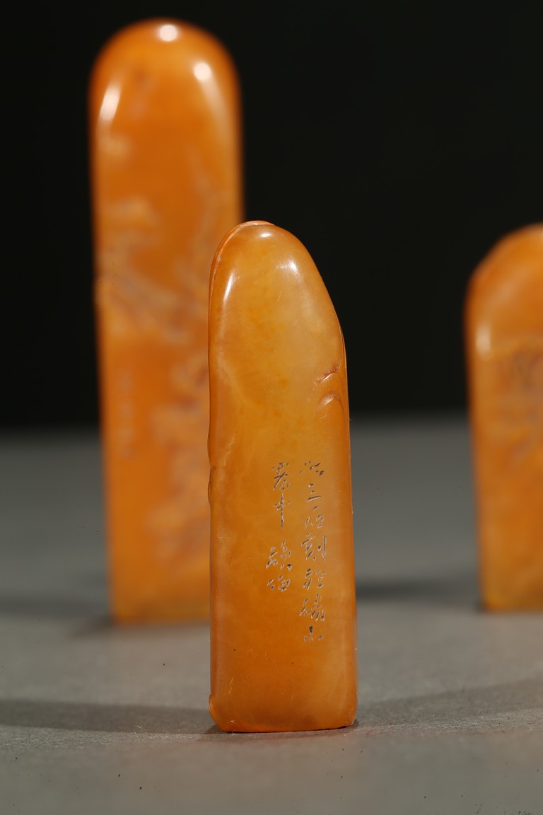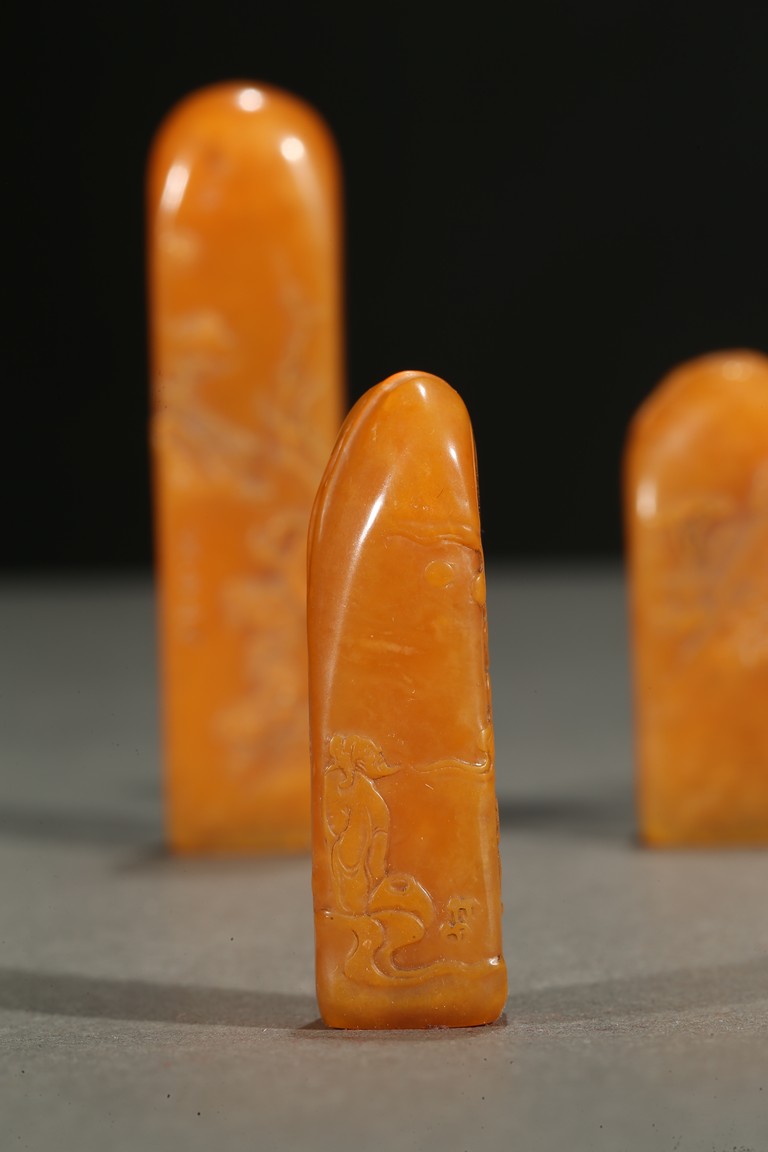Each seal of slender rectangular form, finely carved through the shallow skin to depict figures and landscape, each carved with inscription.