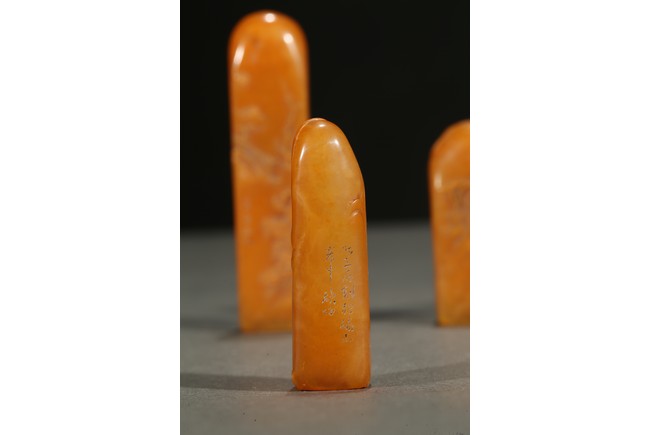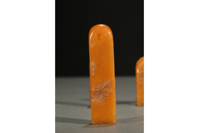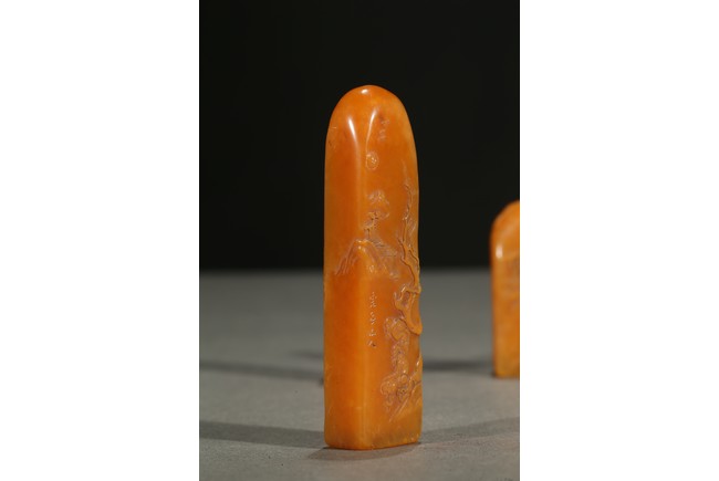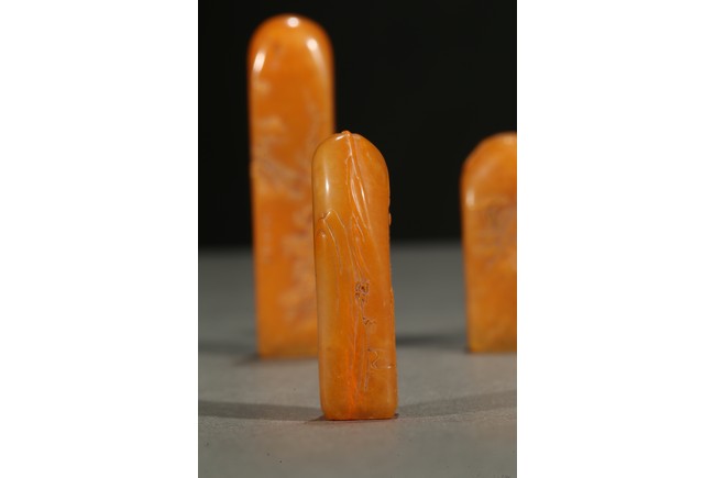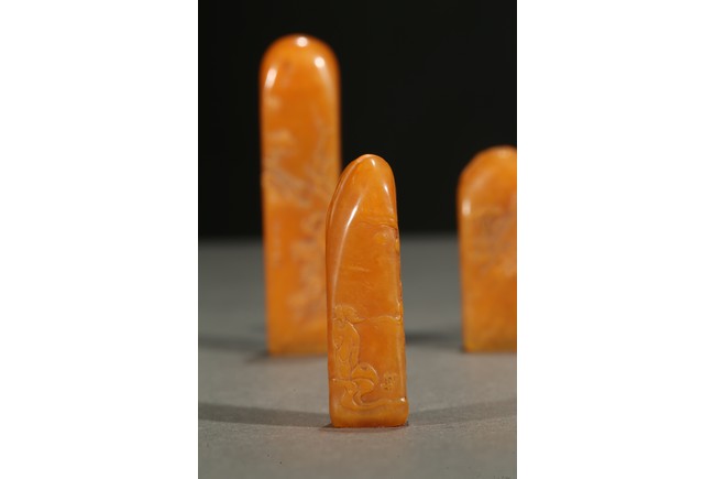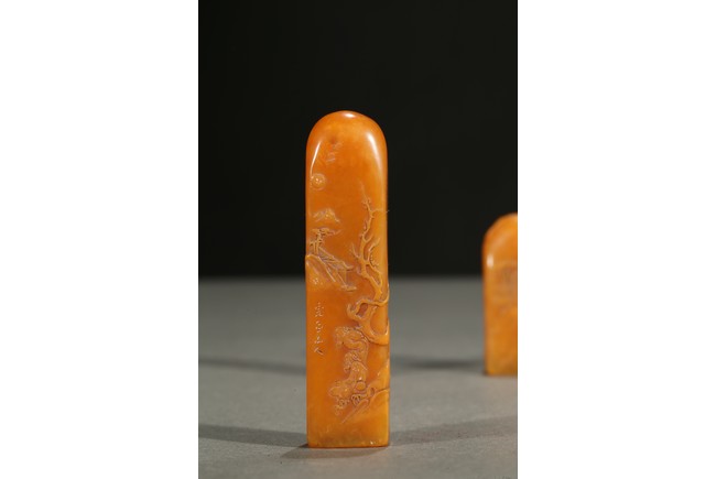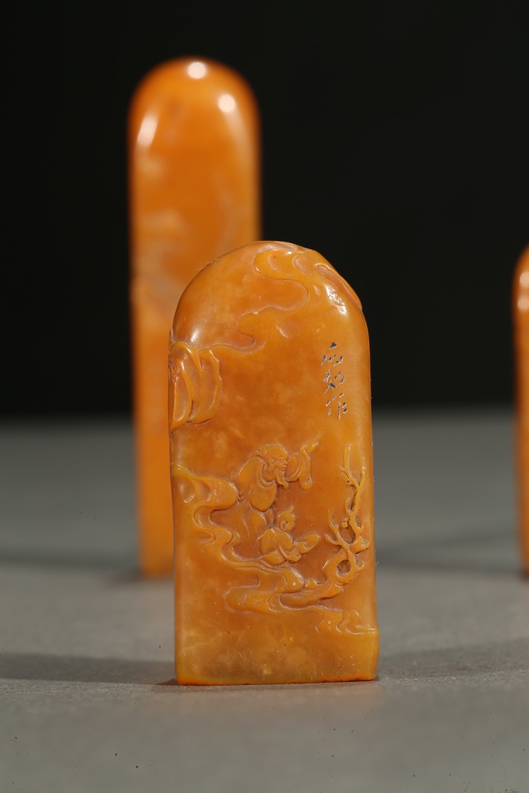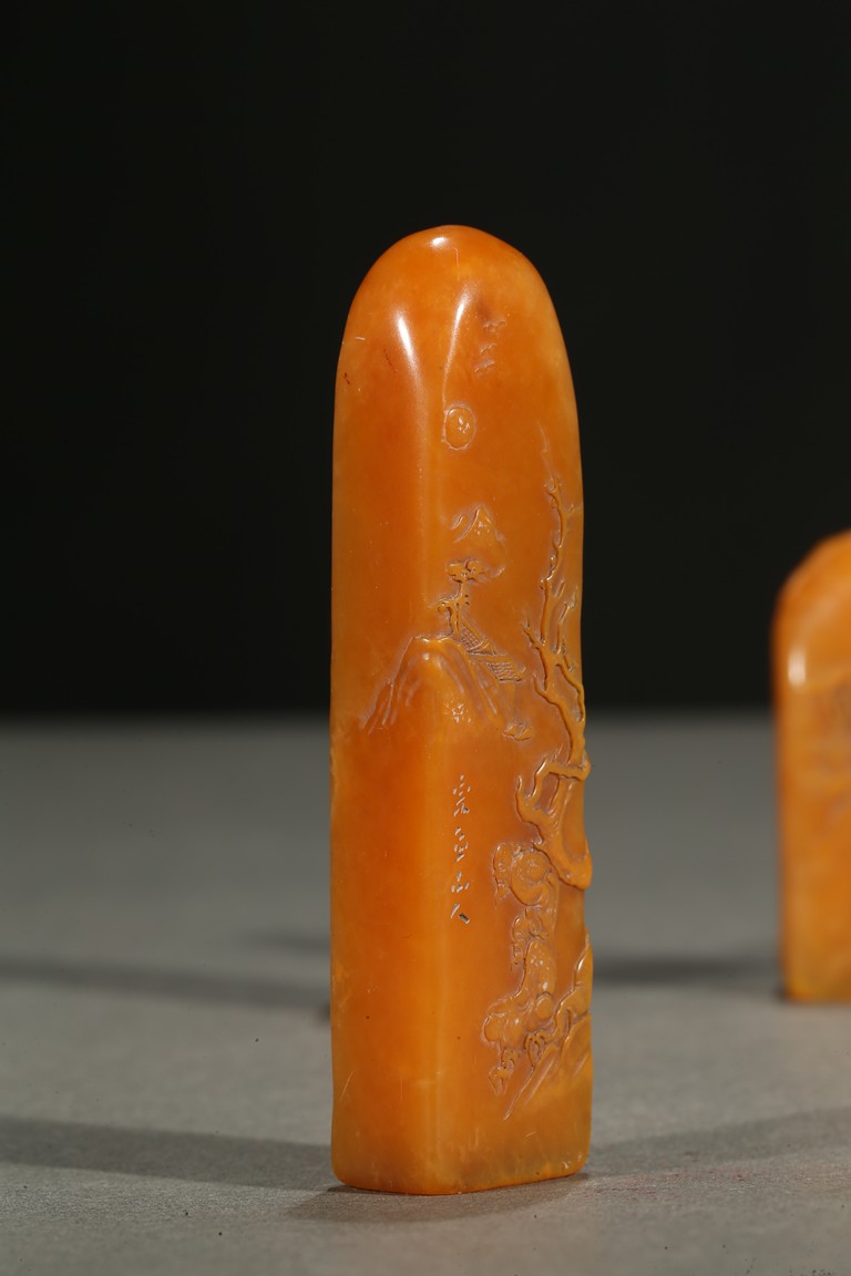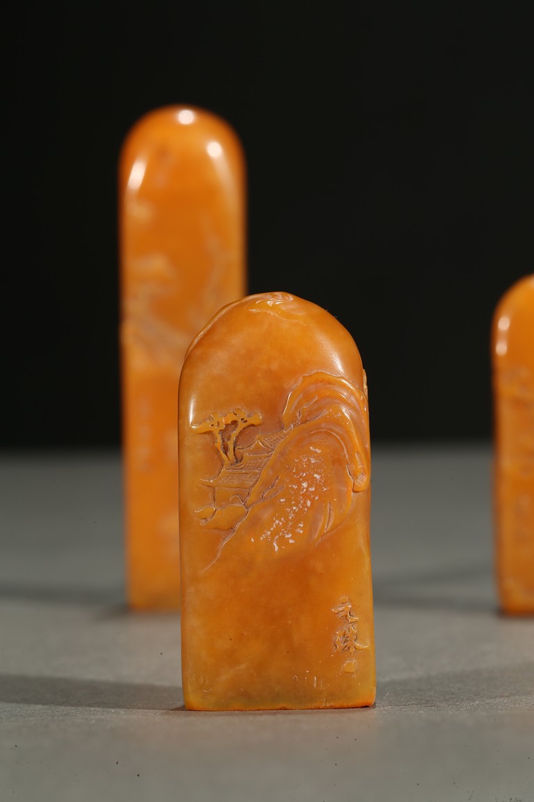Each seal of slender rectangular form, finely carved through the shallow skin to depict figures and landscape, each carved with inscription.