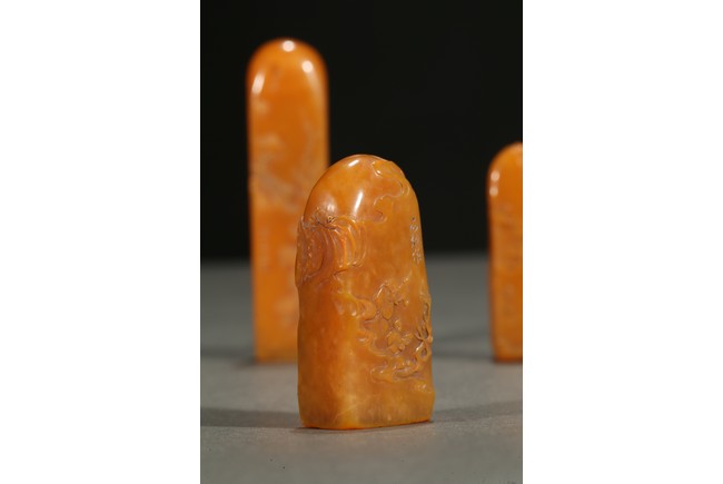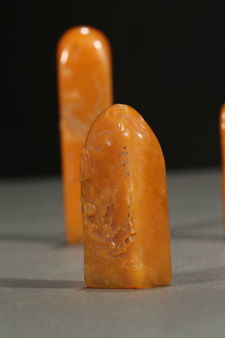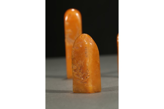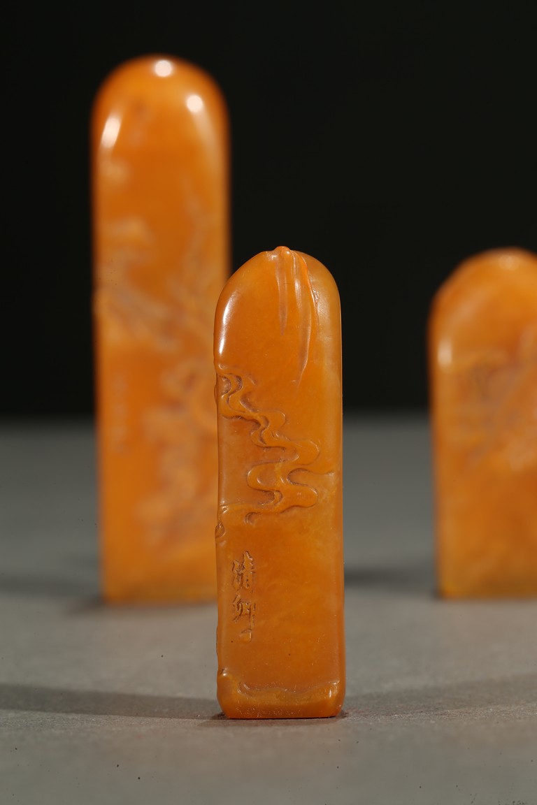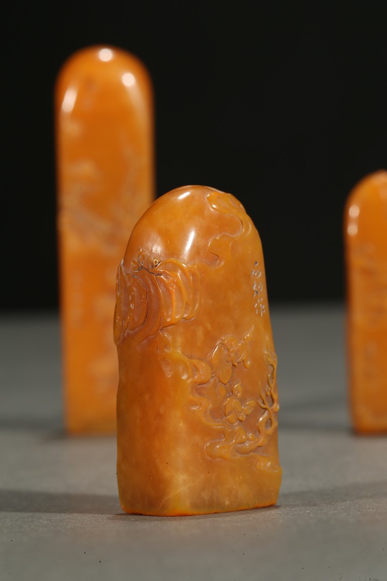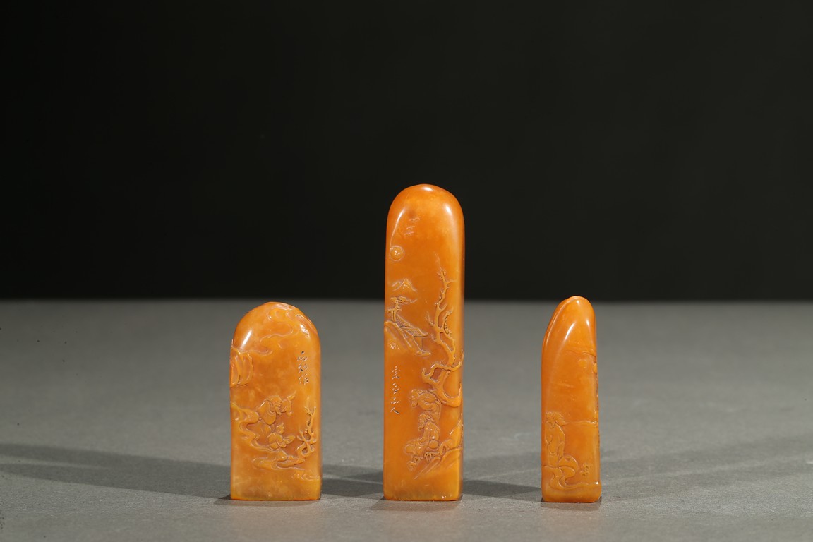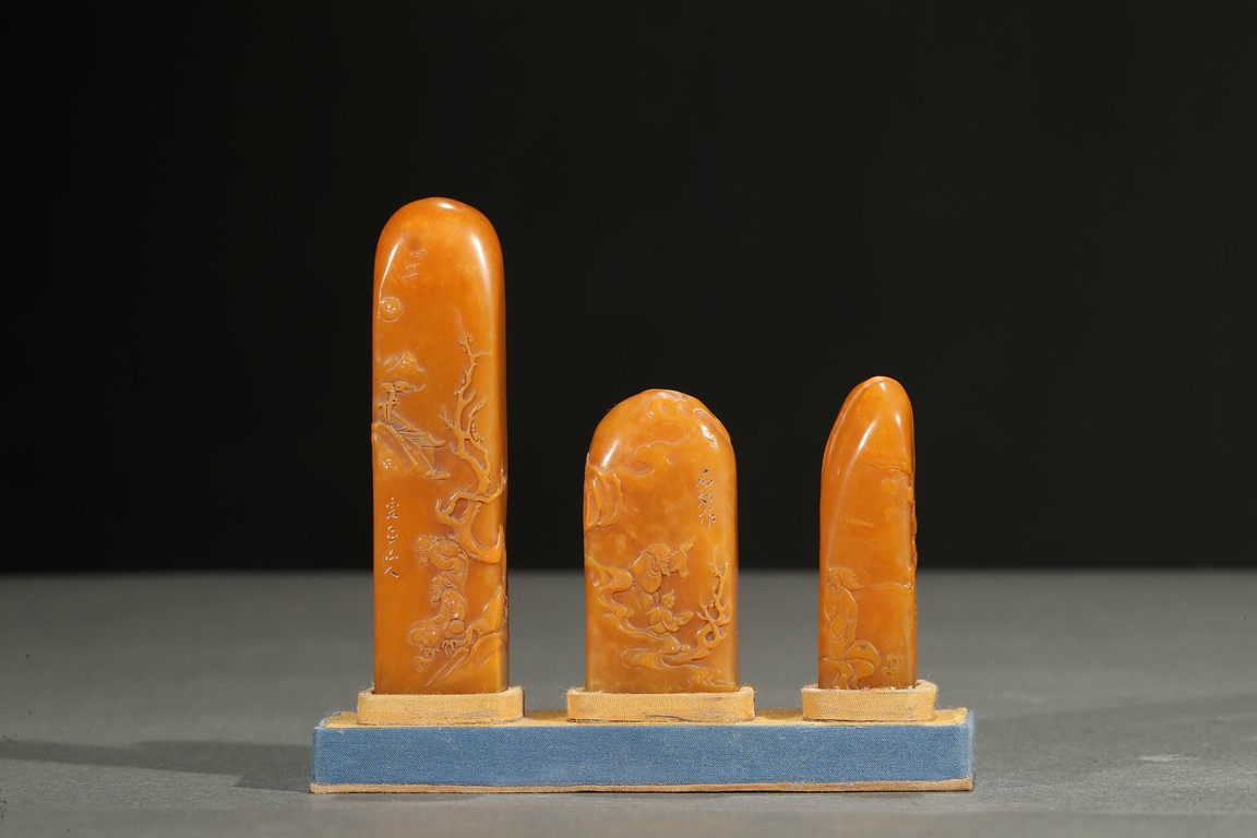 Each seal of slender rectangular form, finely carved through the shallow skin to depict figures and landscape, each carved with inscription.