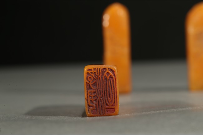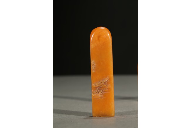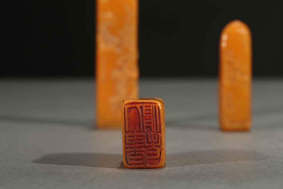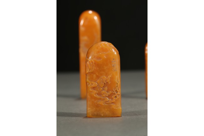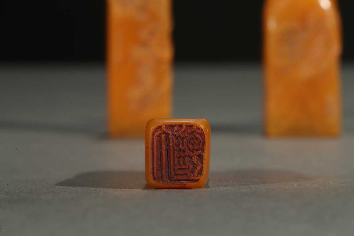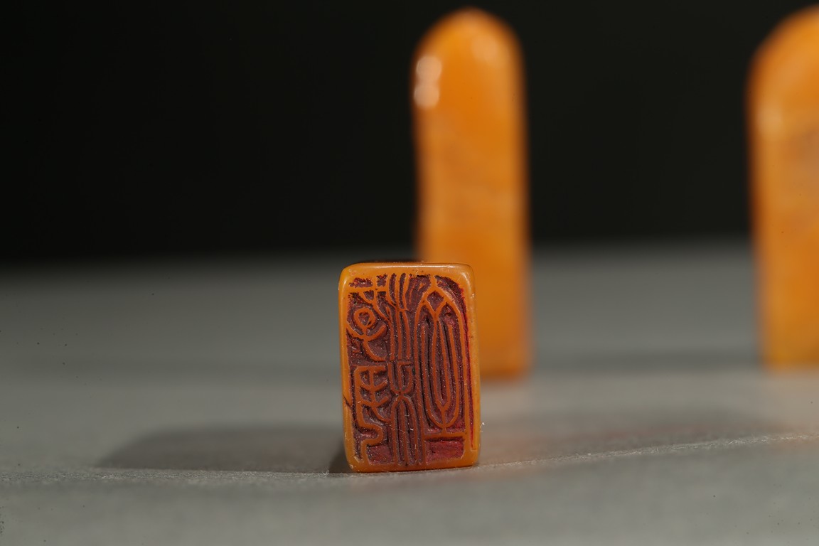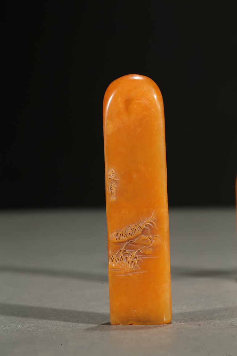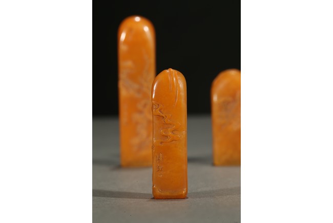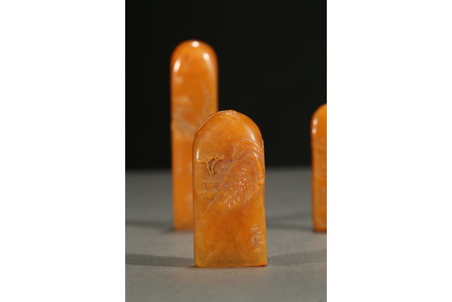 Each seal of slender rectangular form, finely carved through the shallow skin to depict figures and landscape, each carved with inscription.