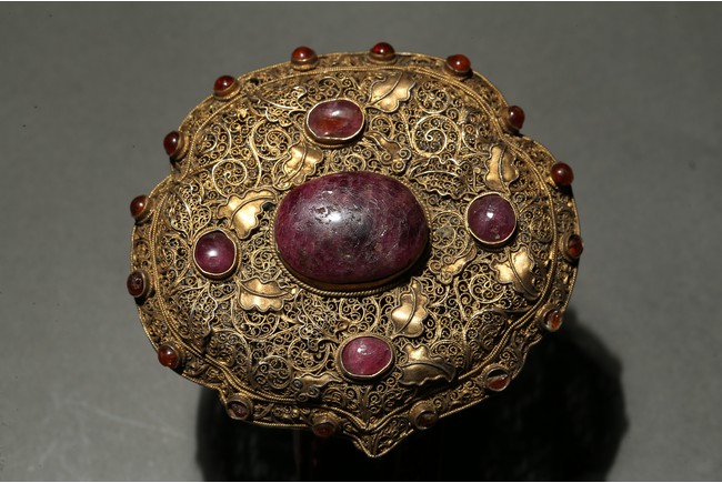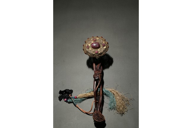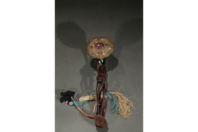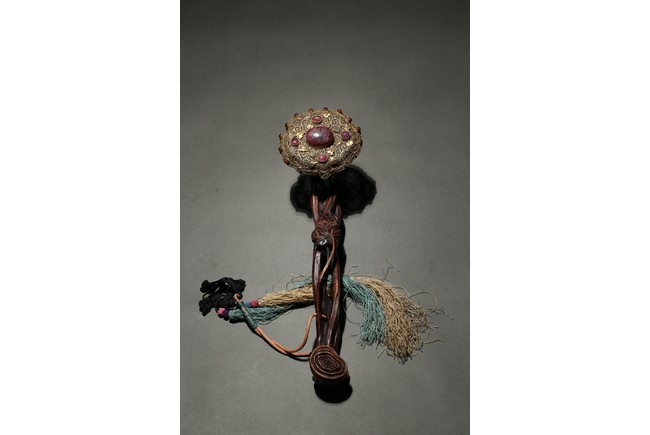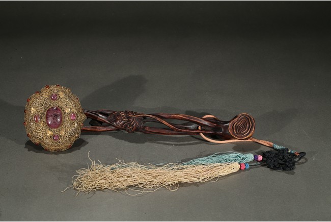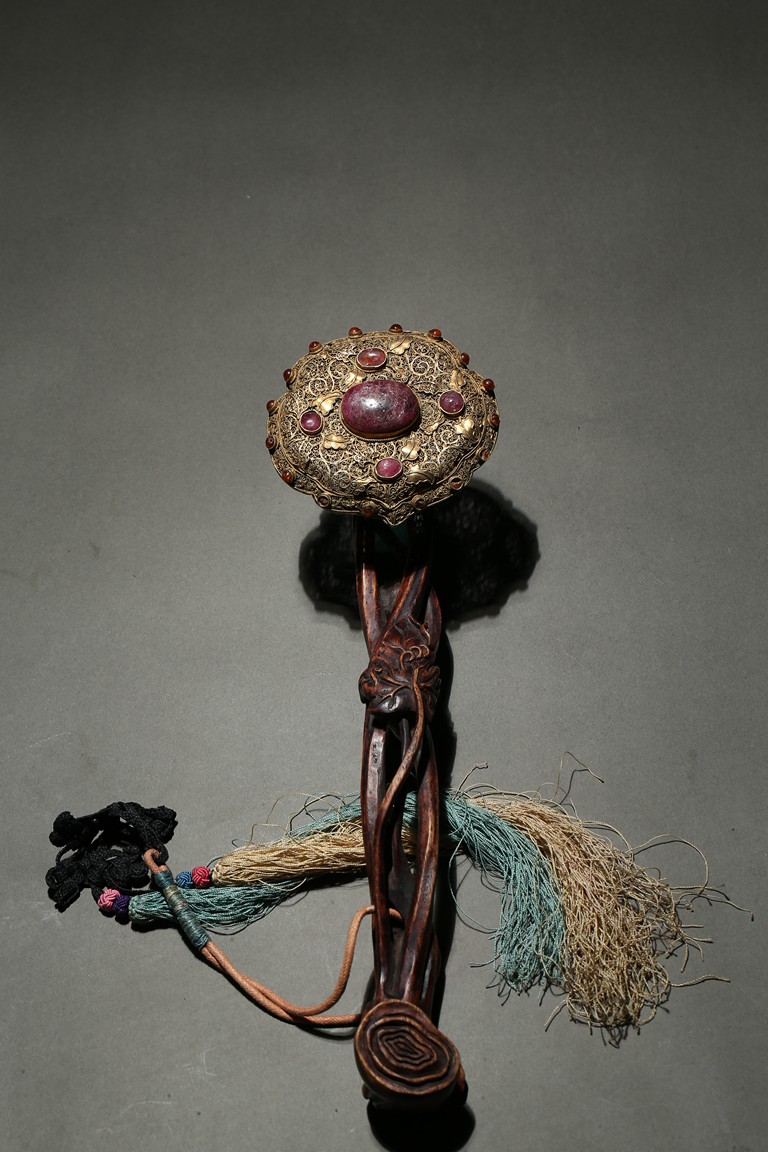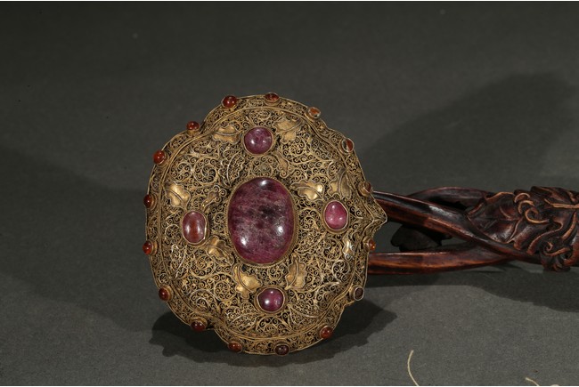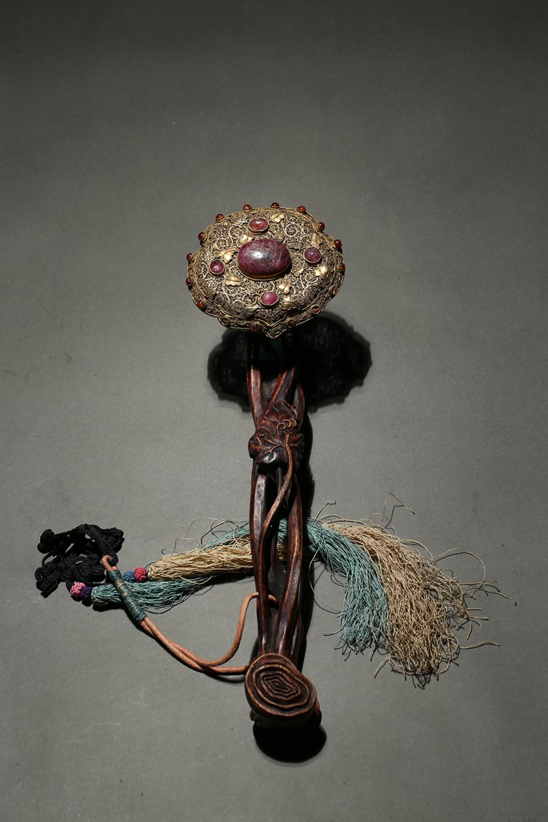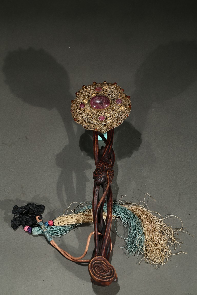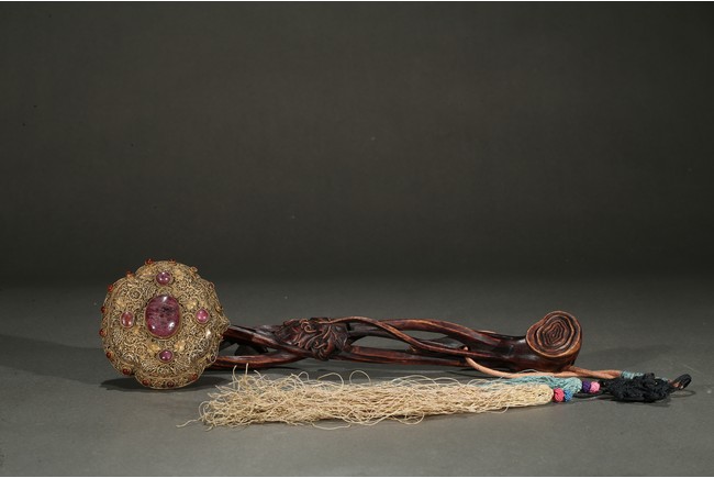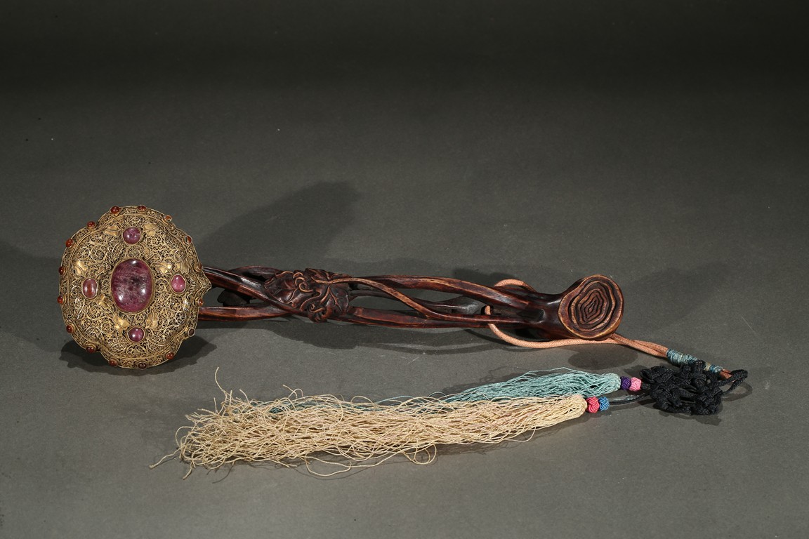 The ruyi scepter rosewood shaft reticulated in the form of lotus flower branches, the ruyi head mounted with gilt silver wire head, embellished with gems against a dense silver wire floral scrolls ground. Qing Dynasty period.