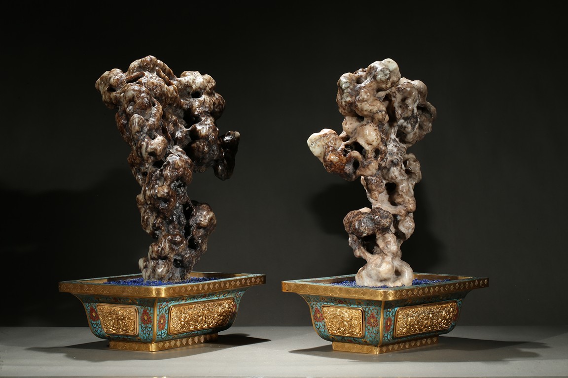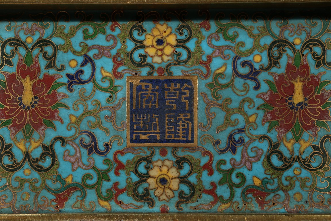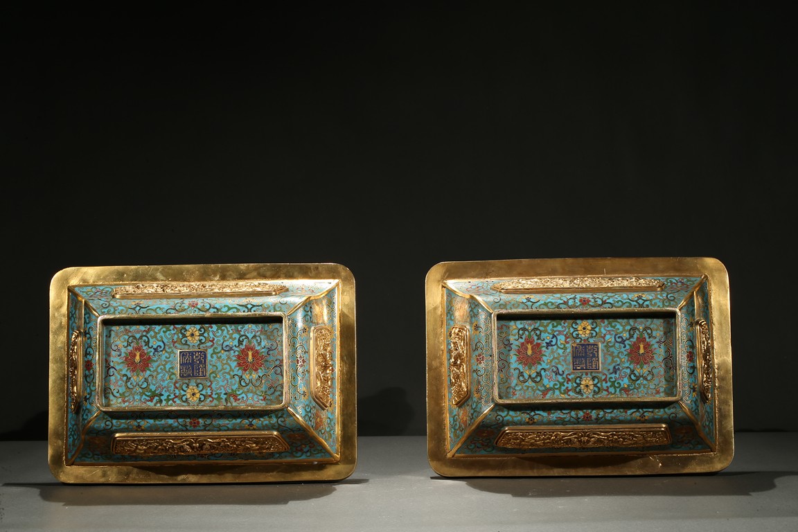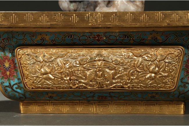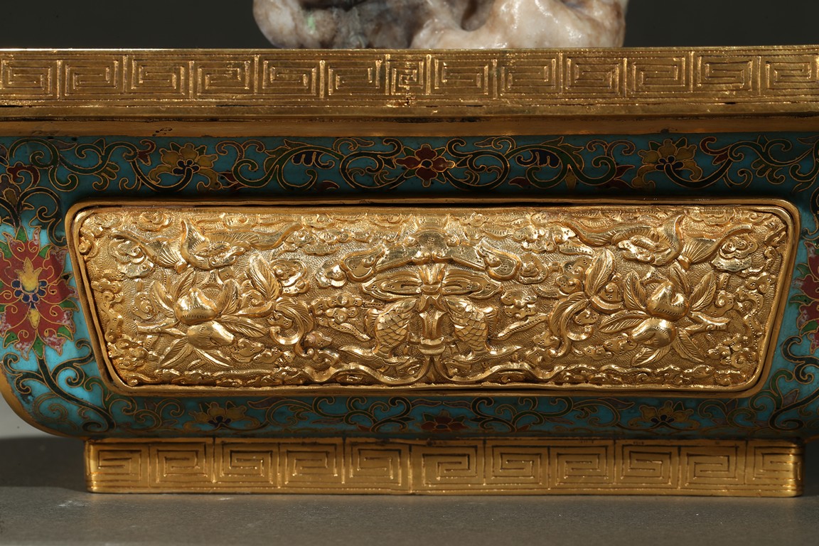 Each jardiniere is of rectangular section raised on four splayed foot, the body entirely decorated with an ornate design of floral sprays and foliate scrolls against turquoise cloisonne enamel ground, each side centered with shaped cartouche of gilt-bronze panel with auspicious design; the grey jade modelled in the form of scholar' rock with ridges and jagged protrusions, the base with four character QIANLONG mark.