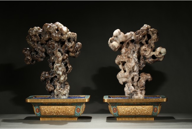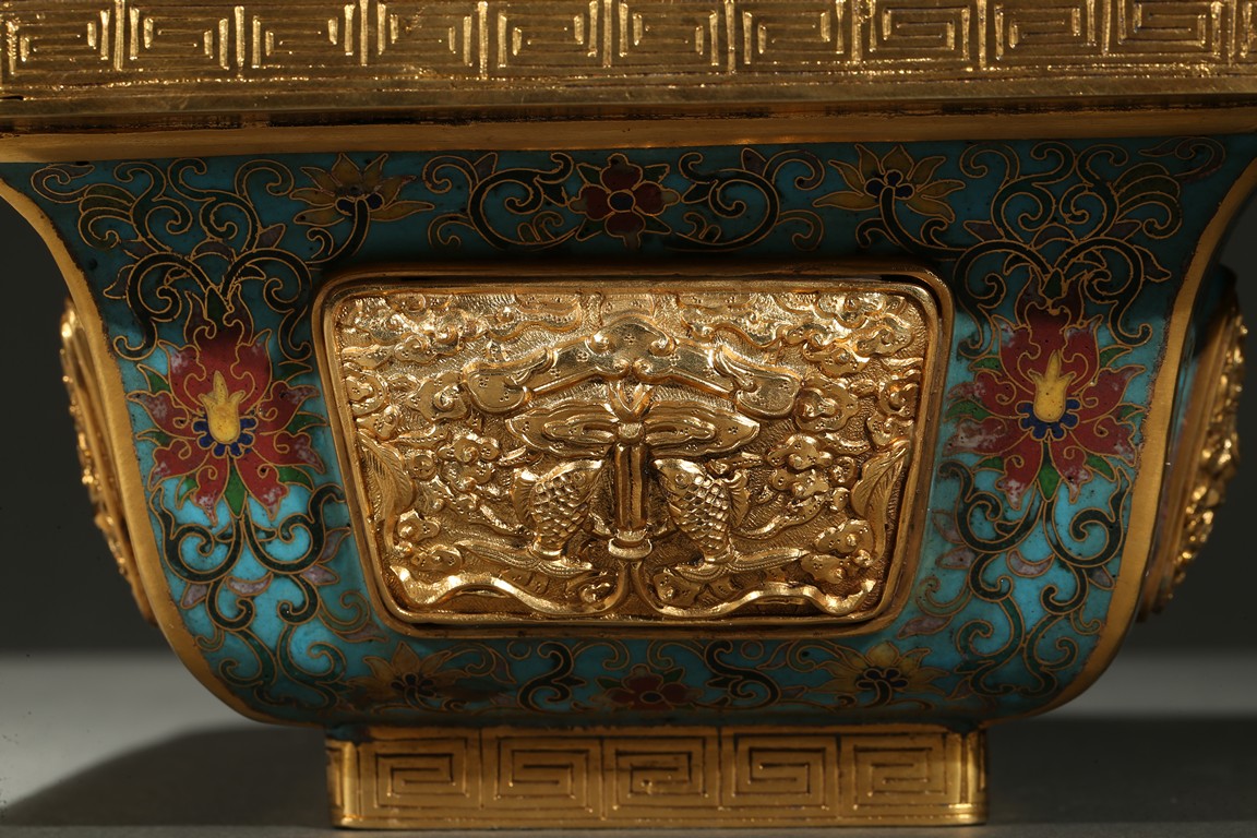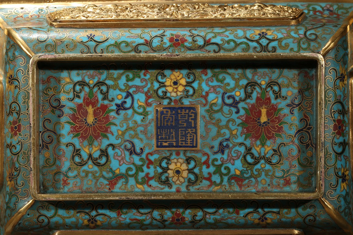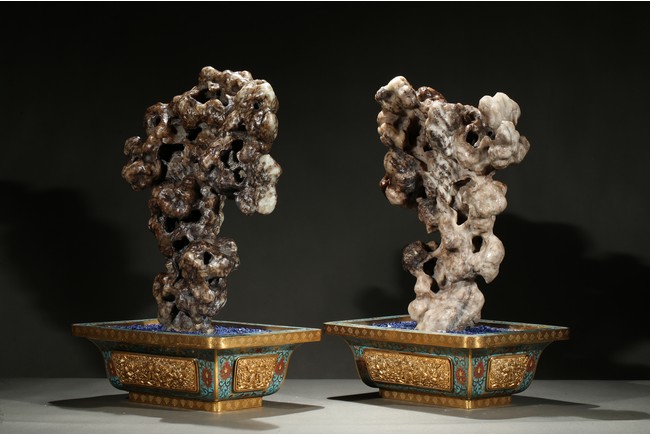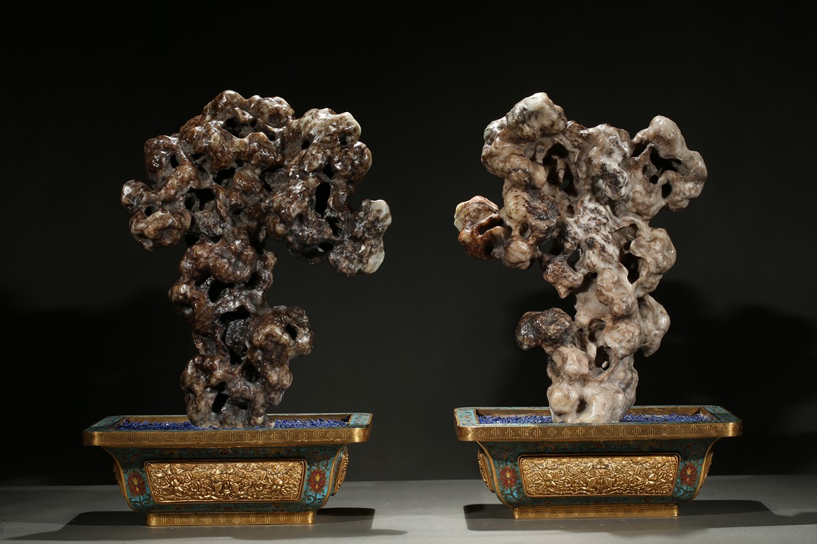 Each jardiniere is of rectangular section raised on four splayed foot, the body entirely decorated with an ornate design of floral sprays and foliate scrolls against turquoise cloisonne enamel ground, each side centered with shaped cartouche of gilt-bronze panel with auspicious design; the grey jade modelled in the form of scholar' rock with ridges and jagged protrusions, the base with four character QIANLONG mark.
