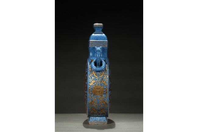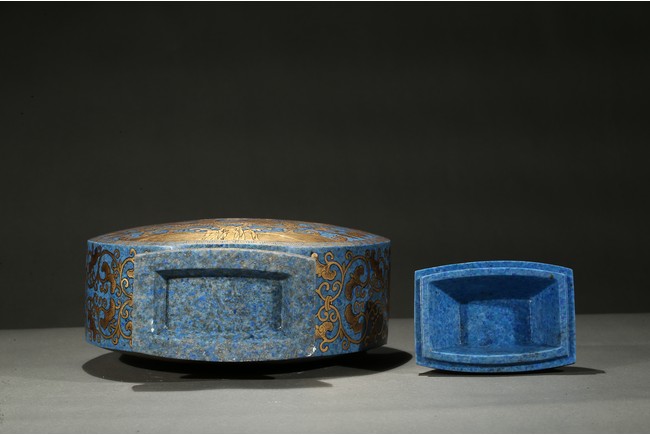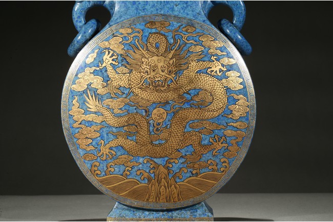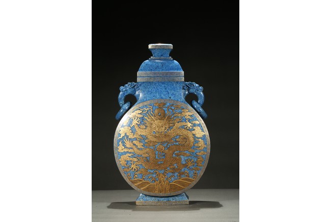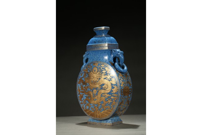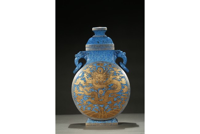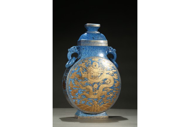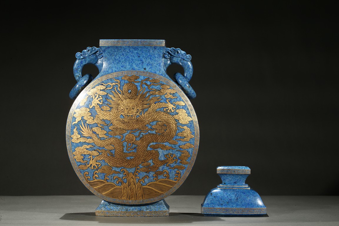 The lapis lazuli vase is off flattened globular form with splayed feet, superbly painted in gilt on each side with a five-clawed dragon writhing sinuously with scaly body around a 'flaming pearl', the beast rendered with piercing eyes framed by thick brows, against background with lingzhi cloud swirls above turbulent crashing waves, the side decorated with scrolled leafy lotus flowers.