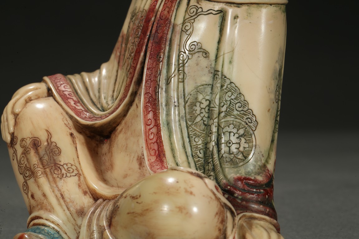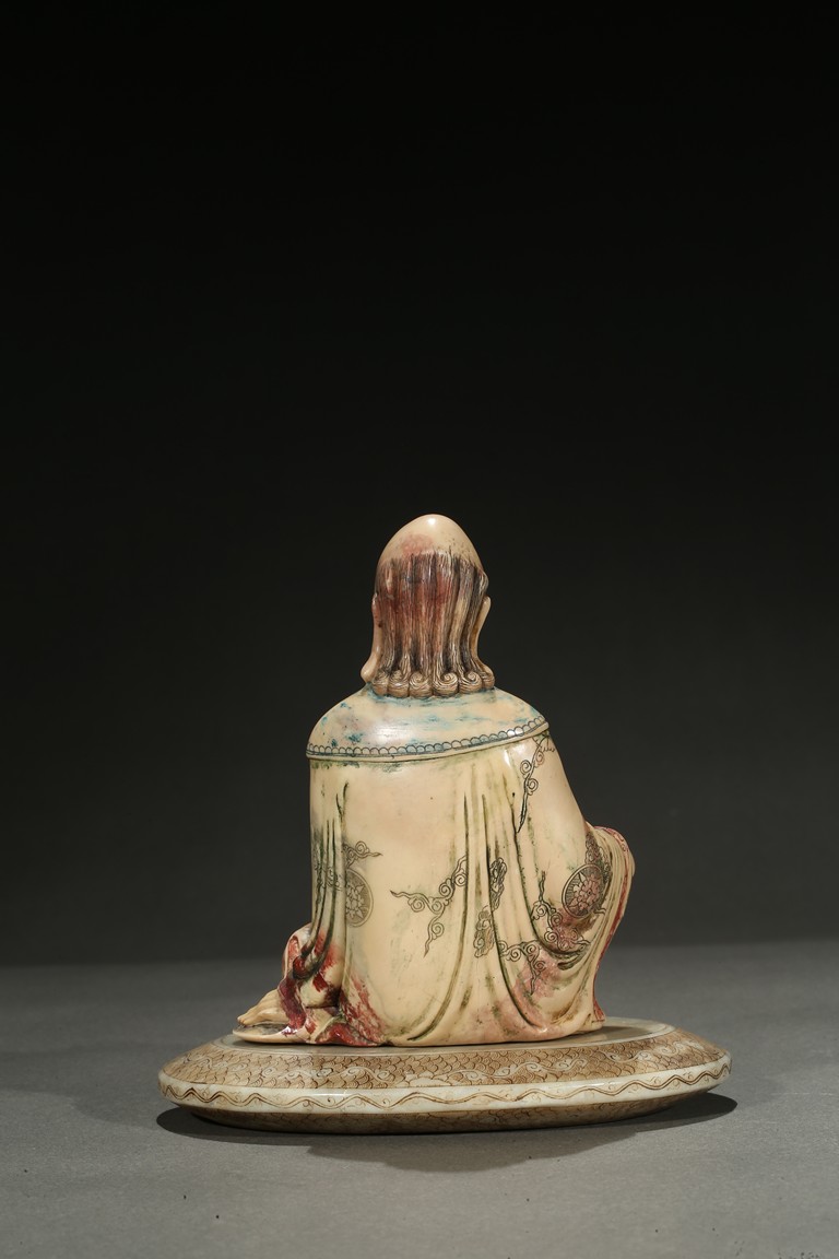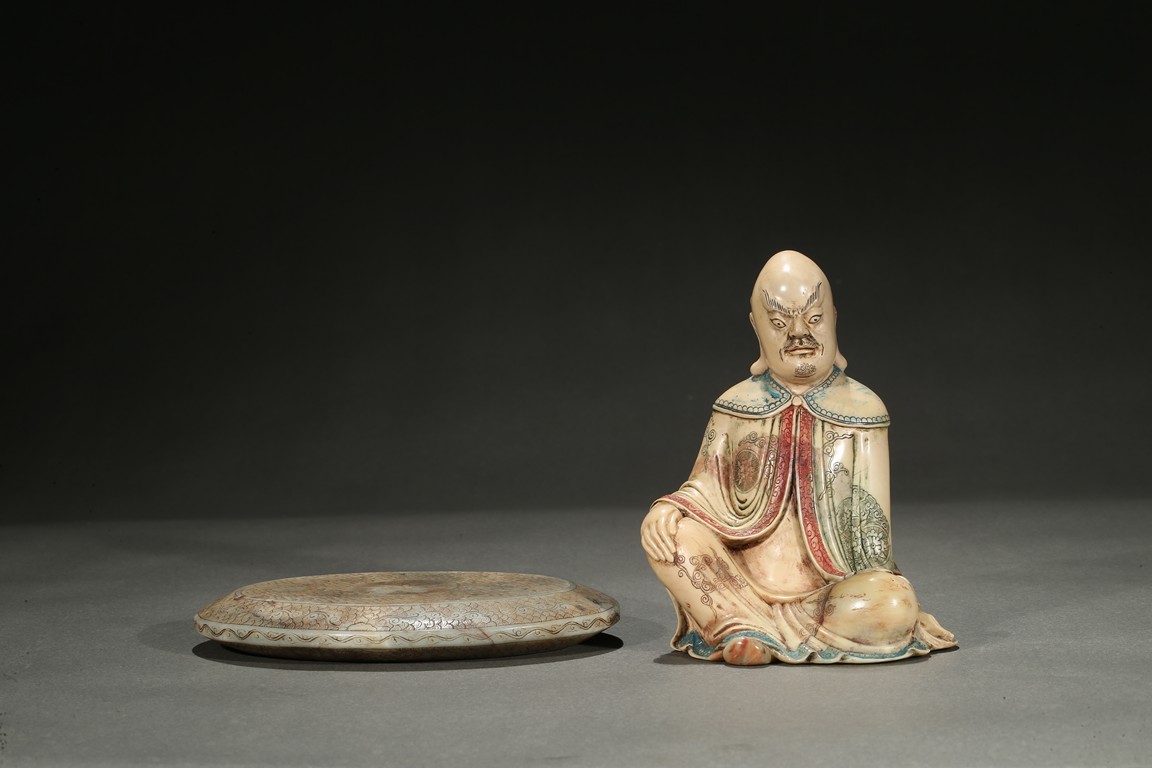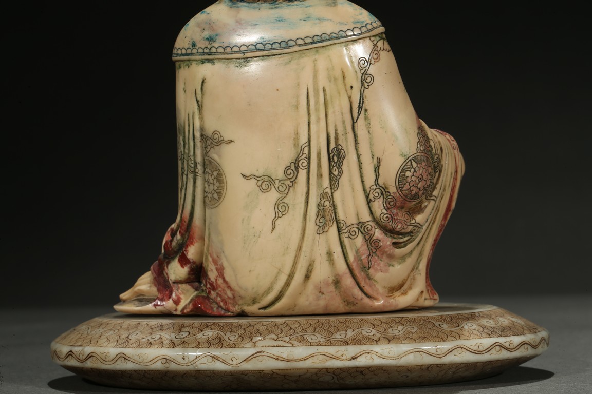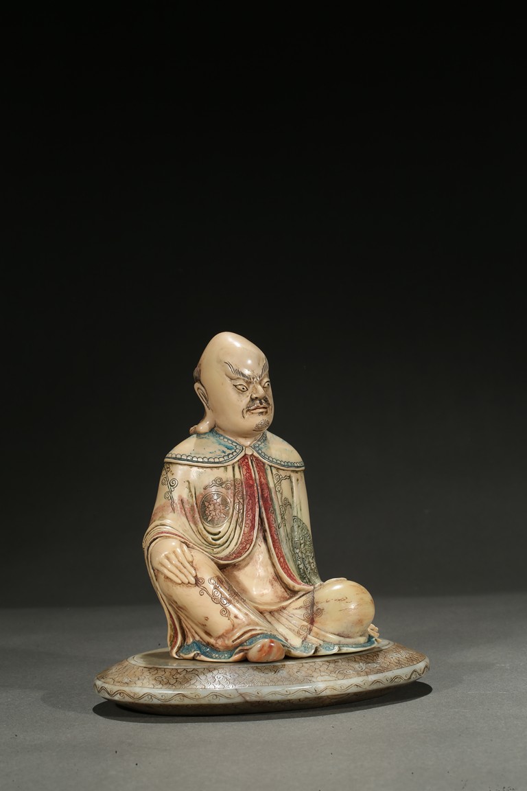 The figure carved seated with right knee raised where his right hand rested upon, wearing an elaborate robe finely incised with scrolled floral design, the face showing a stern expression with raised eyebrow, body with traces of pigments, further supported on a flattened disc-shaped soapstone stand. Late Qing Dynasty period.