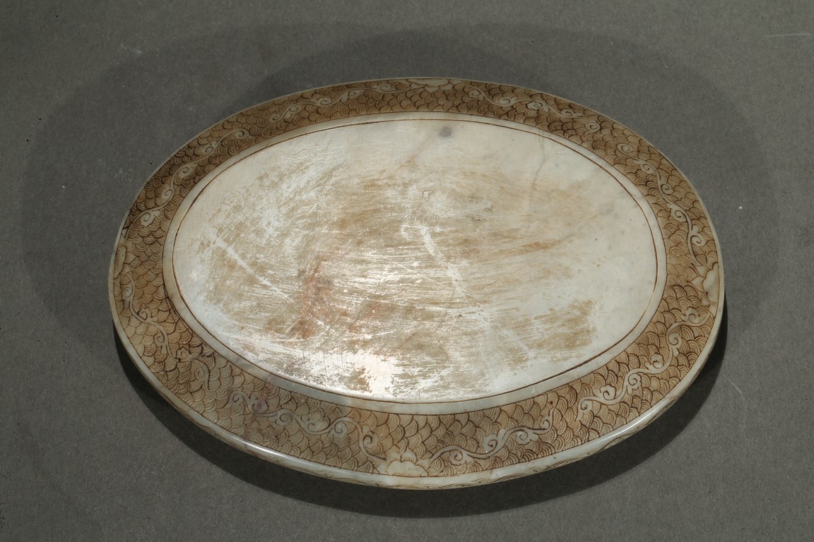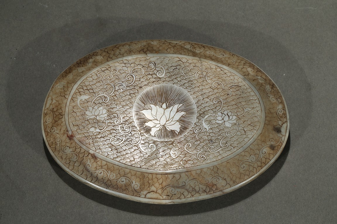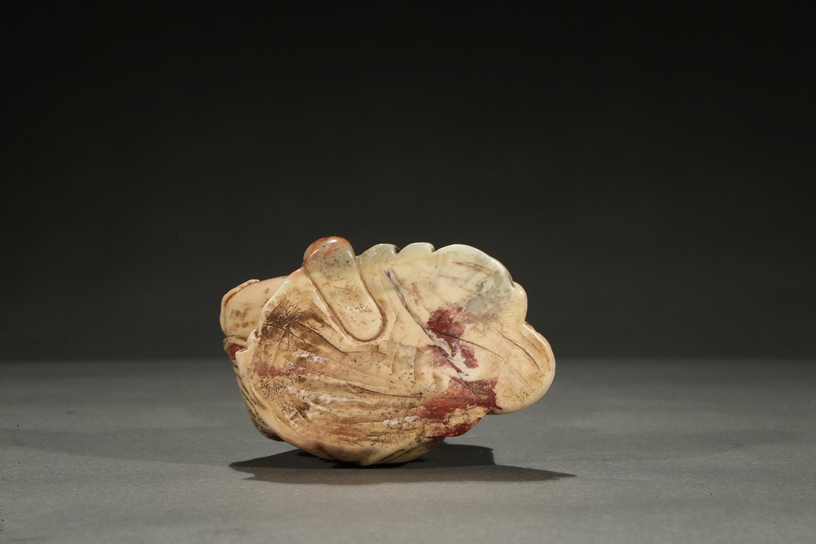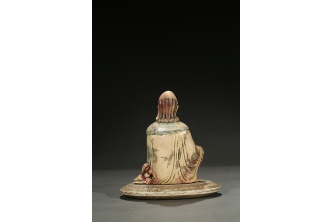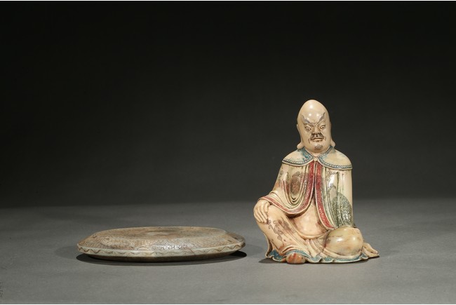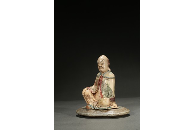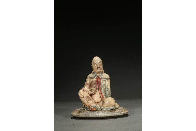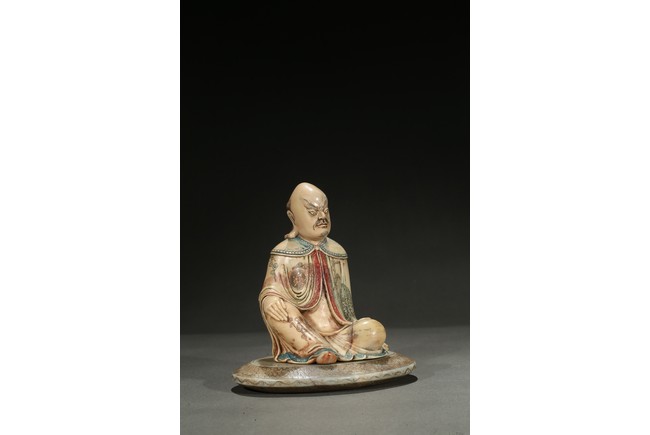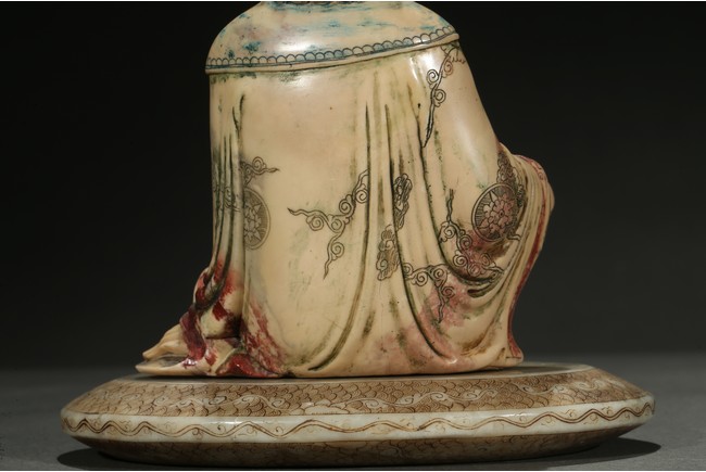 The figure carved seated with right knee raised where his right hand rested upon, wearing an elaborate robe finely incised with scrolled floral design, the face showing a stern expression with raised eyebrow, body with traces of pigments, further supported on a flattened disc-shaped soapstone stand. Late Qing Dynasty period.