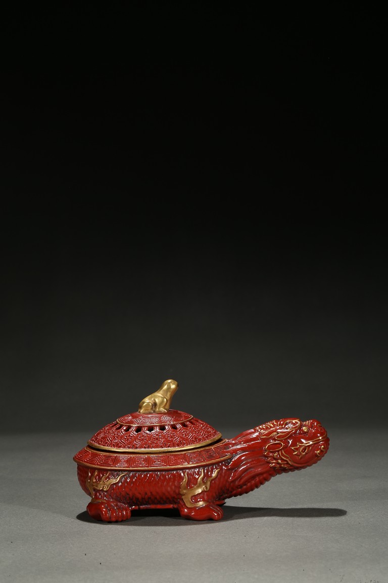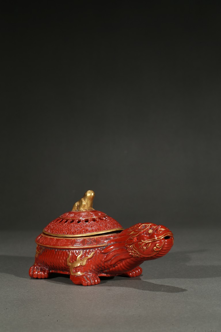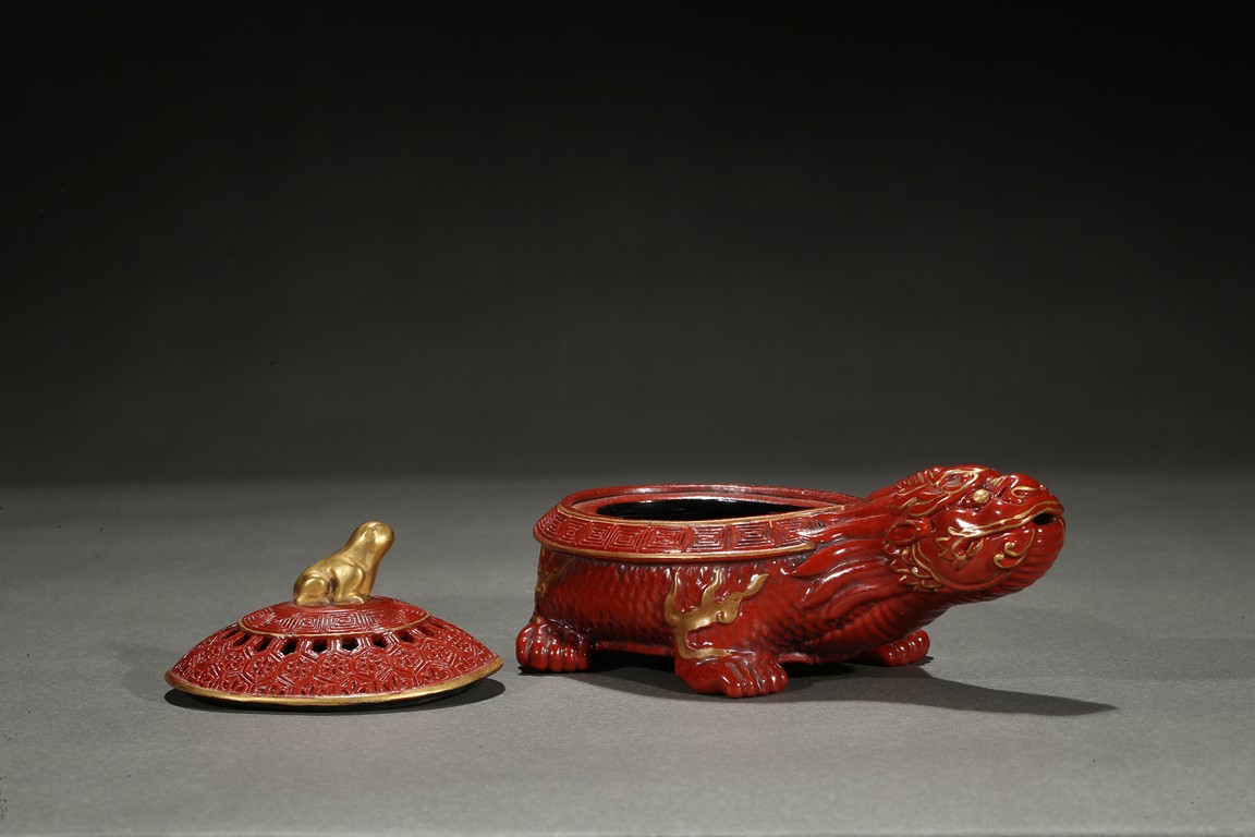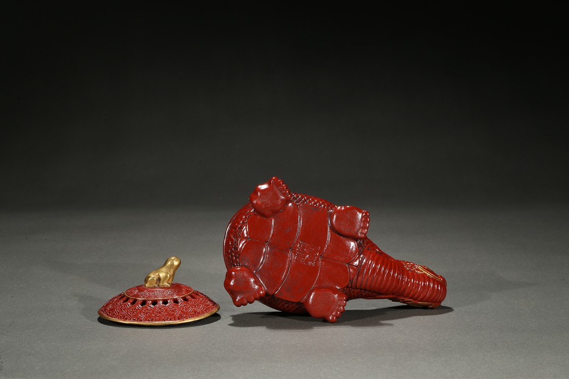 Modelled in the form of a mythical turtle with gilt-painted flame-like wings and scales on the body, the head resembles that of a dragon, the back shell as the lid and surmounted with a gilt-painted mythical beast as finial, the base with four character QIANLONG mark.