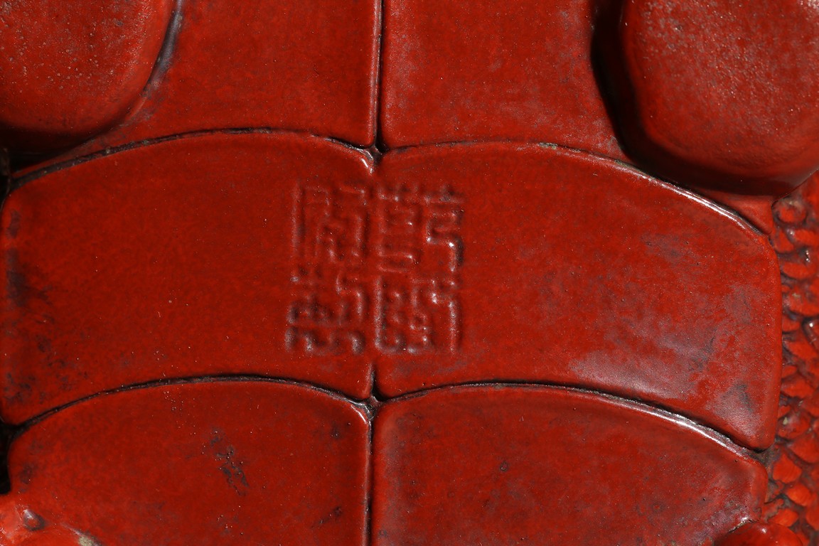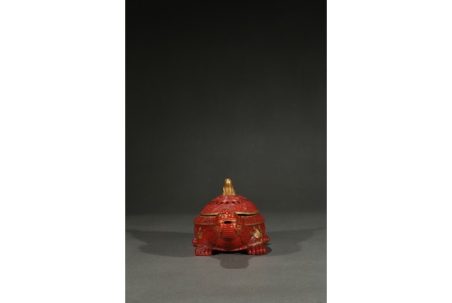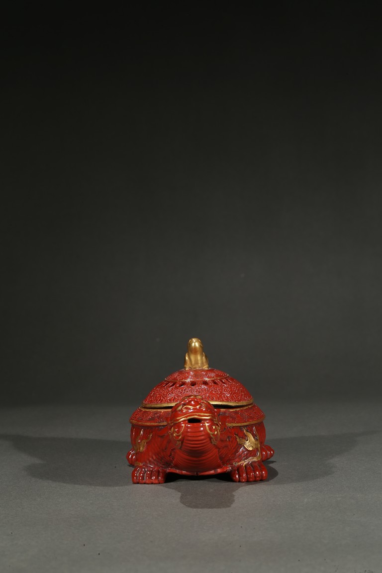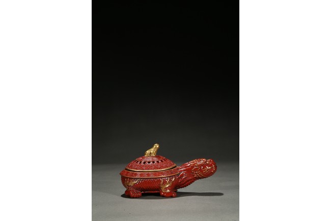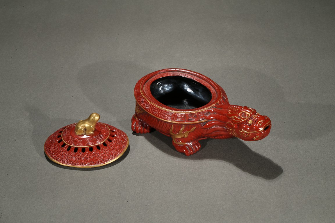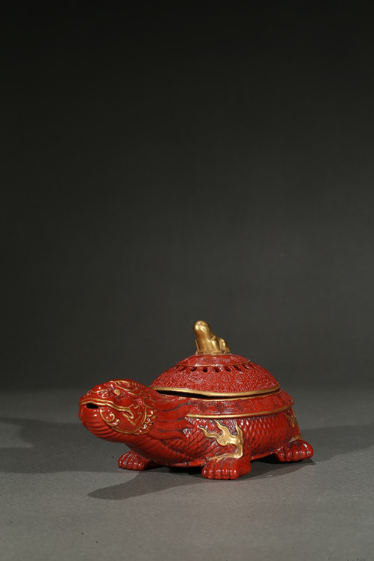 Modelled in the form of a mythical turtle with gilt-painted flame-like wings and scales on the body, the head resembles that of a dragon, the back shell as the lid and surmounted with a gilt-painted mythical beast as finial, the base with four character QIANLONG mark.