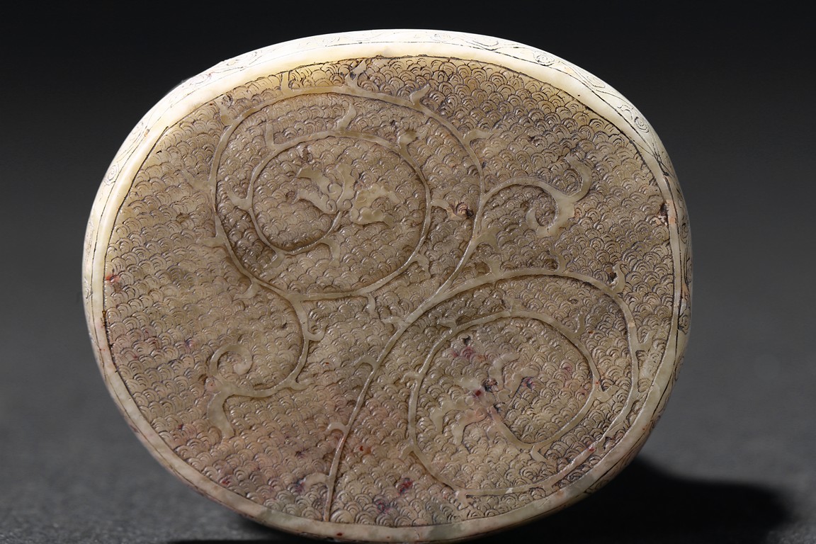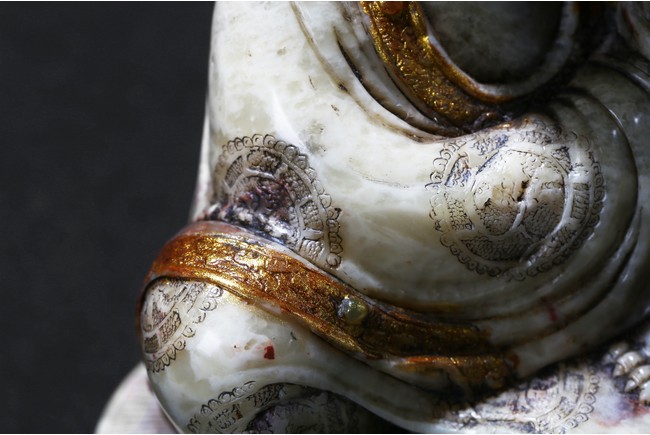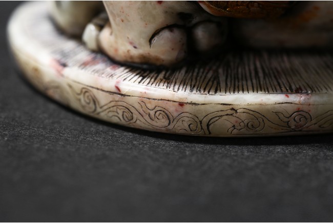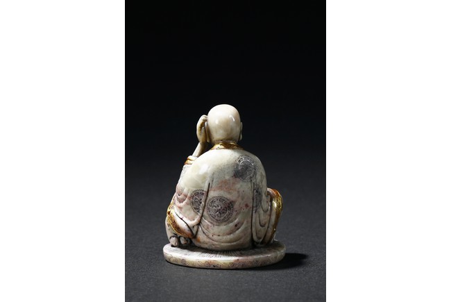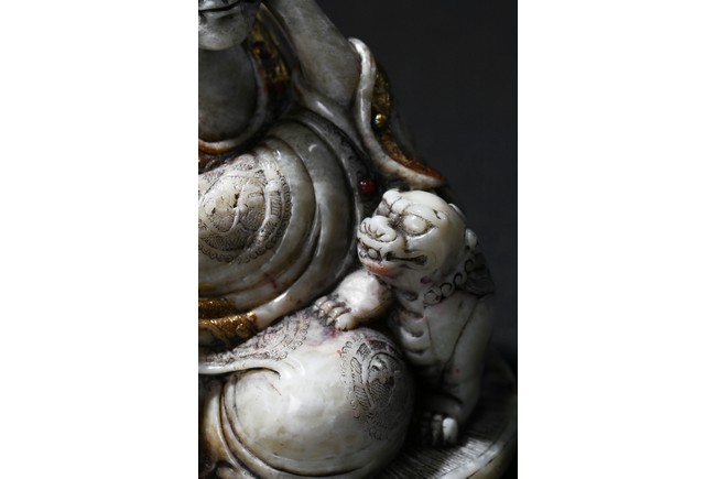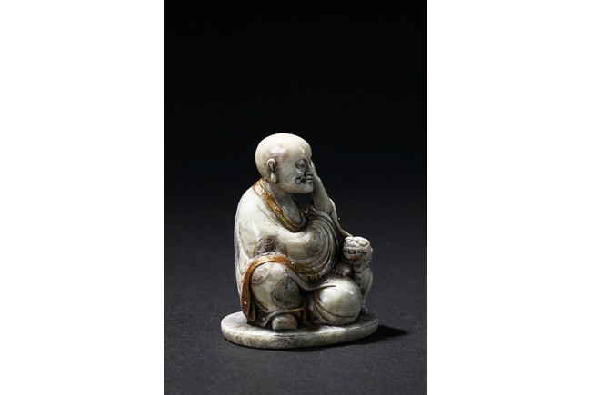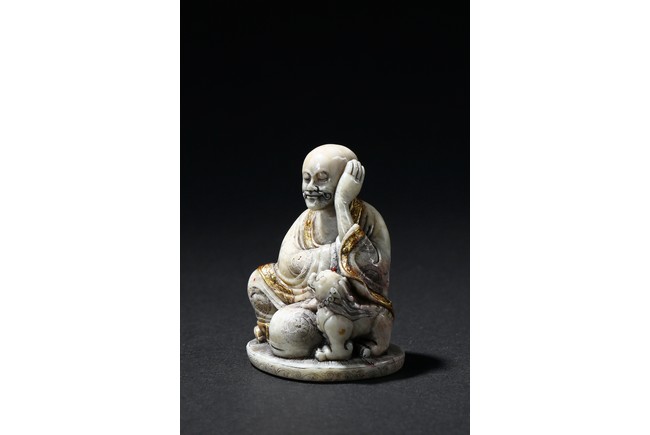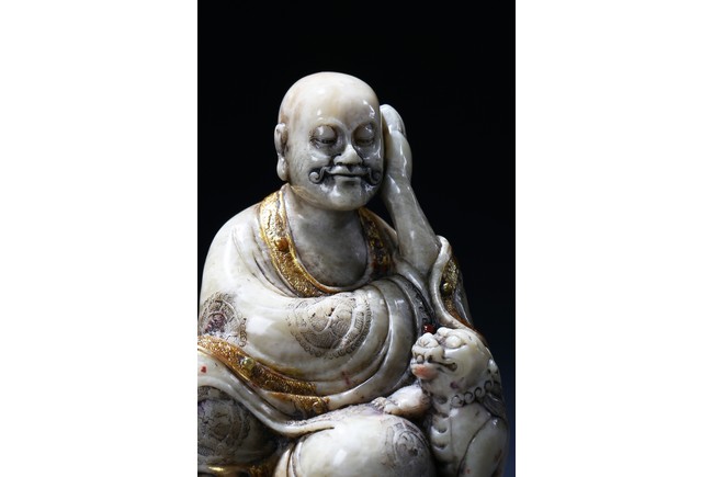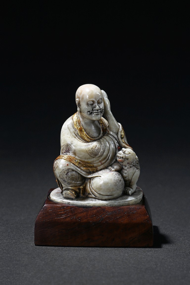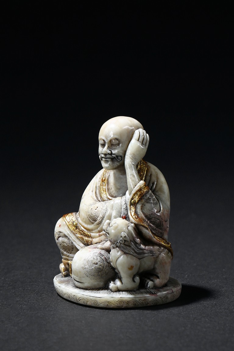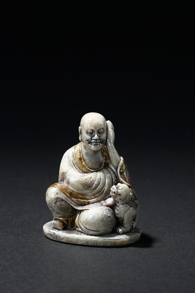 The luohan is shown seated watching over his buddhist lion cub to his left, his left hand supporting his head, wearing a voluminous robe with hem painted in gilt and incised with decorative pattern, face with gentle smile. The stone is of opaque white tone. Republic period.