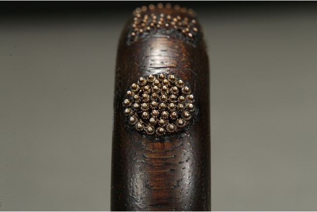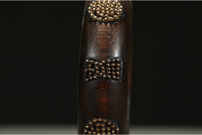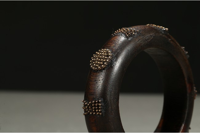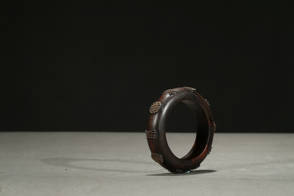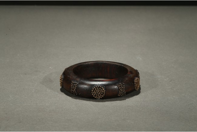 The aromatic agarwood bangle is finely inlaid in tiny gold beads to form stylized character and auspicious symbols. Qing Dynasty period.
