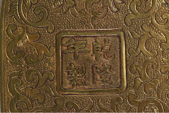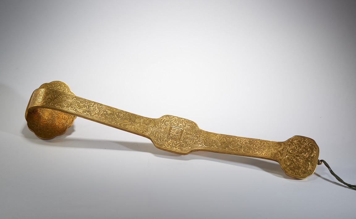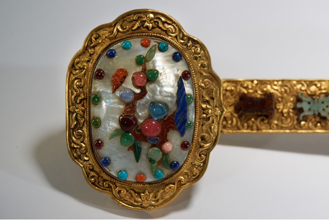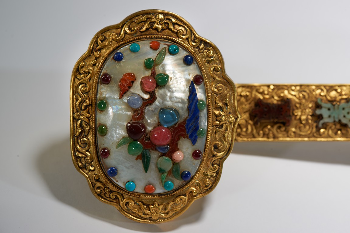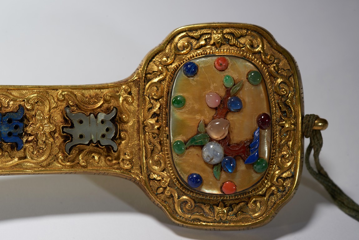 The head, center section, and tip inset with mother-of-pearl plaques, all inlaid with various jades and semi-precious gems including turquoise, jadeite, agate, lapis lazuli with scenes incorporating peach trees and auspicious bats, the shaft inlaid with stylized shou characters inlaid with similar gems against raised lotus floral scroll ground. Qing Dynasty period.