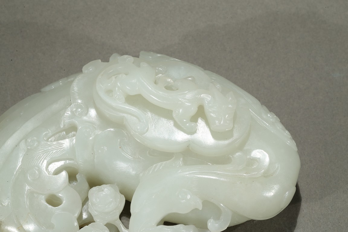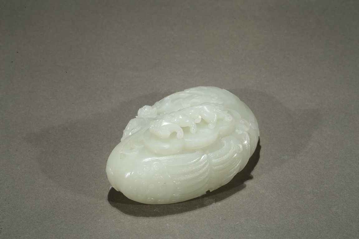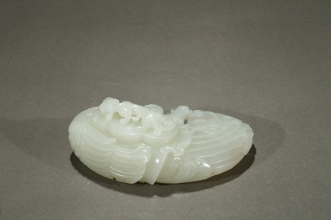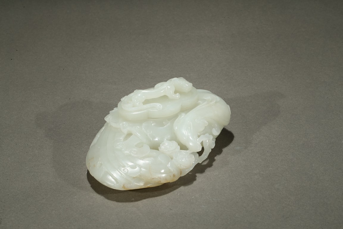 Finely carved in flattened form of a large phoenix with curled body forming the washer, its head finely incised with details with mouth grabbing a peony sprig, the lobed cover surmounted with a high relief sinuous Chilong, the stone is of even smooth white tone with very minor russet inclusions. Qing Dynasty period.