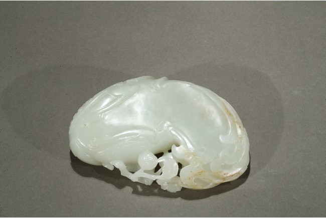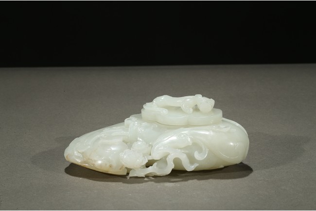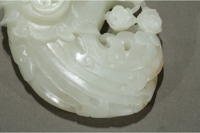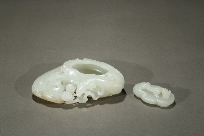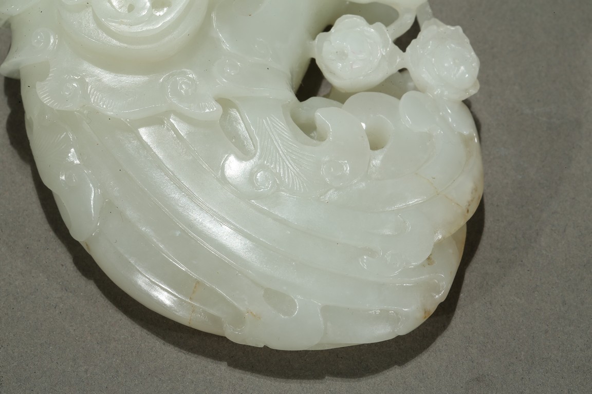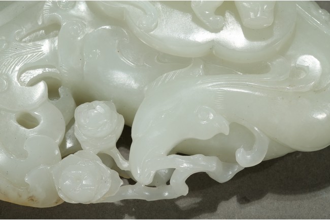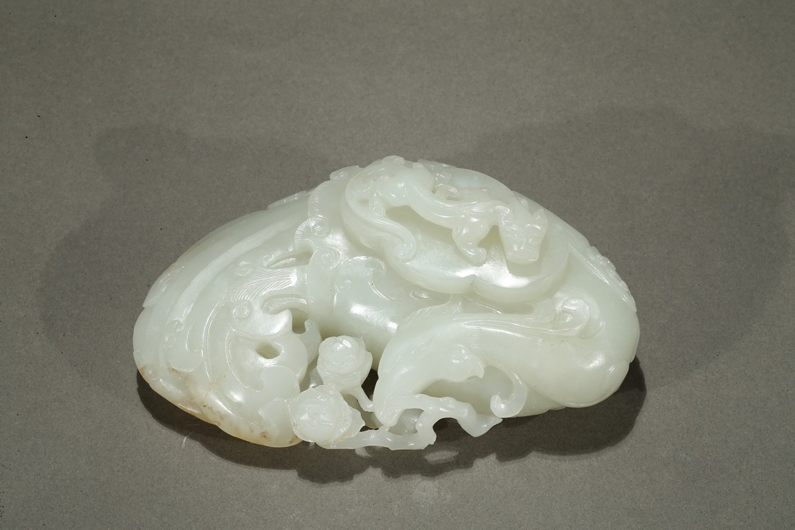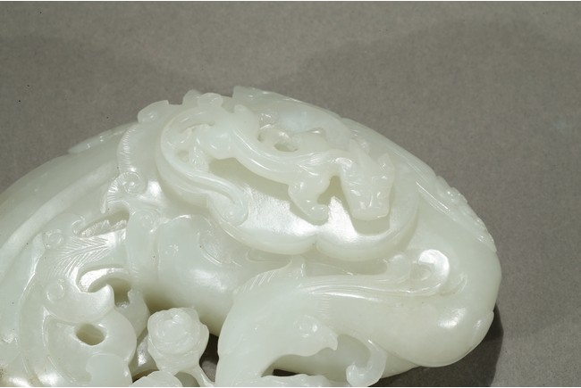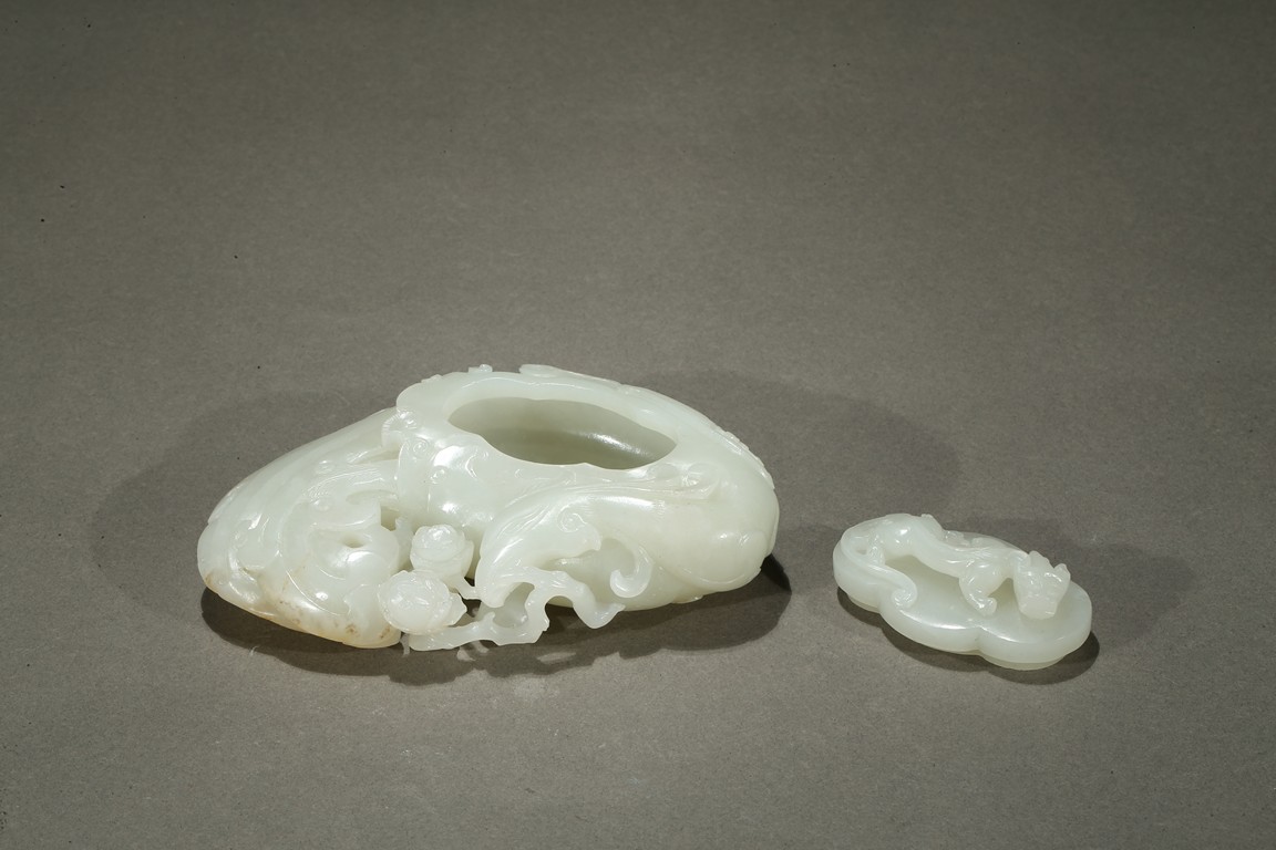 Finely carved in flattened form of a large phoenix with curled body forming the washer, its head finely incised with details with mouth grabbing a peony sprig, the lobed cover surmounted with a high relief sinuous Chilong, the stone is of even smooth white tone with very minor russet inclusions. Qing Dynasty period.