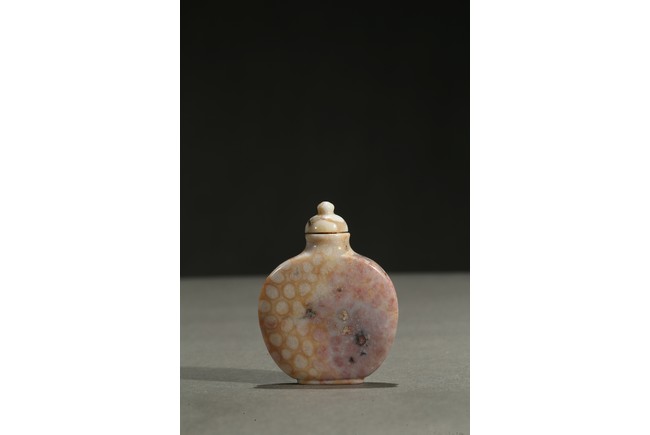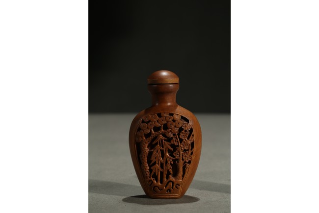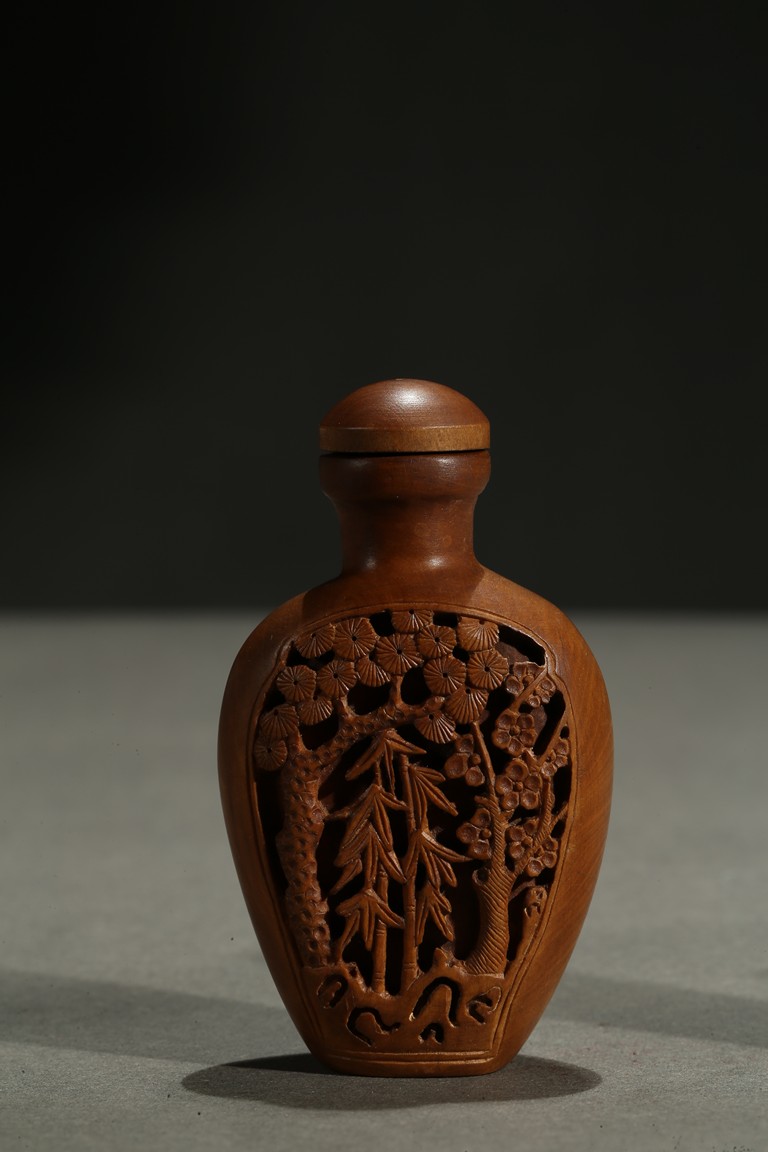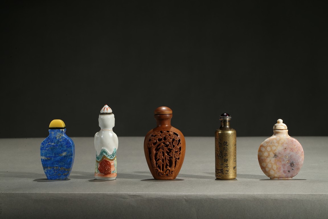 Comprising of a bronze 'figure' snuff bottle; a wood carved 'shoulao' snuff bottle; an agate snuff bottle; a ceramic 'figure' snuff bottle; and a lapis lazuli snuff bottle.