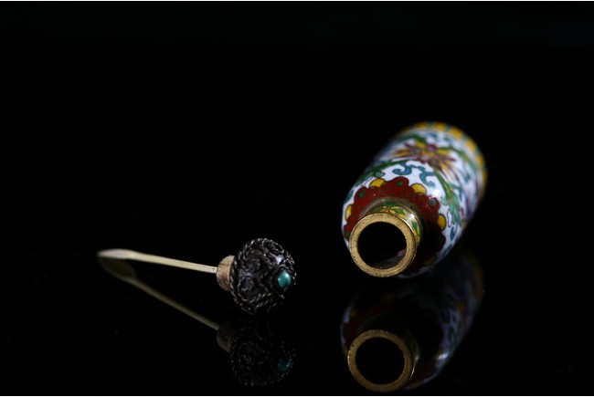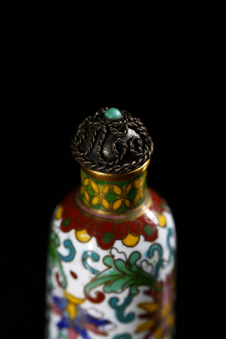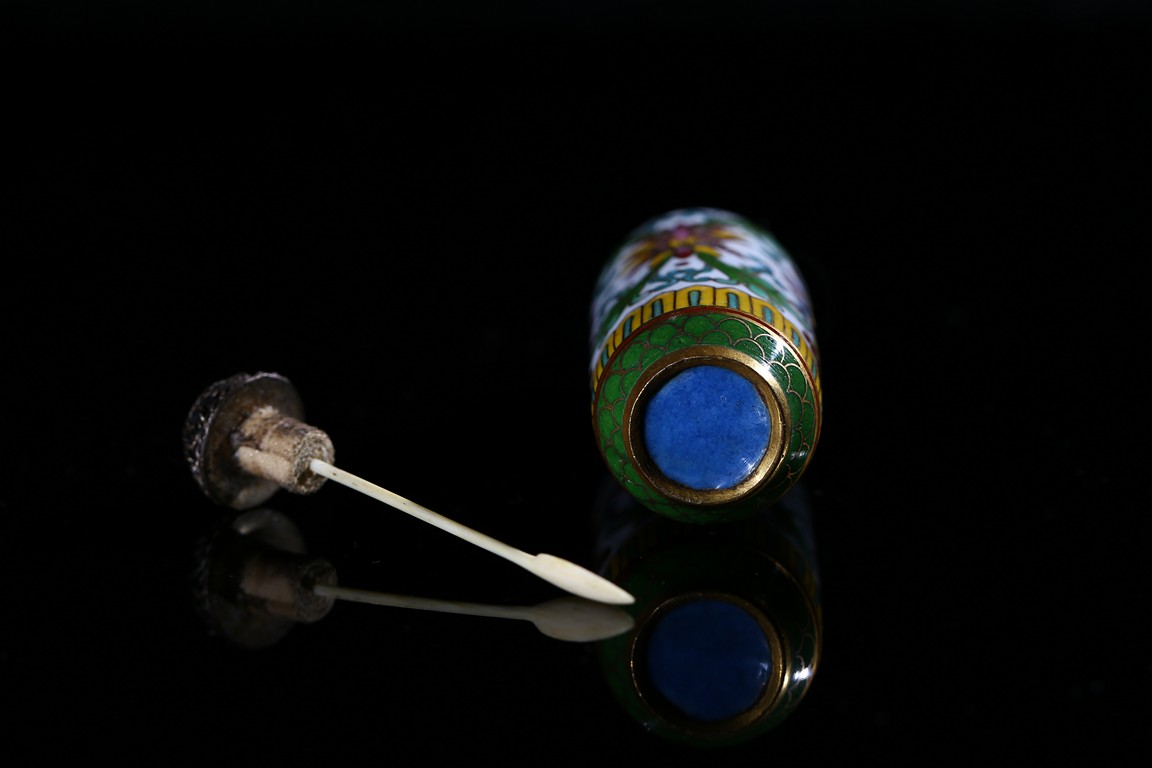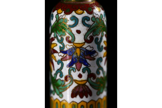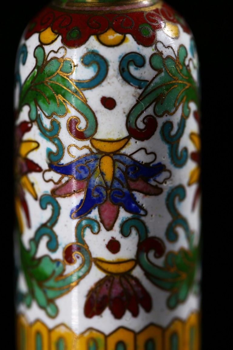 Of cylindrical shape, the exterior enamelled with lotus scroll pattern against white ground. Qing Dynasty period.