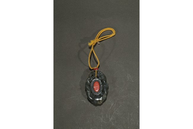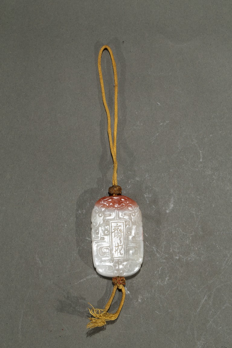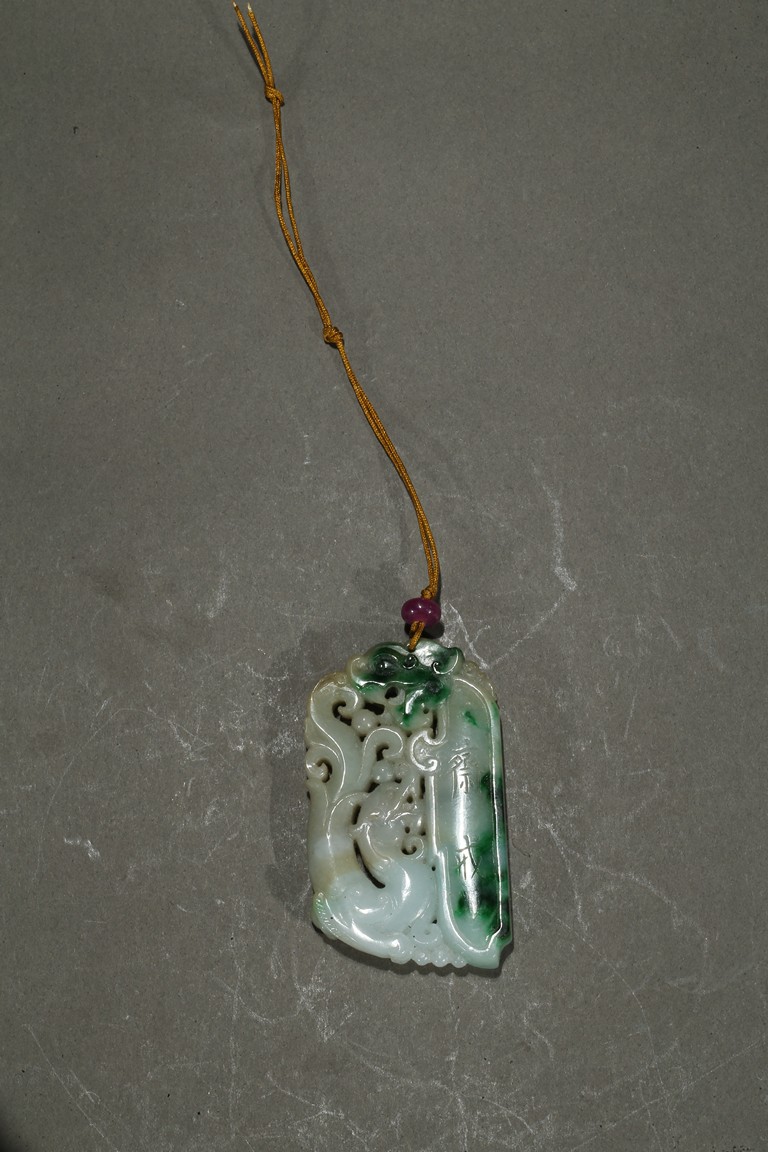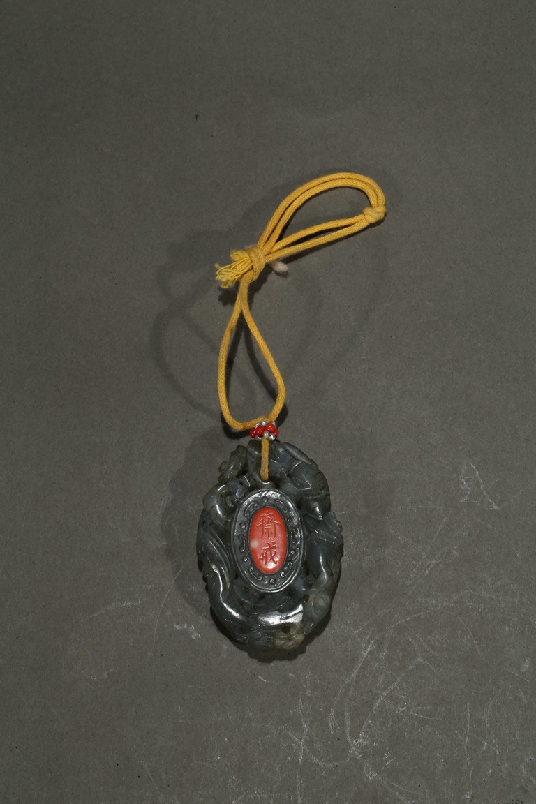 GROUP OF JADEITE, AGATE, CORAL, MOTHER OF PEARL PENDANTS 清 翡翠,瑪瑙,螺鈿,珊瑚四式齋戒牌一組