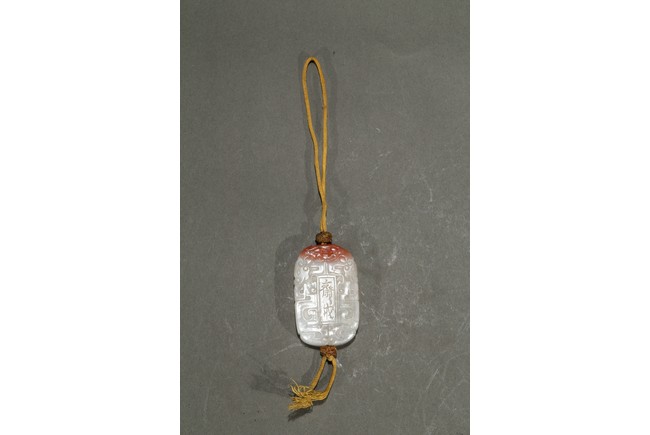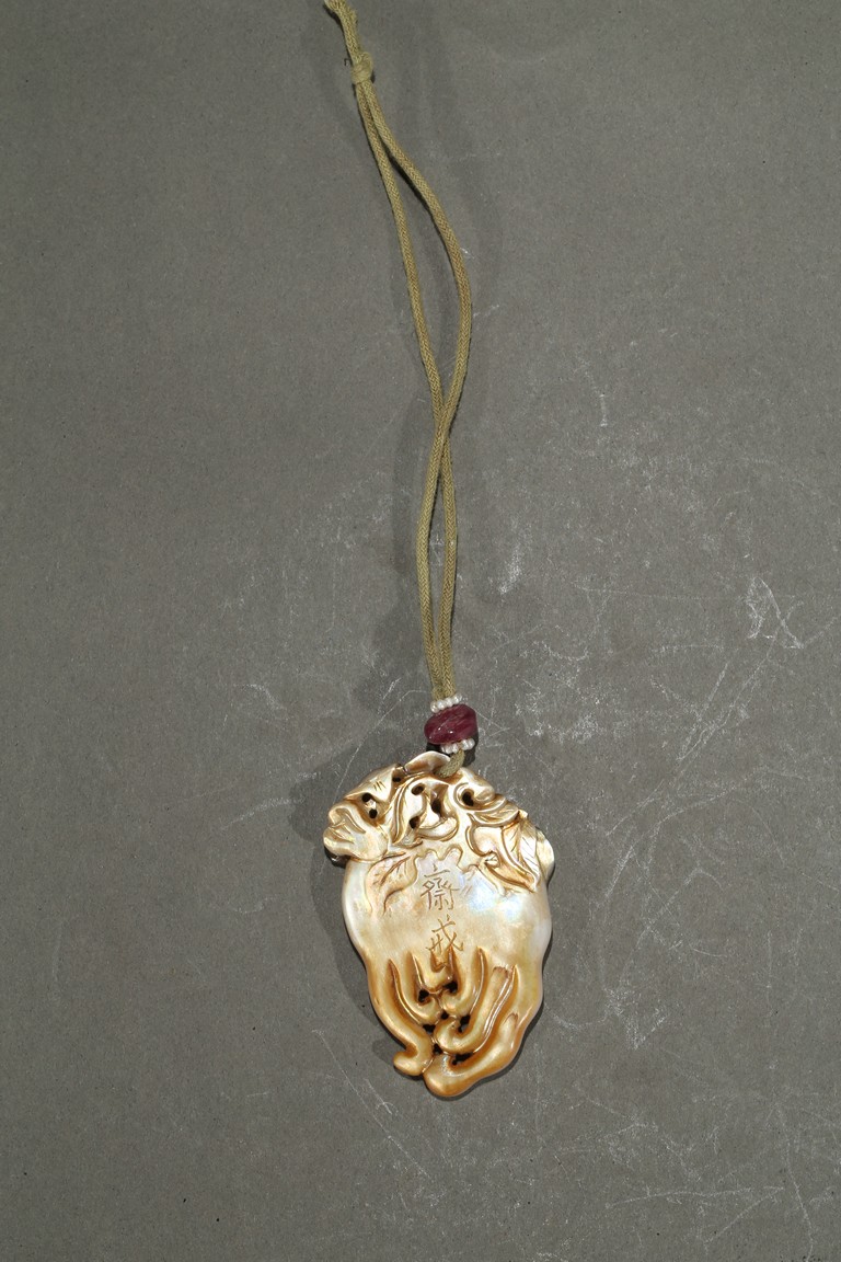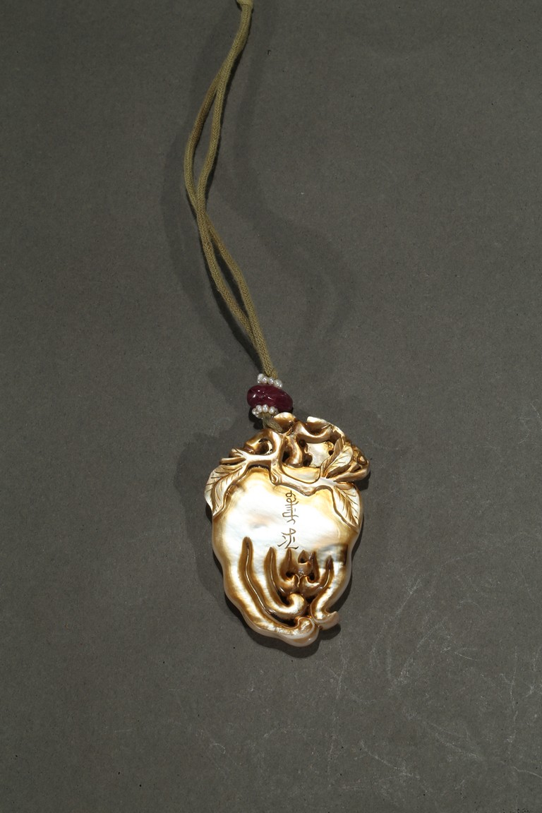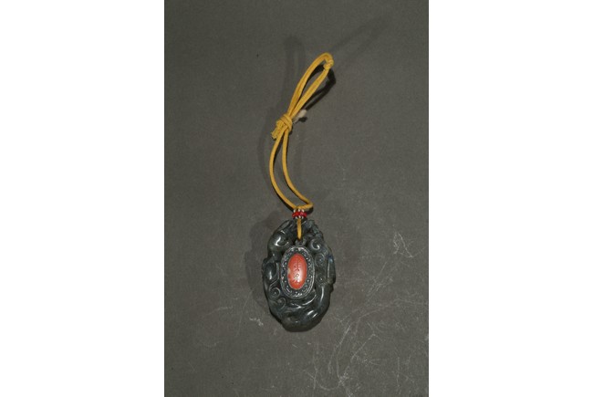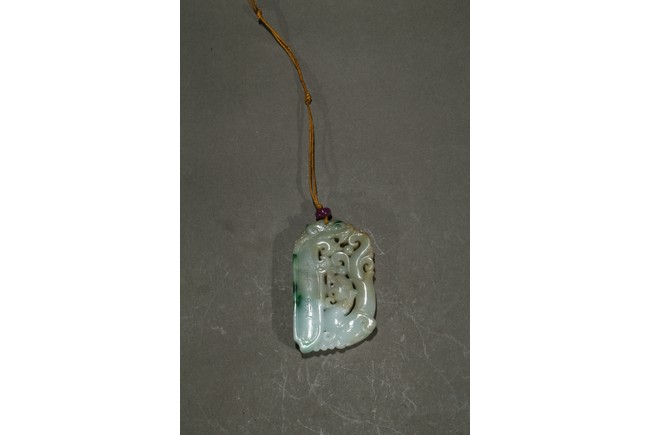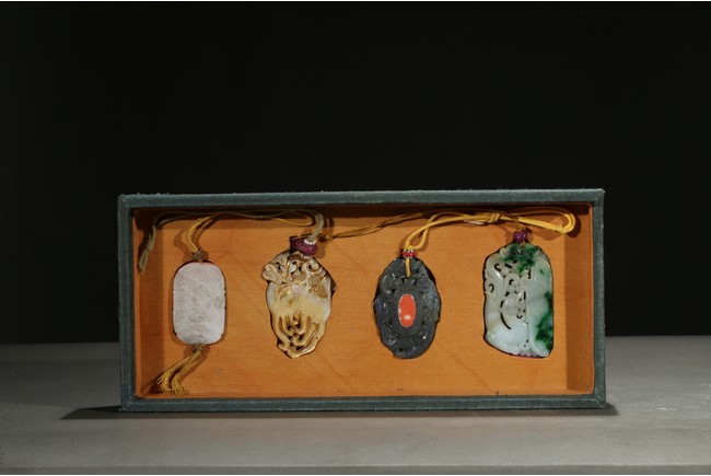 Consisting of four various zhaijie pendants, including an openwork jadeite pendant; a black jade and coral pendant; a mother-of-pearl pendant; a white and red agate pendant, all fitted on a box. Qing Dynasty period.