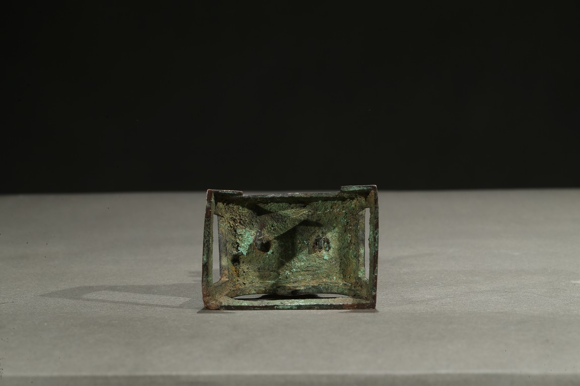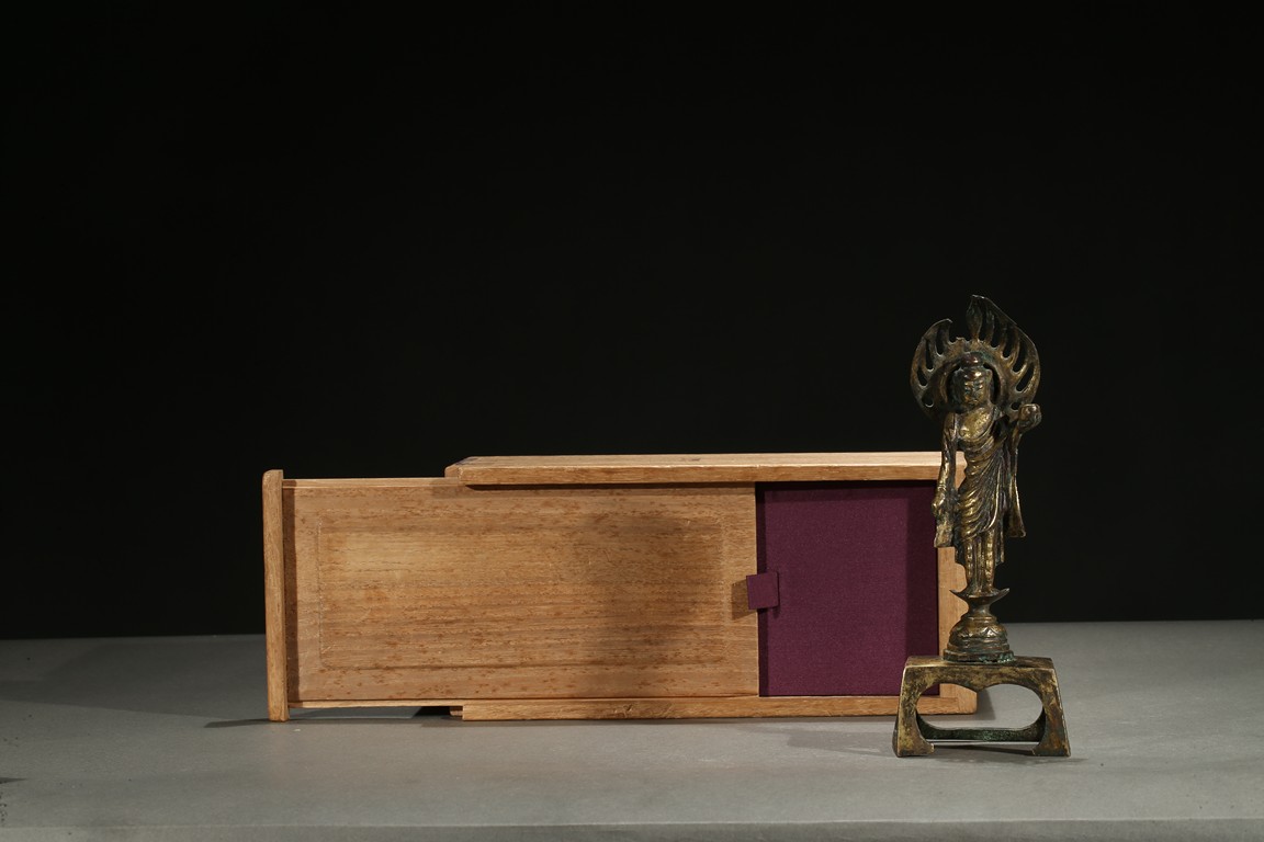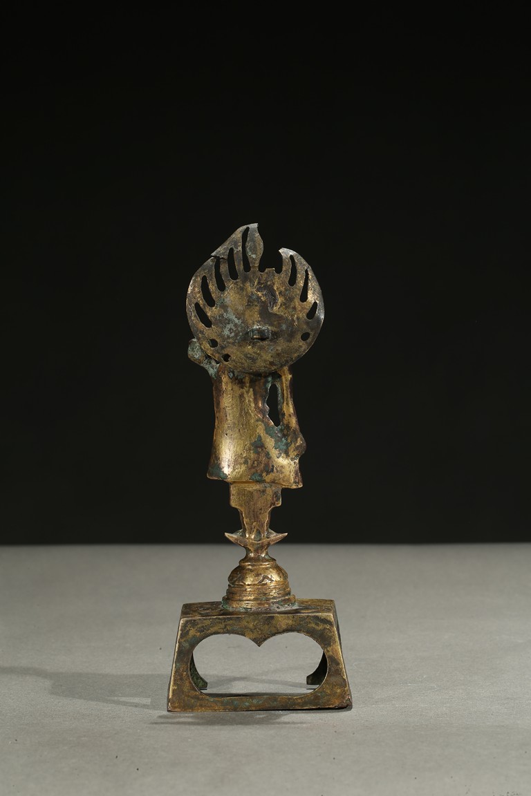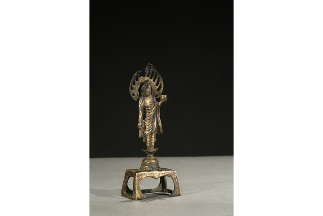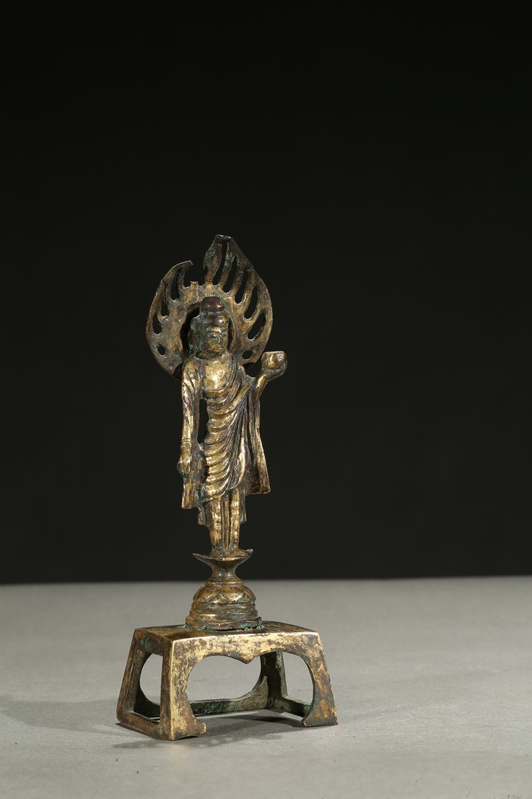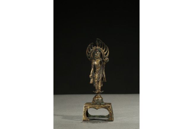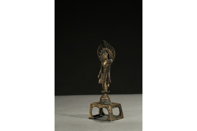 Cast as a standing bodhisattva wearing pleated robe, with left hand raised holding a cup, head backed by a reticulated flame aureole, all supported on a trapezoid plinth. Tang Dynasty period.