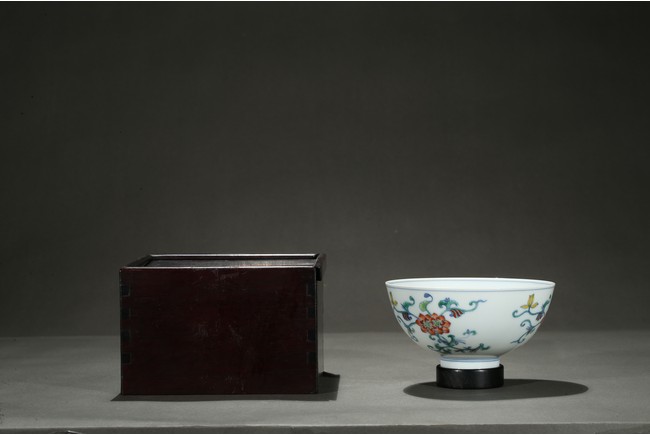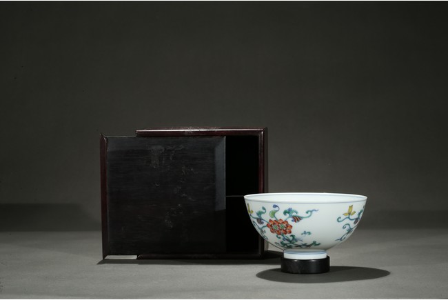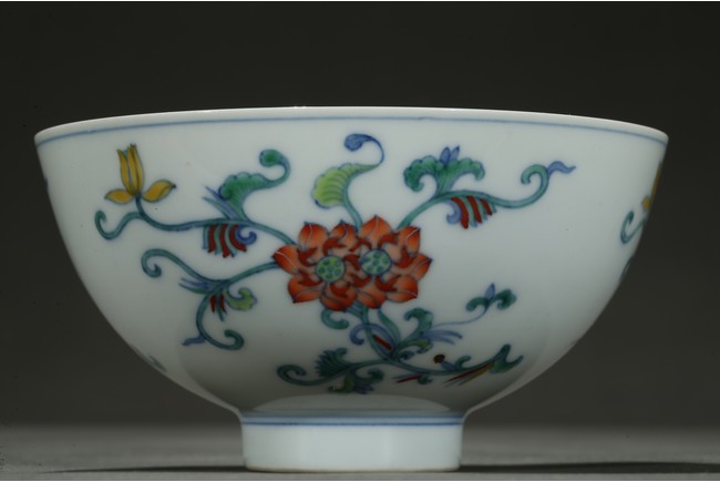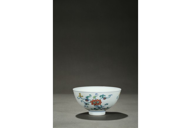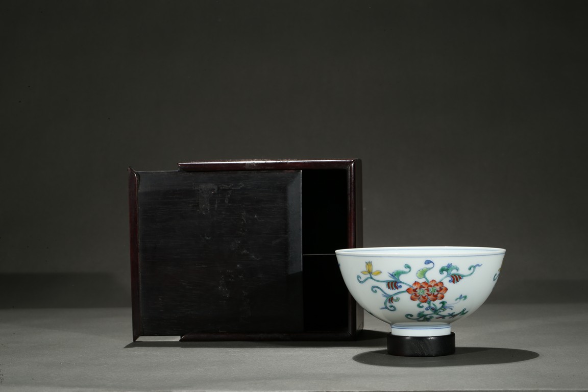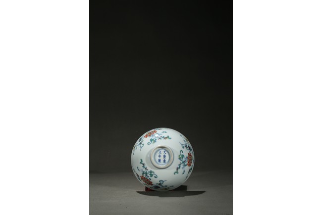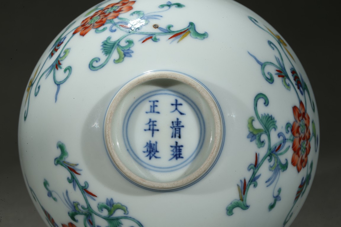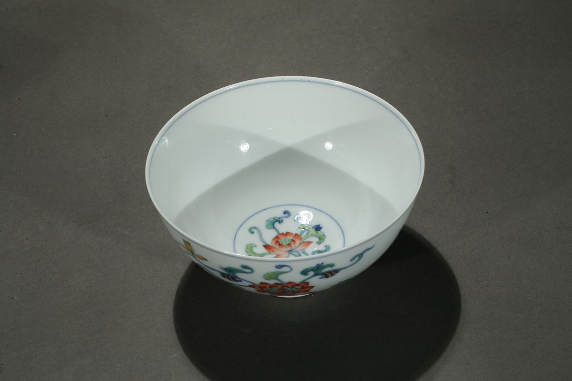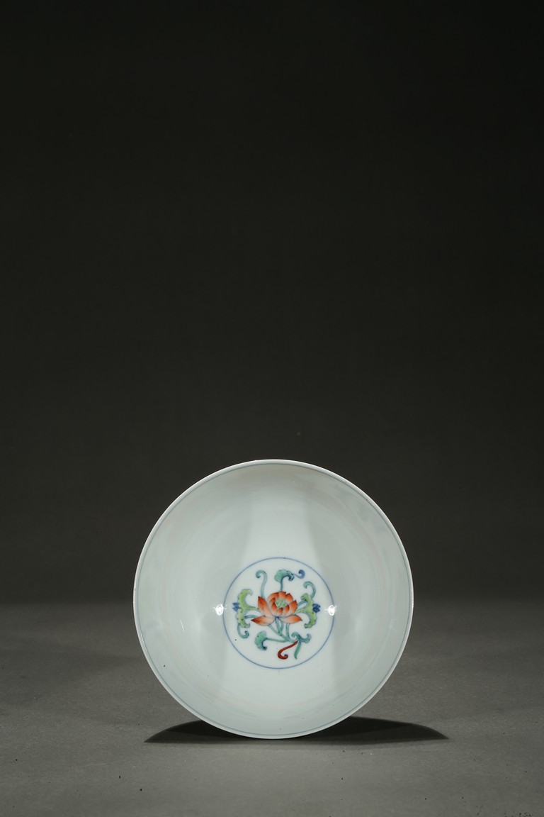 Finely painted around the sides in bright doucai enamels with bloom and foliate scrolls below a blue line border around the rim, the interior with a similar floral spray encircled by a single rounded circles in blue glaze, the base inscribed with a six character seal mark. Qing Dynasty period