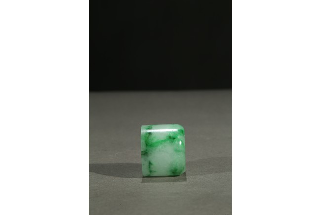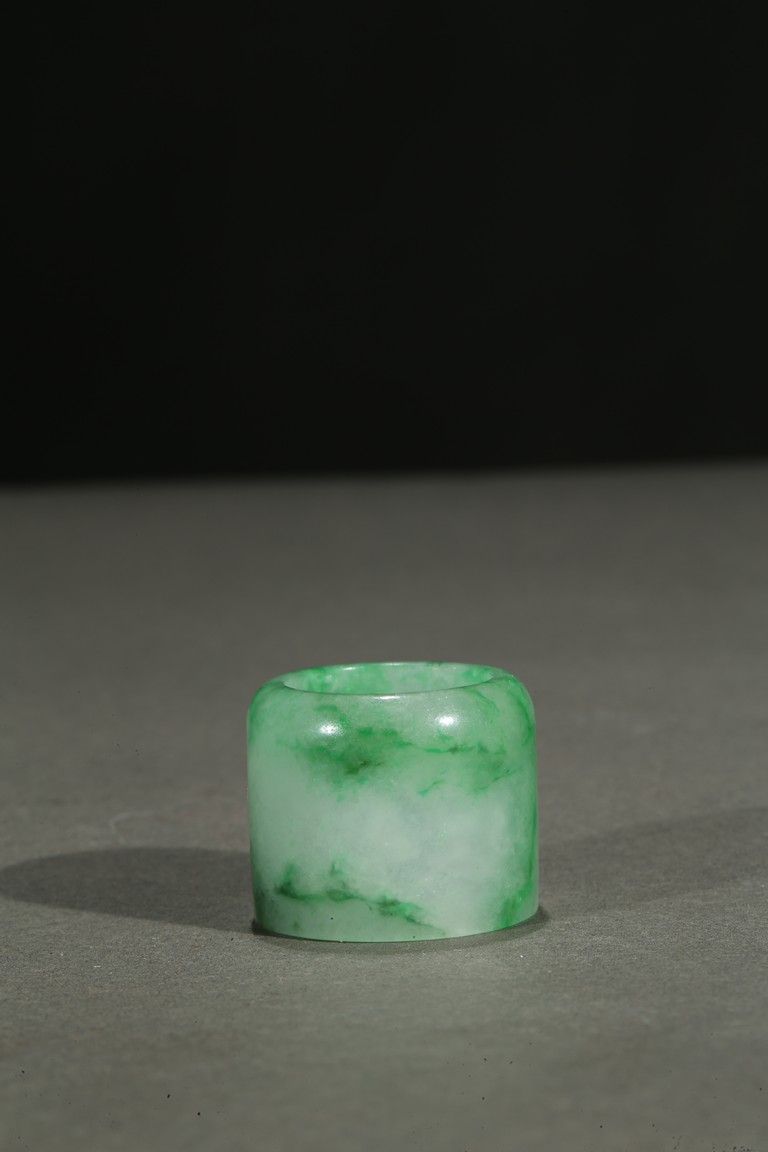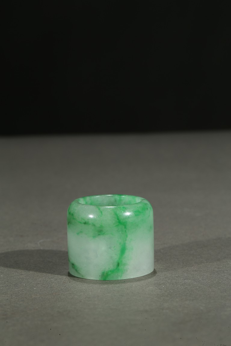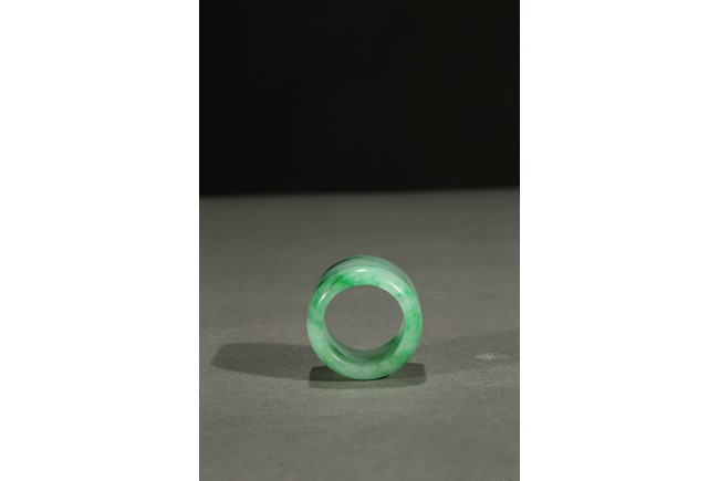 The ring with sides undecorated and with a soft polish, the translucent stone suffused with apple-green inclusions throughout. Late Qing Dynasty period.
