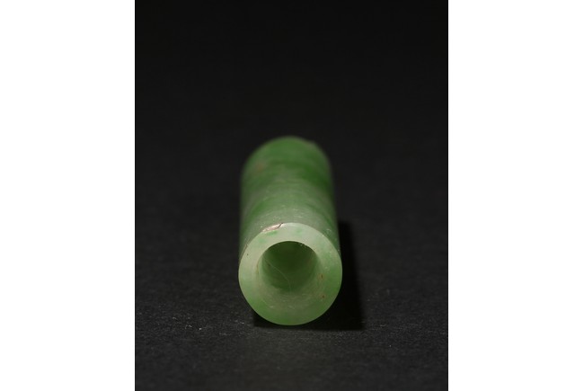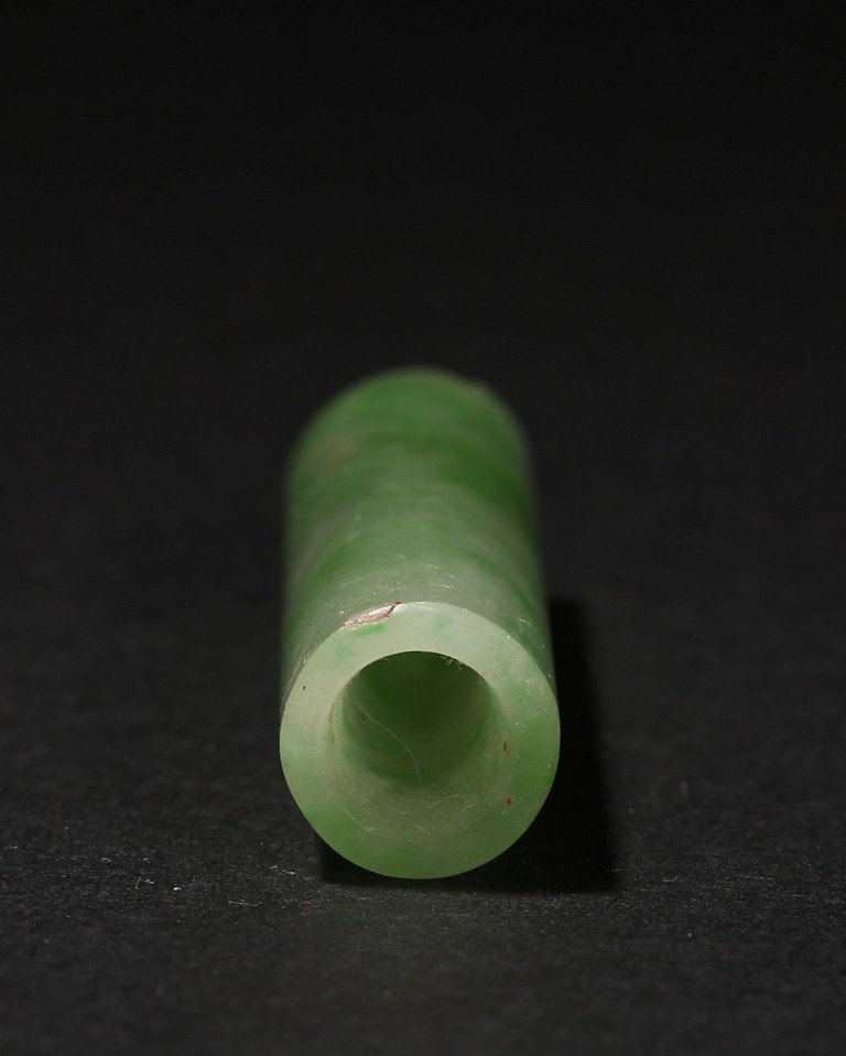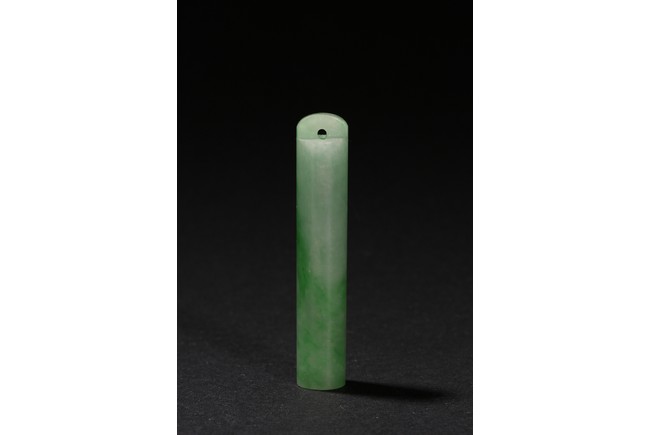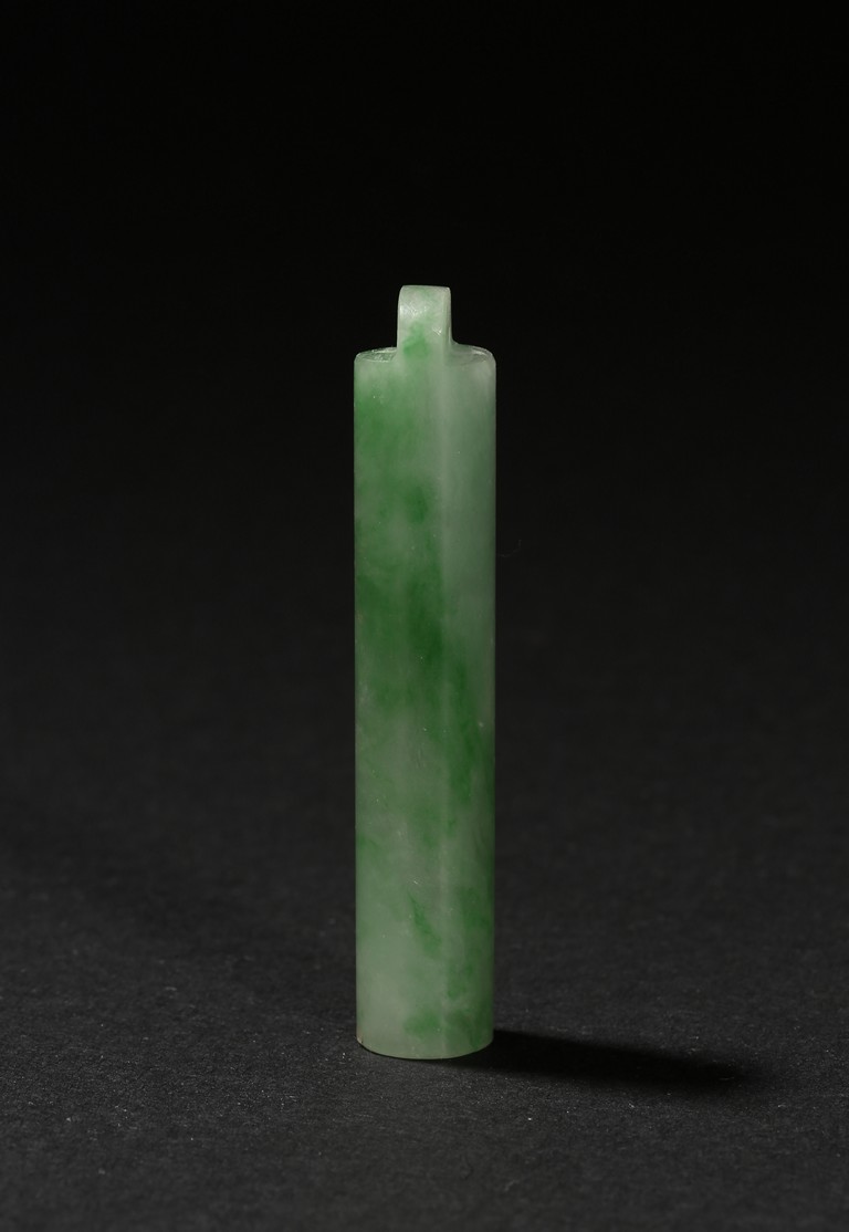 The tube carved from an apple green translucent jadeite stone, with top modelled in the form of a hoop. Late Qing Dynasty period.
