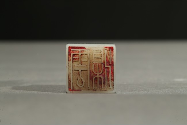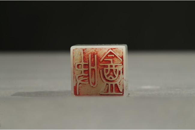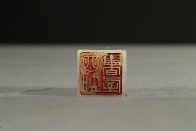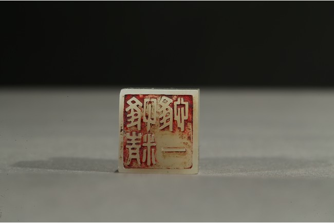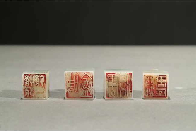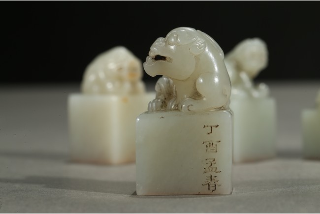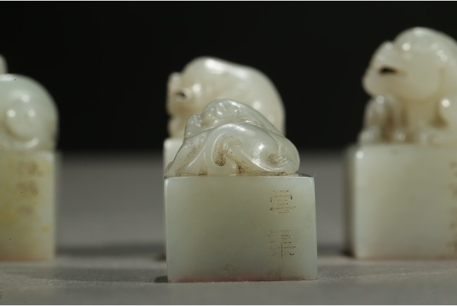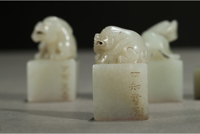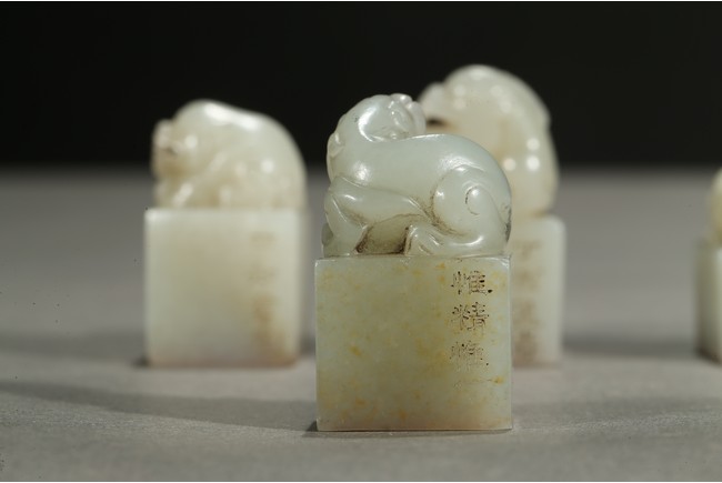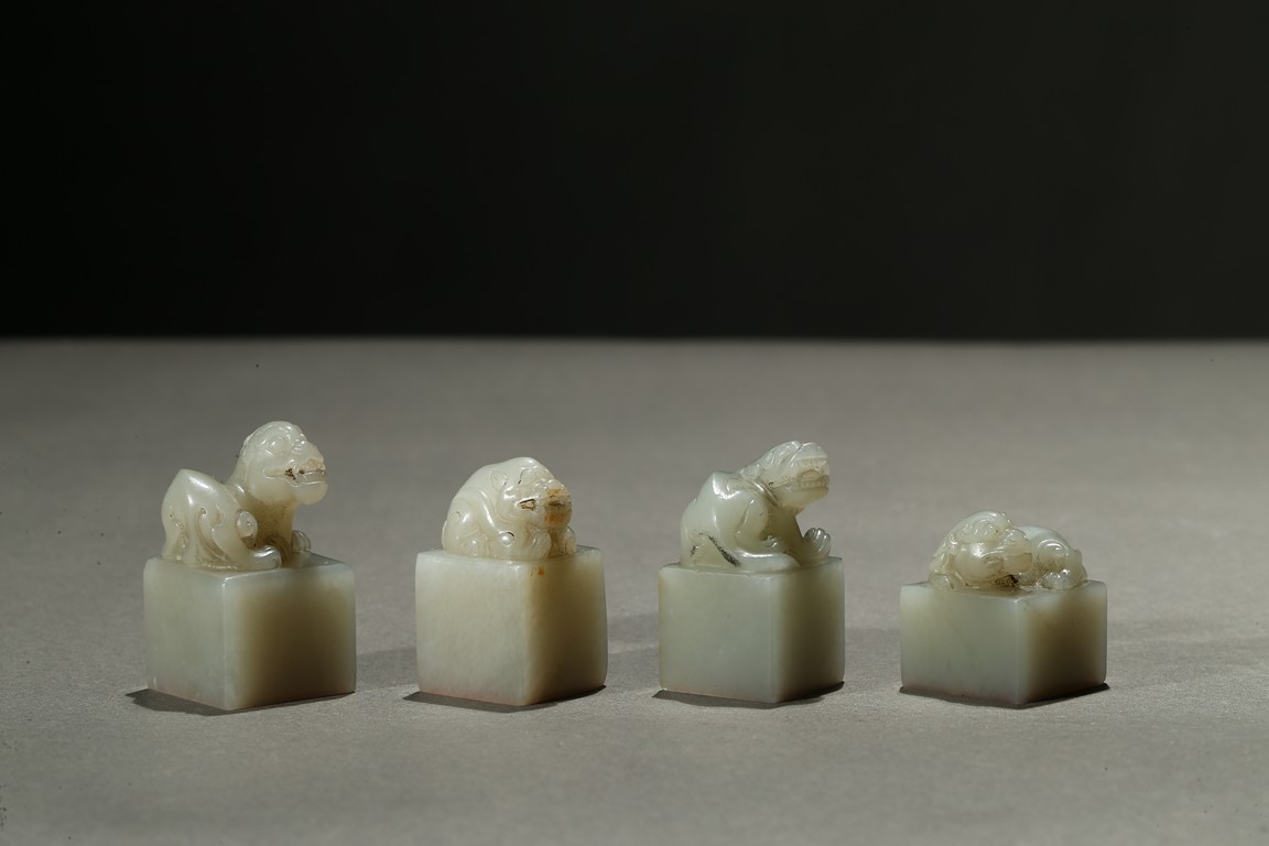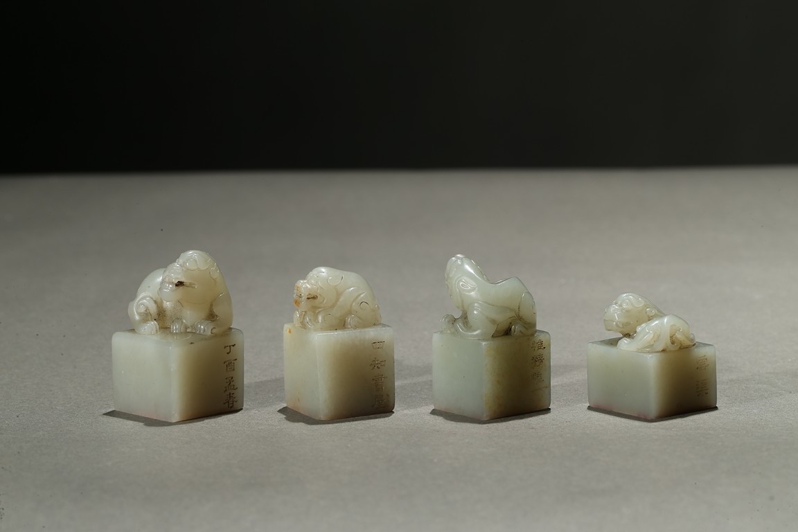 Each seal is of rectangular form, the top carved in the form of a crouching mythical beast, the side of platform carved with regular script inscription, the base deeply carved in characters in archaic script, the stone is of smoothly polished celadon white tone. Qing Dynasty period.