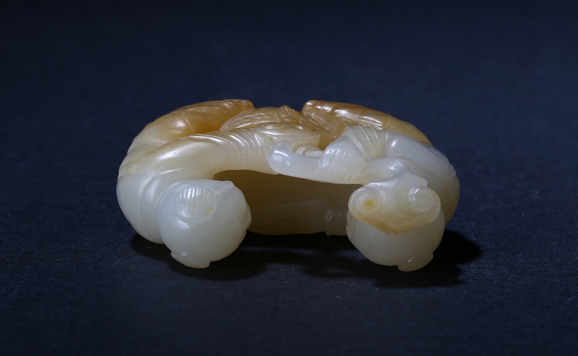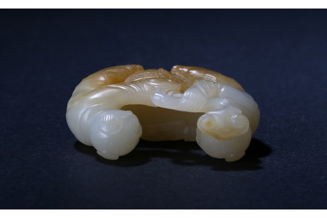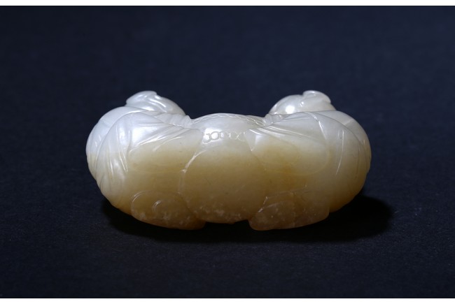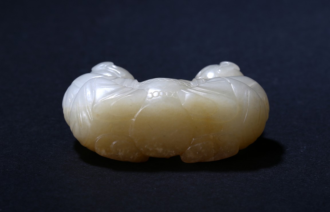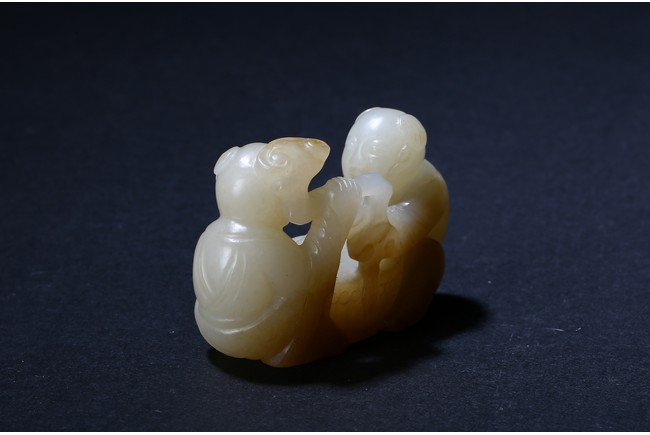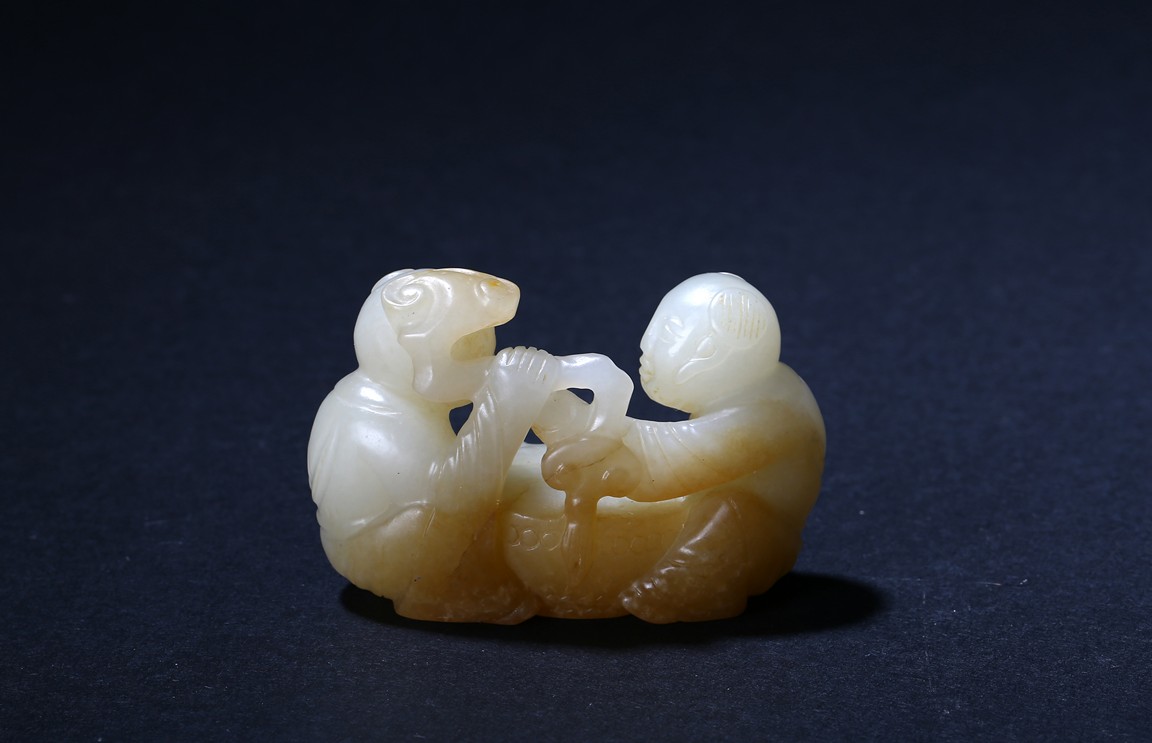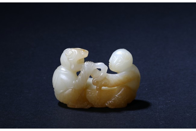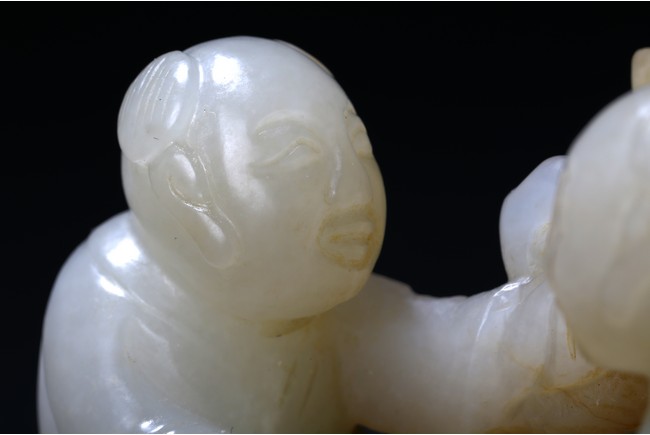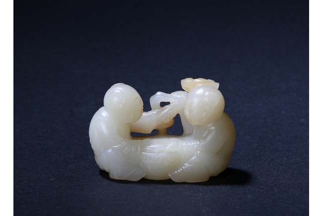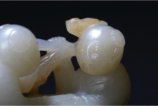 Carved as two boys sitting face to face with a large rounded drum in between, both with one hand holding a drumstick, the other hand holding a lingzhi ruyi branch, the stone is of smooth white tone with slight russet areas. Qing Dynasty period.