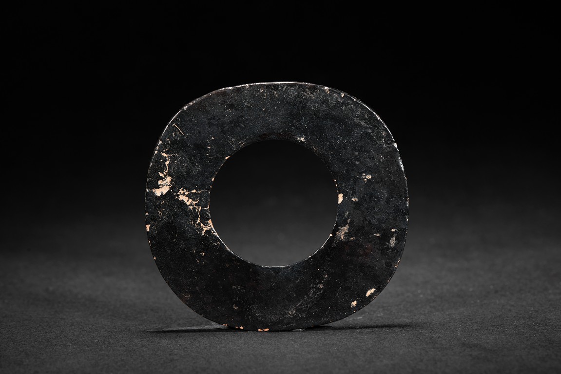 The disc with a circular aperture drilled at center, the stone is of opaque black tone with scattered buff marks.