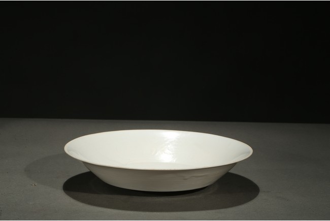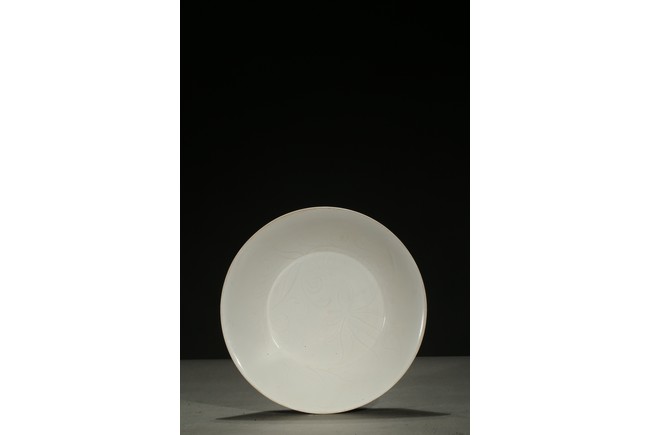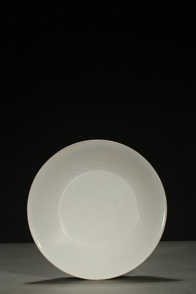 此定窯盤胎潔白細膩,薄而堅硬,通體施象牙白色釉,瑩潤柔和。內壁刻劃折枝卷葉萱草紋,線條流暢,舒捲自如,紋飾由底心延伸至周壁。此盤造型雋秀,線條乾淨俐落,萱草刻劃簡練生動,為北宋定窯最具代表性的紋飾, 值得收藏。可參閲《故宮博物院藏文物珍品大系·兩宋瓷器(上)》,李輝柄,商務印書館 (香港),2002年,第82頁,圖73