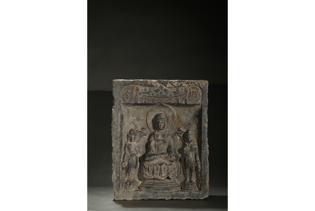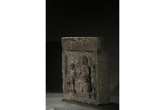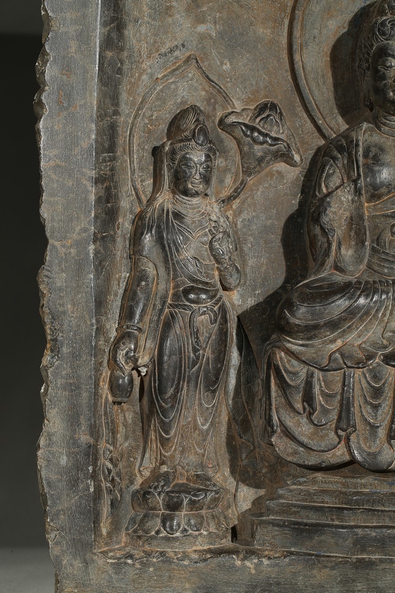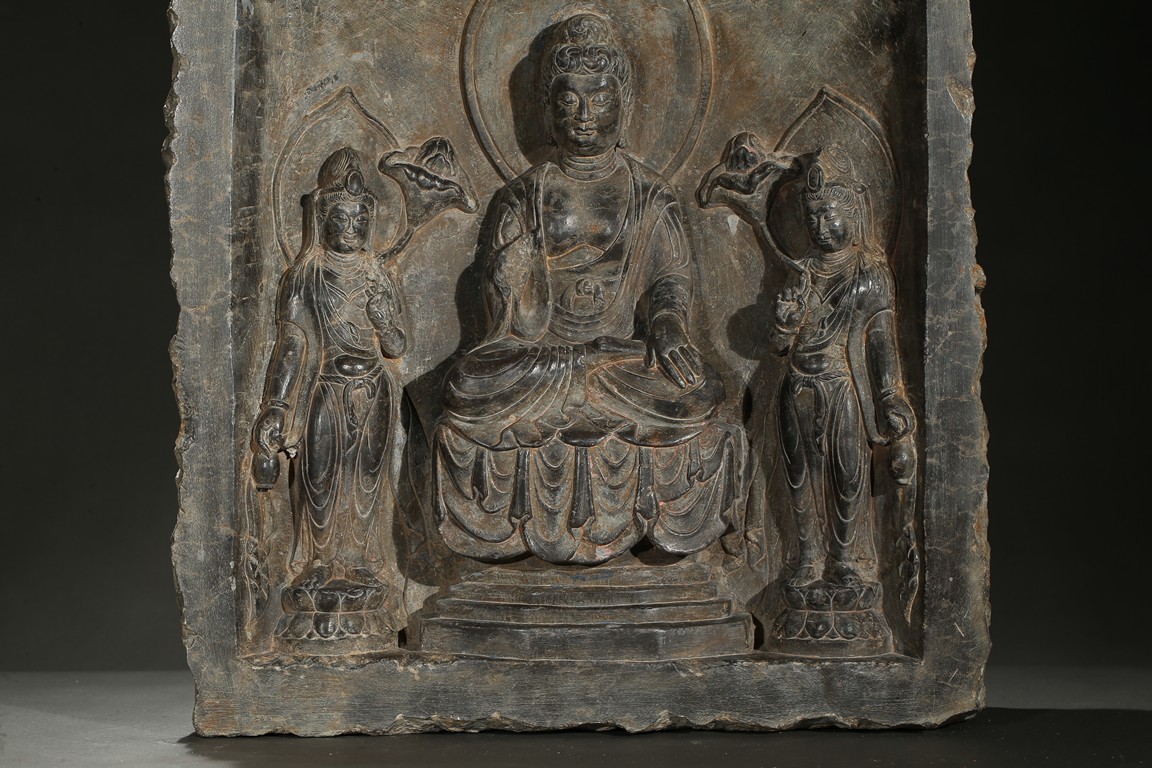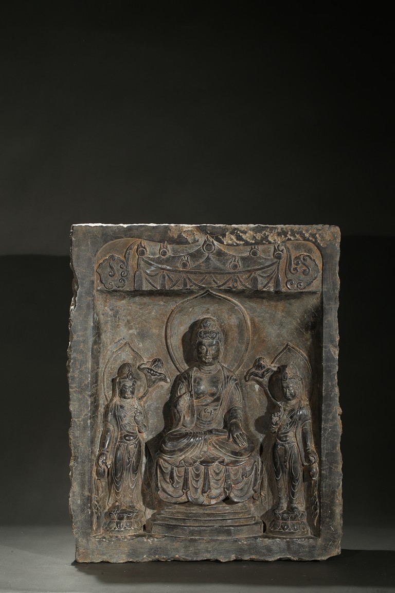 The rectangular stone stele carved in high relief, depicting shakyamuni sitting on a pedestal to the center, wearing flowing robe falling graceful folds, his face with serene expression, flanked by two standing robed bodhisattvas. Tang Dynasty period or later.
