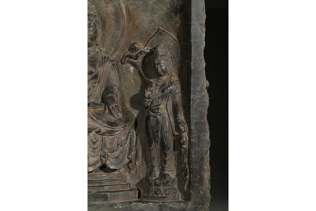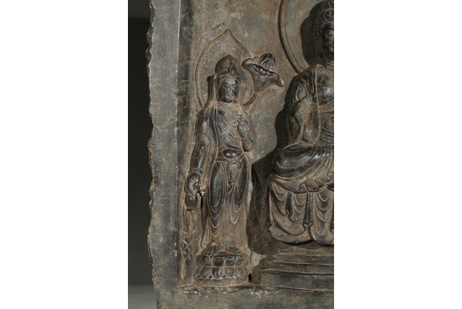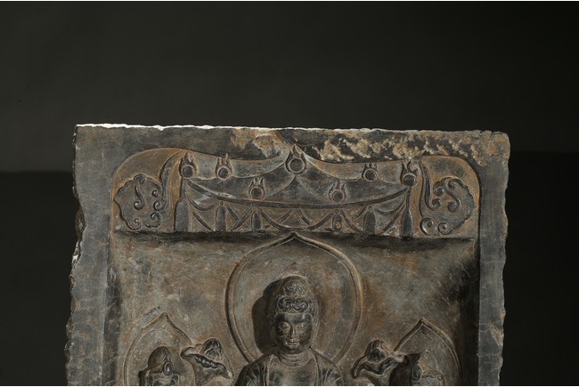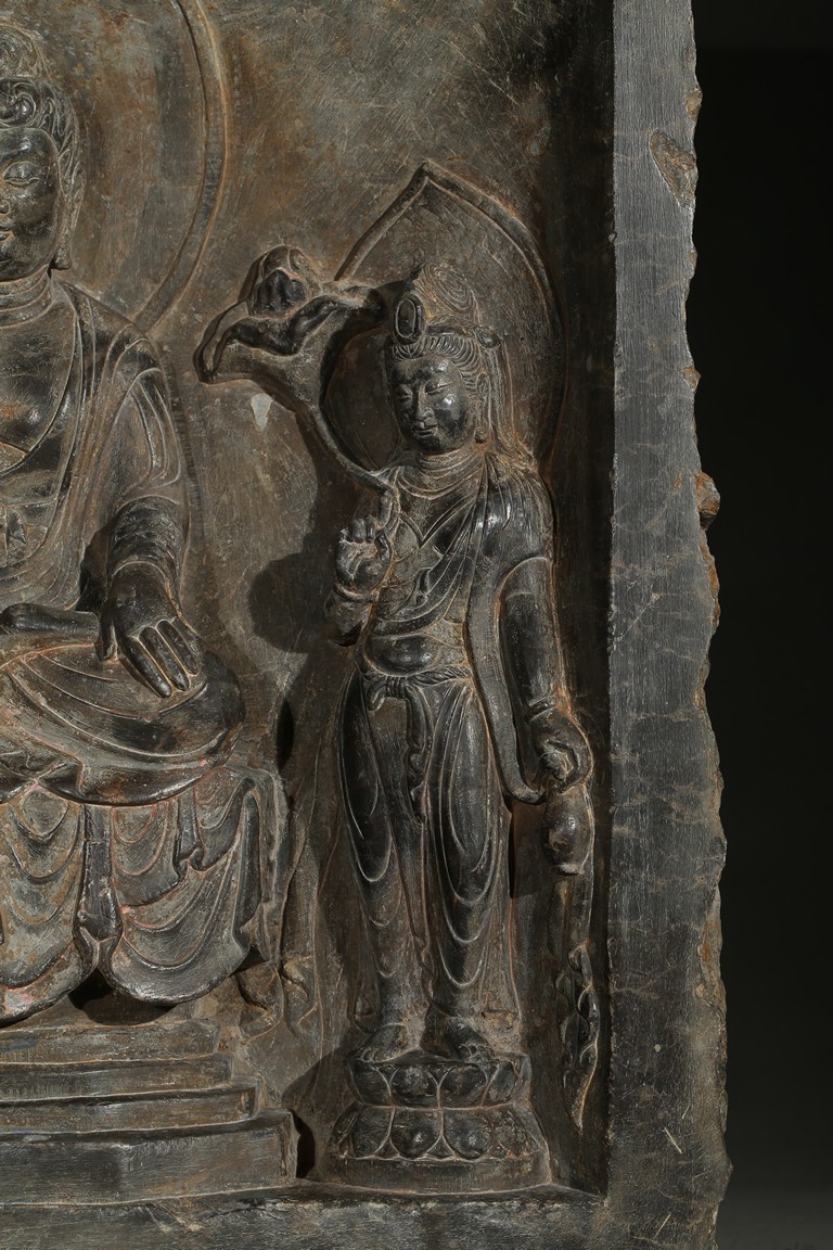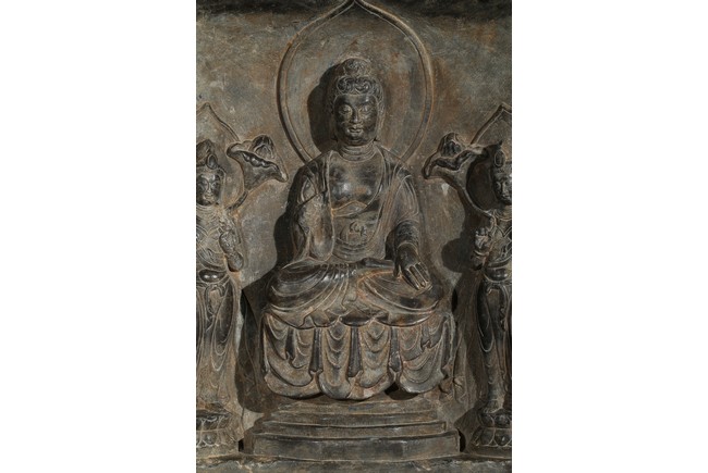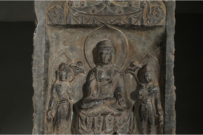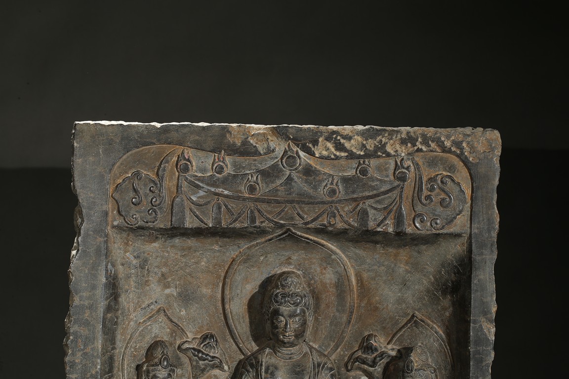 The rectangular stone stele carved in high relief, depicting shakyamuni sitting on a pedestal to the center, wearing flowing robe falling graceful folds, his face with serene expression, flanked by two standing robed bodhisattvas. Tang Dynasty period or later.