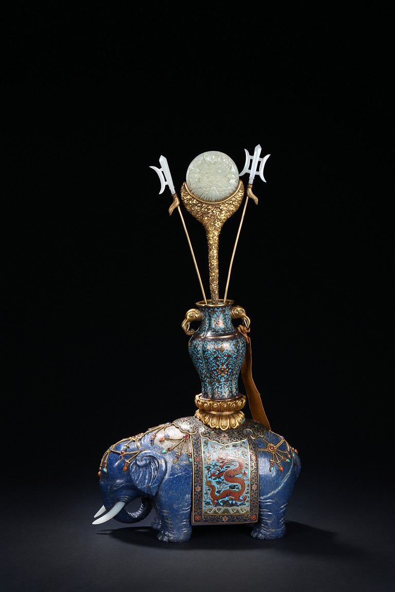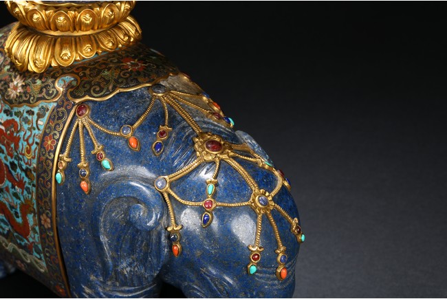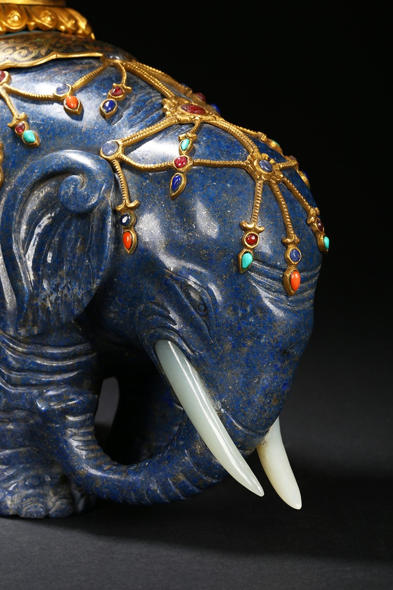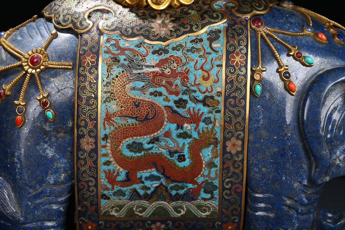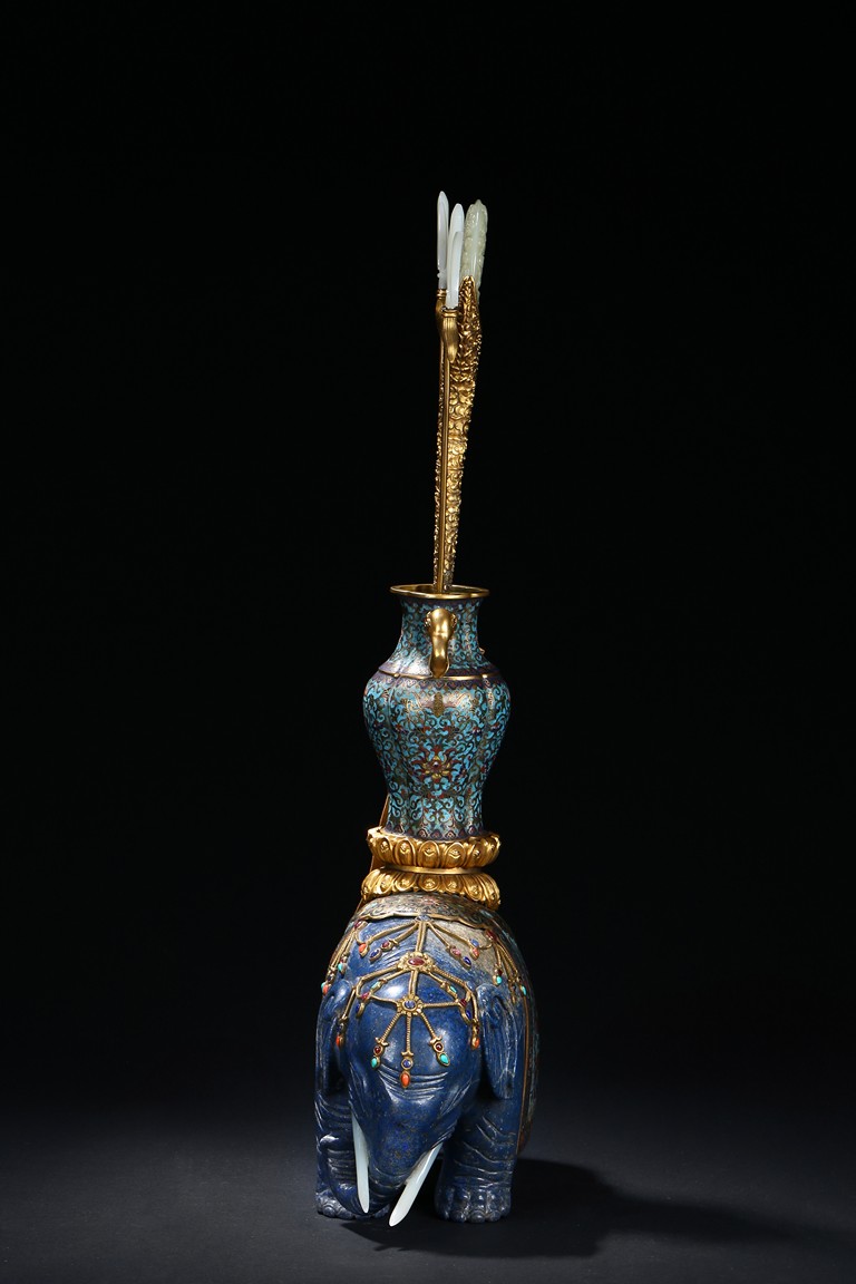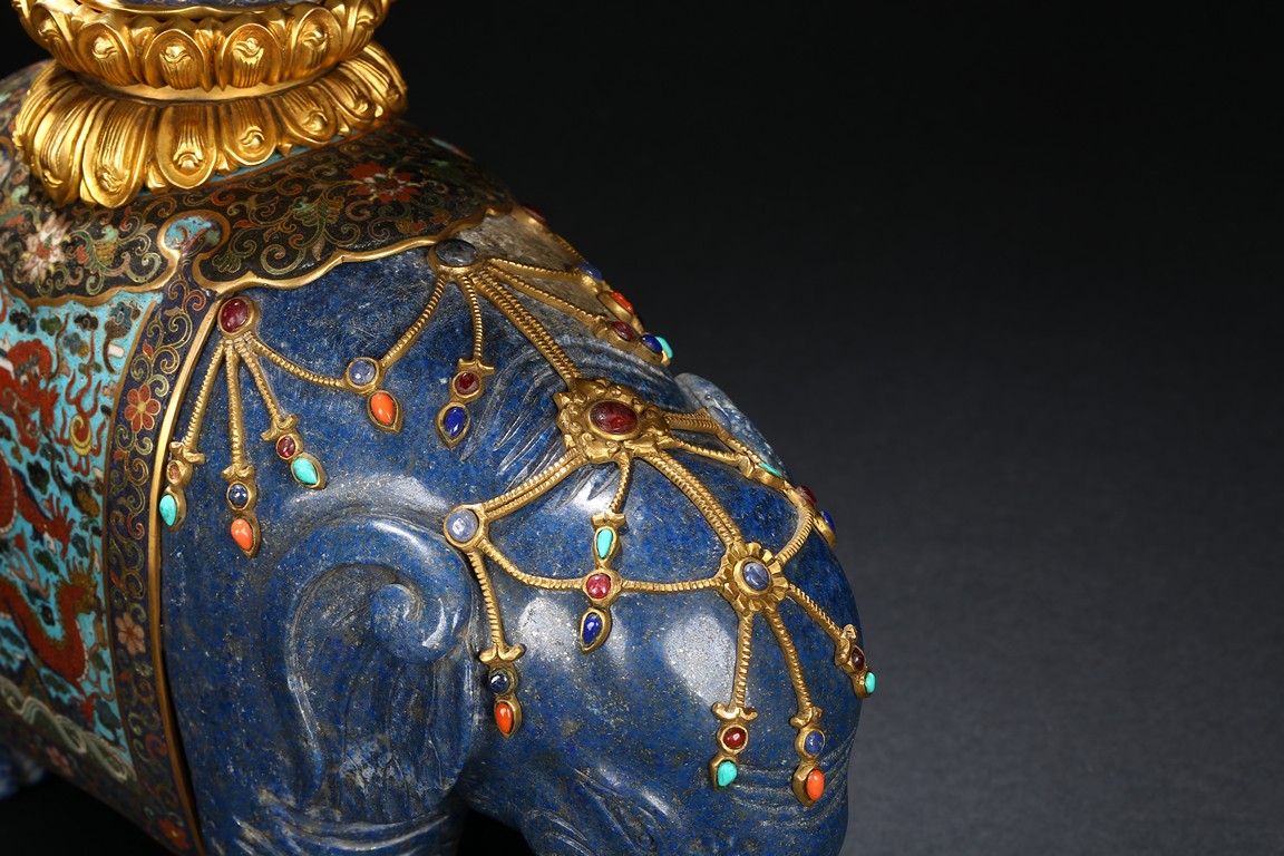 此銅胎掐絲琺瑯鑲青金石太平有像擺件做工精細,造型準確,體形碩大,保存完整,實為難得。器主體為象形,背馱琺瑯瓶。大象青金石材質,體態渾圓,神情憨態可掬,身配瓔珞、綰具,背上搭一錦袱,上放鞍韉,寶瓶置於鞍上。像背上所置鞍韉、寶瓶為銅胎掐絲琺瑯裝飾,圖樣繁複而不亂,色彩豐富而不俗,華美異常。寶瓶插嵌白玉三長戟。“太平有像”,寓意天下太平,五穀豐登。此件用料奢華,工藝繁縟,製作精細,栩栩如生,令人歎為觀止,一器之成必將費時日久,人力物力不可計數,堪稱案供神品。