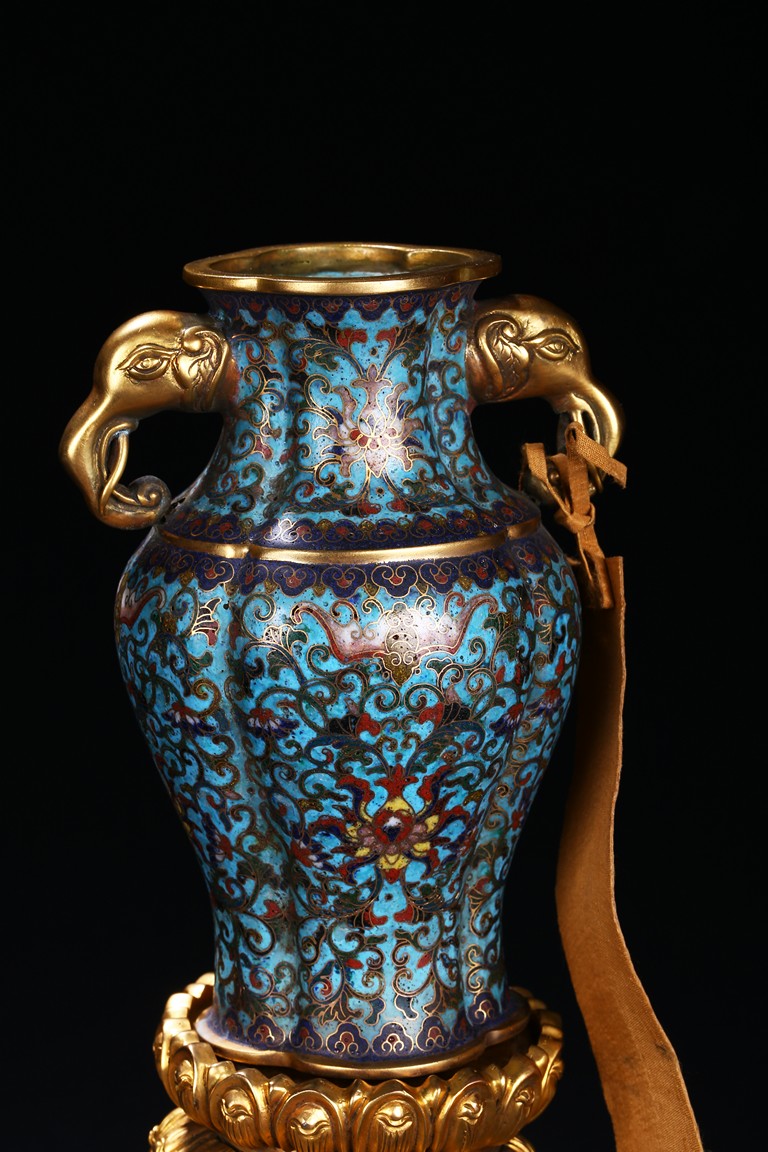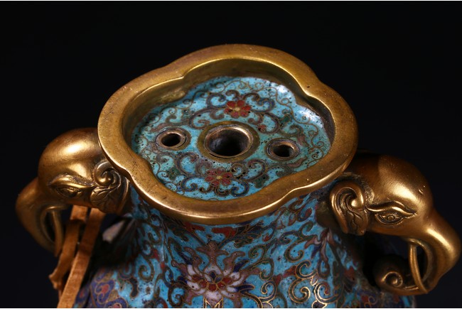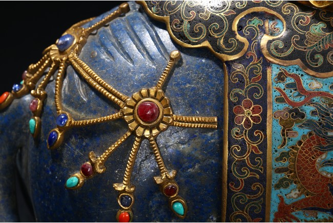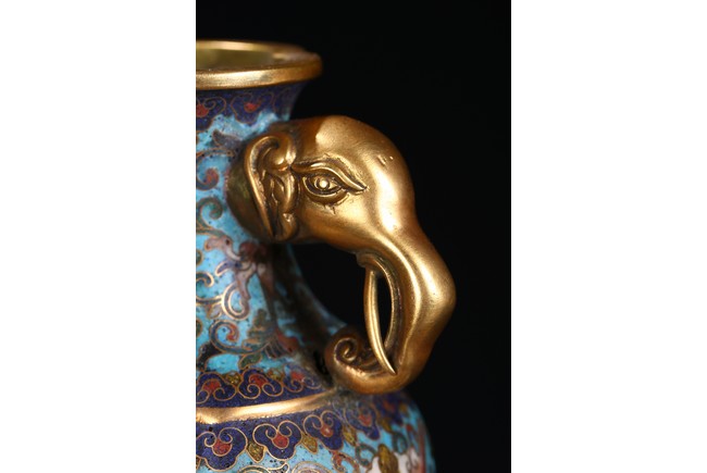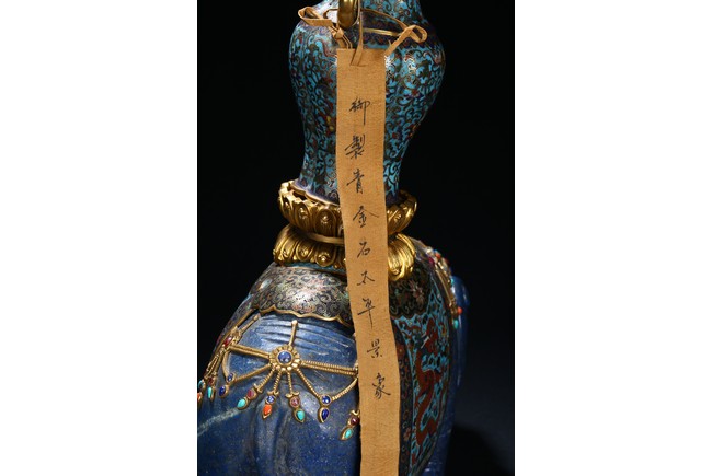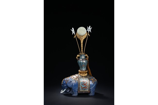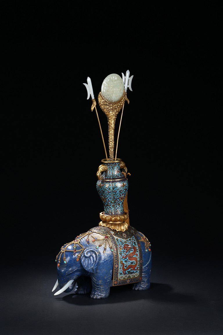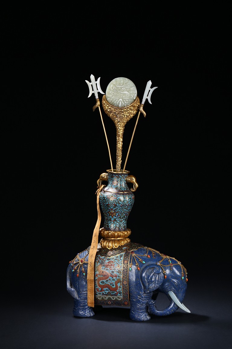 此銅胎掐絲琺瑯鑲青金石太平有像擺件做工精細,造型準確,體形碩大,保存完整,實為難得。器主體為象形,背馱琺瑯瓶。大象青金石材質,體態渾圓,神情憨態可掬,身配瓔珞、綰具,背上搭一錦袱,上放鞍韉,寶瓶置於鞍上。像背上所置鞍韉、寶瓶為銅胎掐絲琺瑯裝飾,圖樣繁複而不亂,色彩豐富而不俗,華美異常。寶瓶插嵌白玉三長戟。“太平有像”,寓意天下太平,五穀豐登。此件用料奢華,工藝繁縟,製作精細,栩栩如生,令人歎為觀止,一器之成必將費時日久,人力物力不可計數,堪稱案供神品。