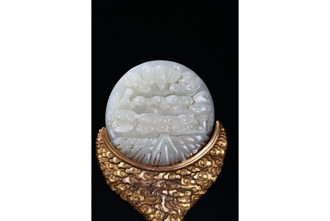 Shown in standing foursquare, the elephant with white jade forward stretching tusks, the head embellished with various gem beads including turquoise, coral, and ruby; the body fitted with cloisonne enamel saddle with dragon ascending from sacred mountains and sea, the back surmounted with a double lotus throne supporting a floriform formed vase flanked by two elephant handles, containing two white jade ‘Ji' and a circular white jade disc carved with bats, mountains and seas. Qing Dynasty period.