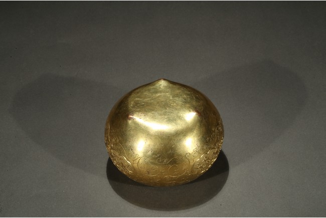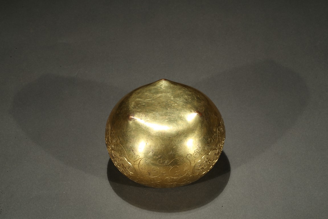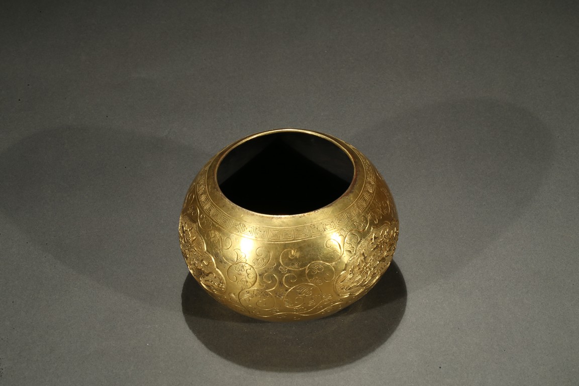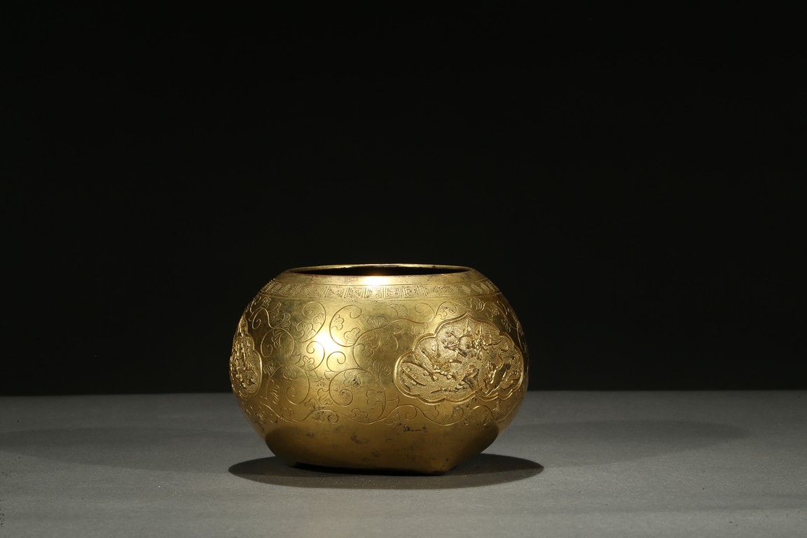 Of compressed globular form, the body decorated with three ruyi head-shaped cartouches with magpies perching plum blossoms branches above a mythical beast, all in relief against a ring-punched ground, between incised floral scrolls design, between a key-fret pattern band along the mouth rim, all richly in gilt. Qing Dynasty period.