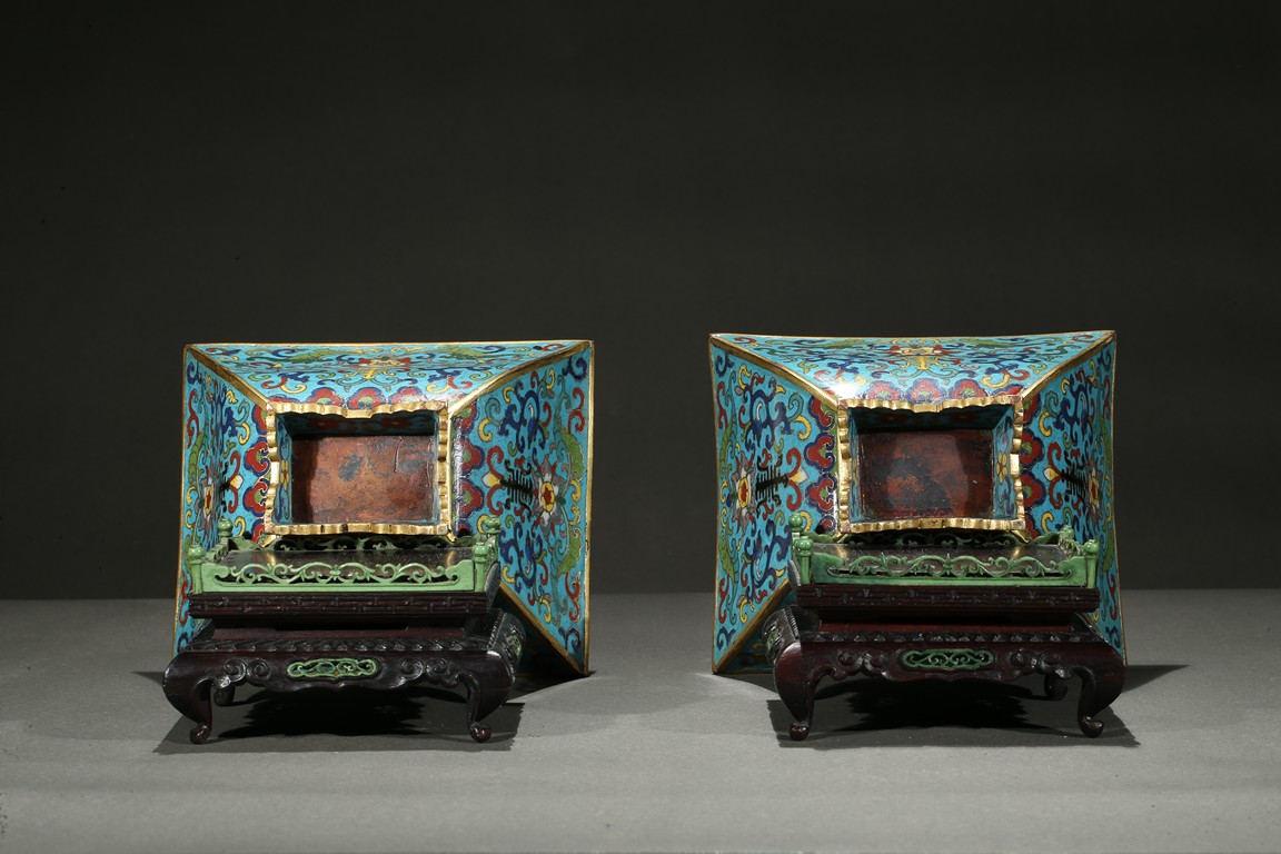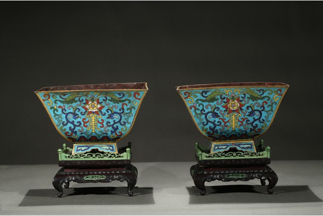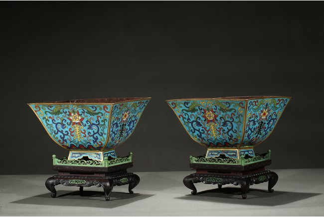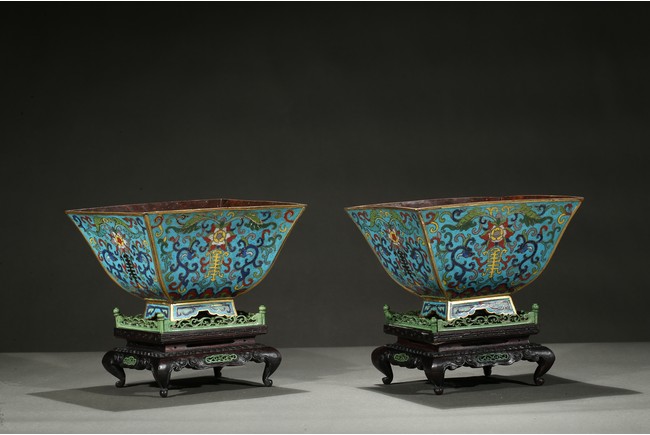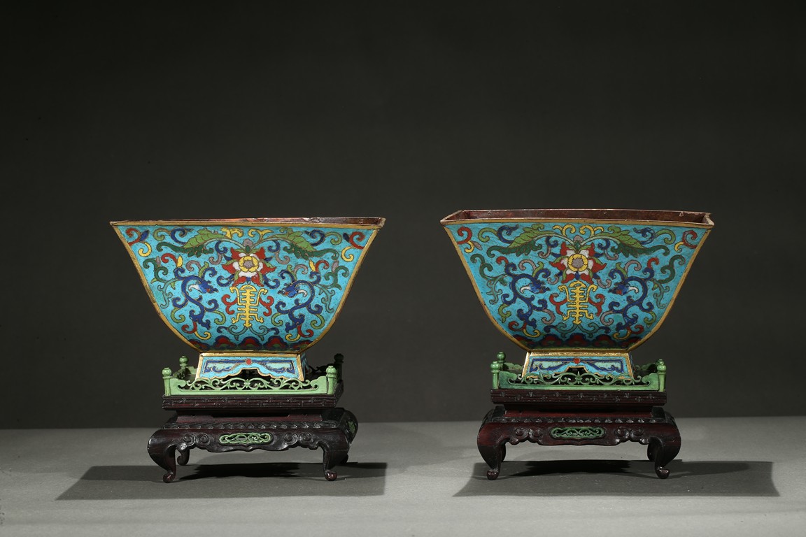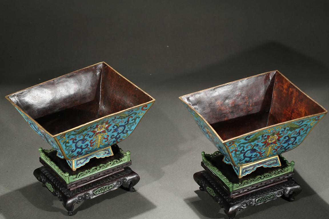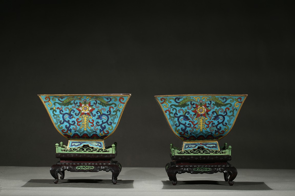 Each bowl is supported on four shaped feet and rises to wide flared mouth, each side decorated shou character and lotus scrolls against turquoise ground, all above painted wood stands. Qing Dynasty period.