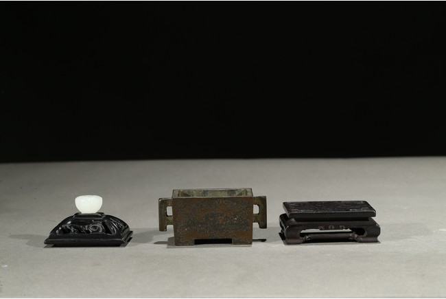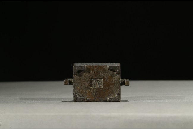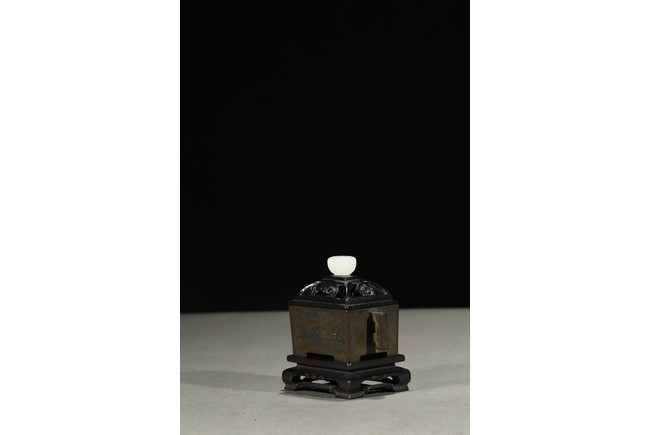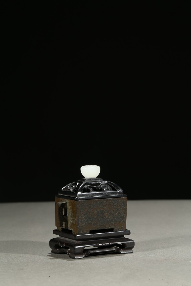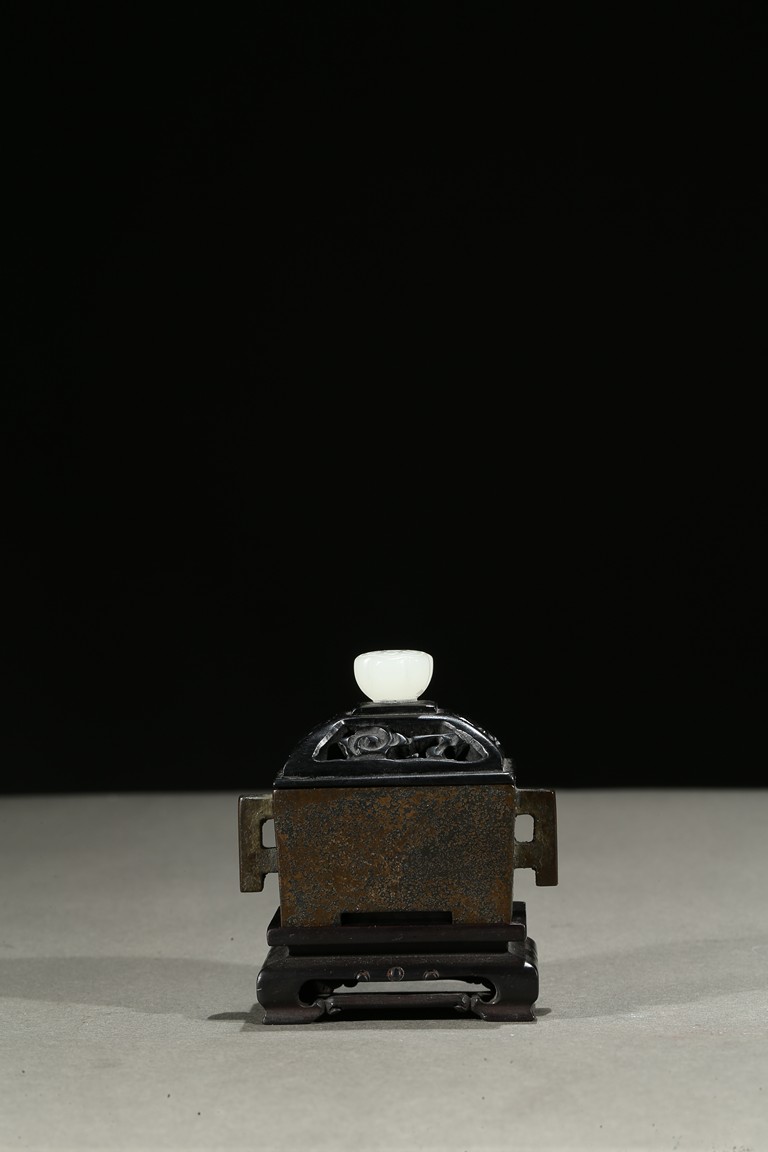 Tapering gently towards the base and supported on four integral tab feet, the short sides set with opposing angular handle, fitted with a wood reticulated cover surmounted with white jade finial. The base with three character impressed mark. Qing Dynasty period.