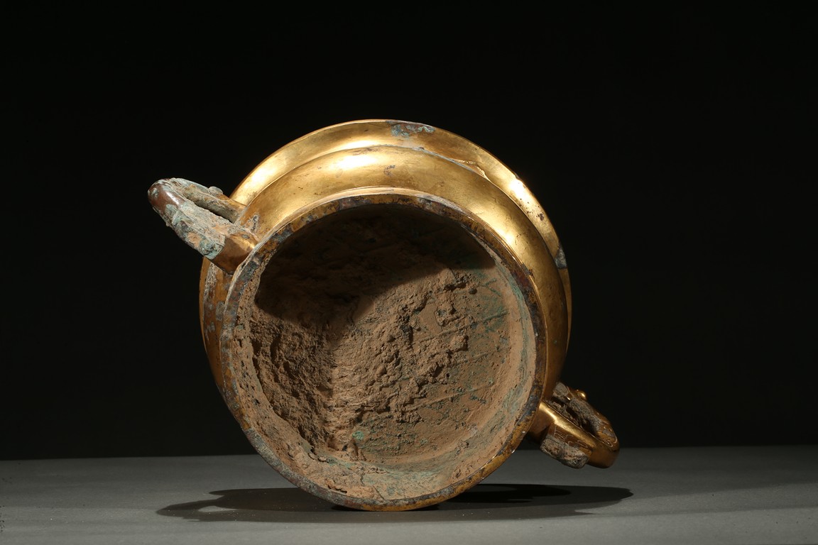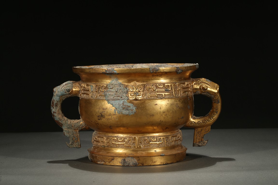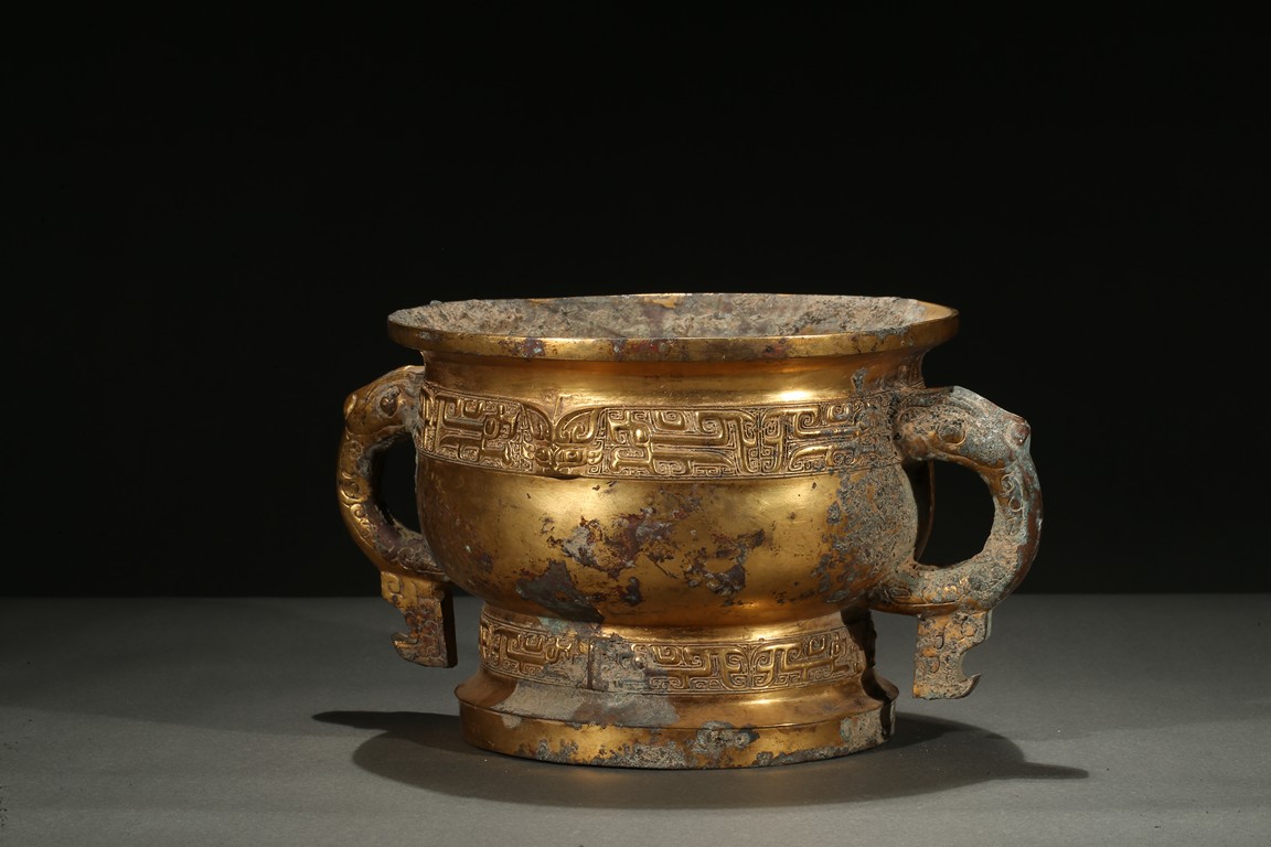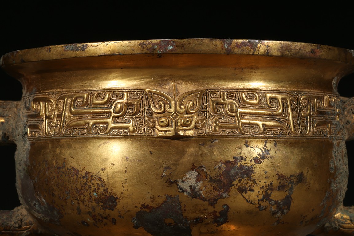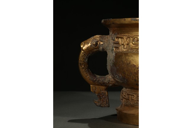 of archaistic gui form, the compressed globular body supported on a flared circular foot rim, set with two loop handles issuing from animal masks, the sides chased in relief with a central band of flame scrolls, below a band of stylised taotie, flanked by two confronting bird-like chilong. Qing Dynasty period.