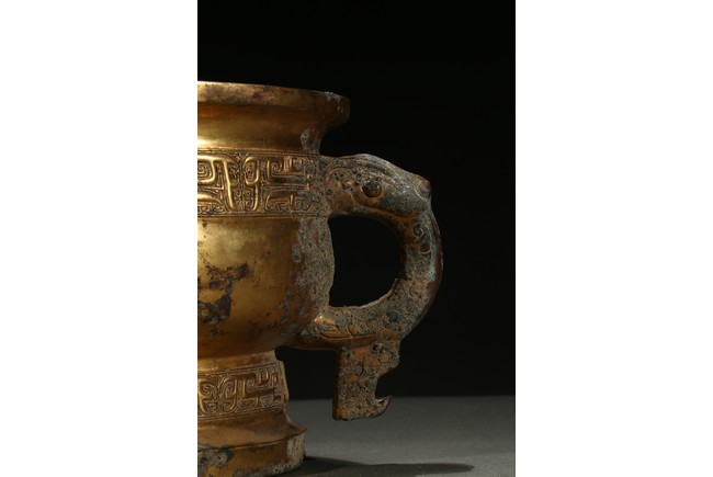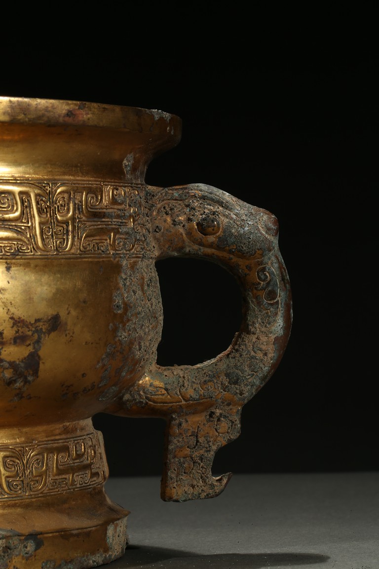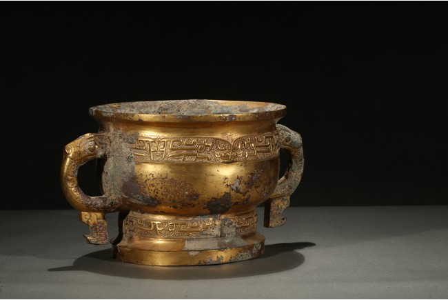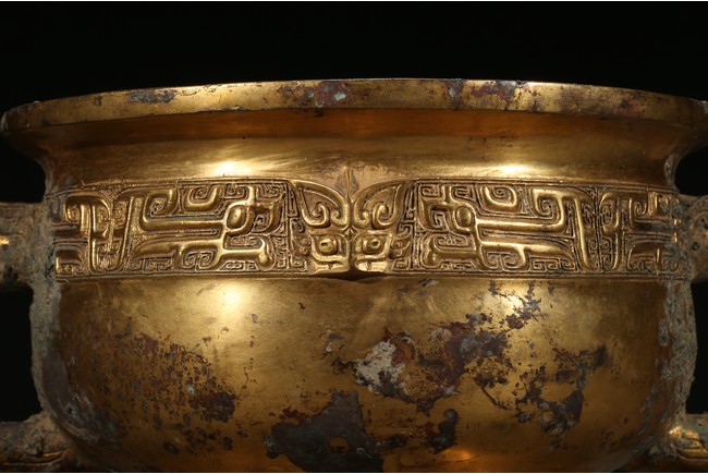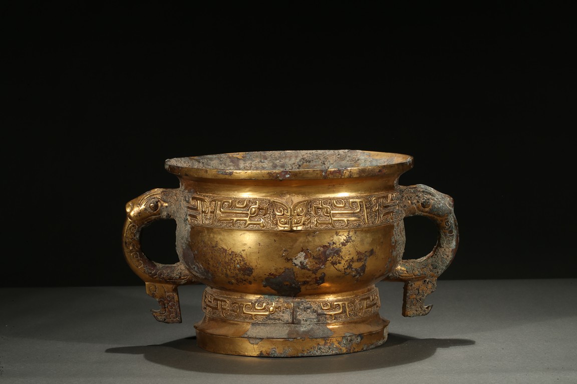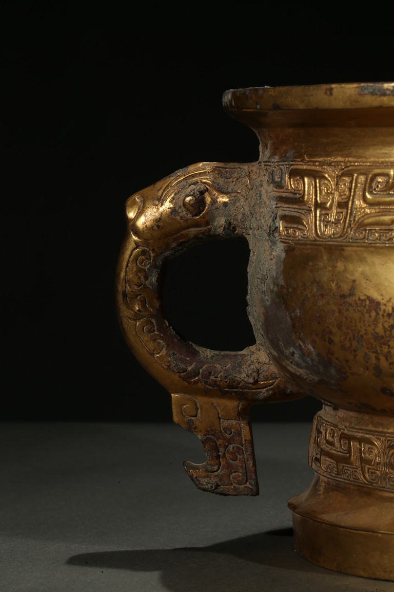 of archaistic gui form, the compressed globular body supported on a flared circular foot rim, set with two loop handles issuing from animal masks, the sides chased in relief with a central band of flame scrolls, below a band of stylised taotie, flanked by two confronting bird-like chilong. Qing Dynasty period.