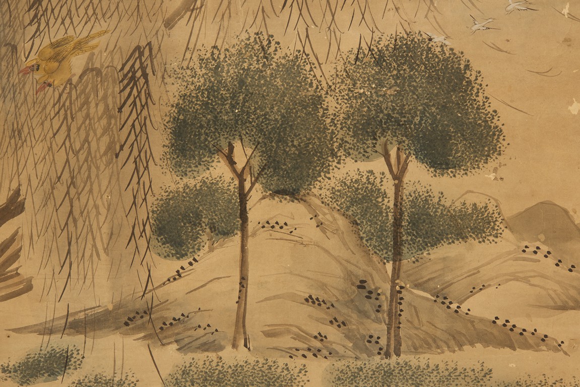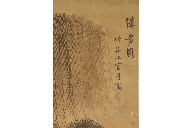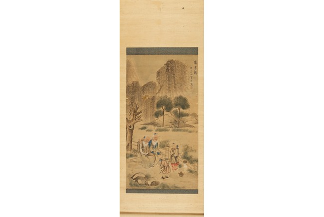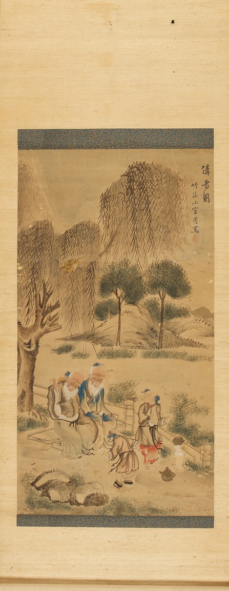 Color and ink on paper. Figures. Hanging scroll. Signed Shangguan Zhou and with one seal of the artist's.