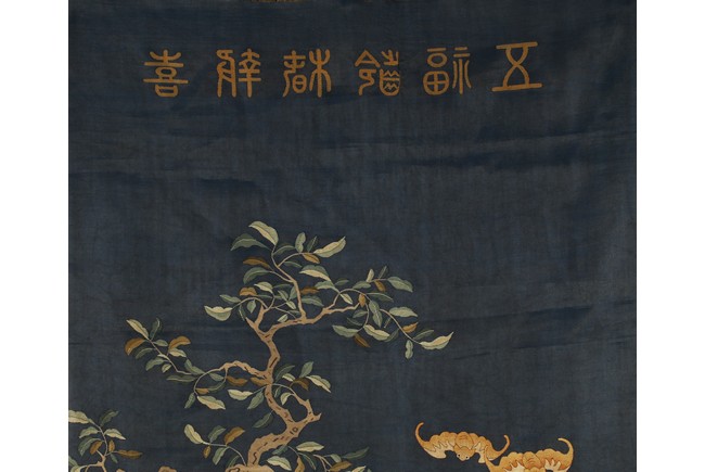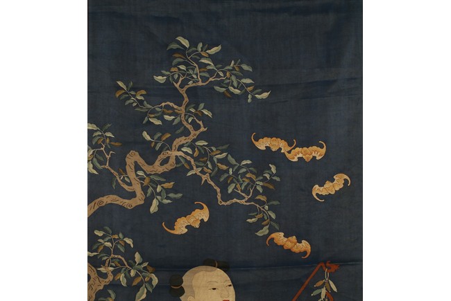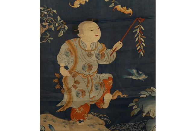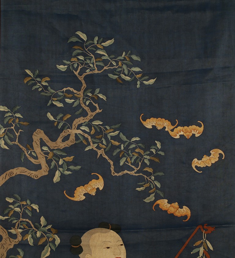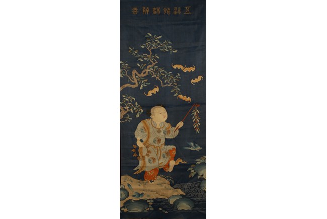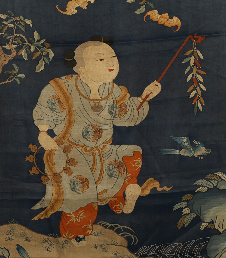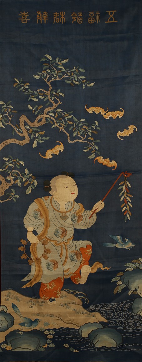 Richly embroidered in bright colors to depict a boy playing with fireworks below a tree, with auspcious bats in flight above, set in a riverbank setting. Qing Dynaty period.