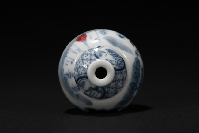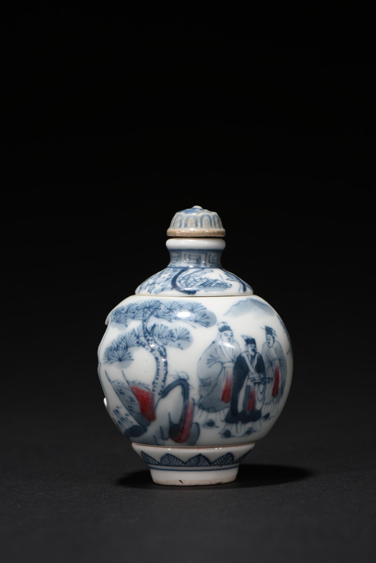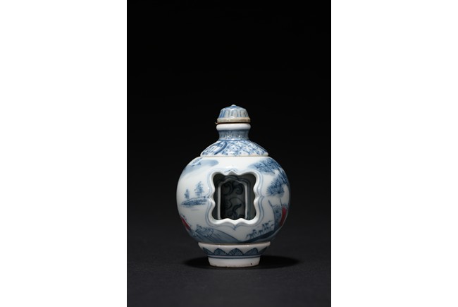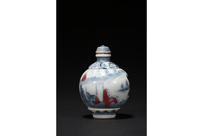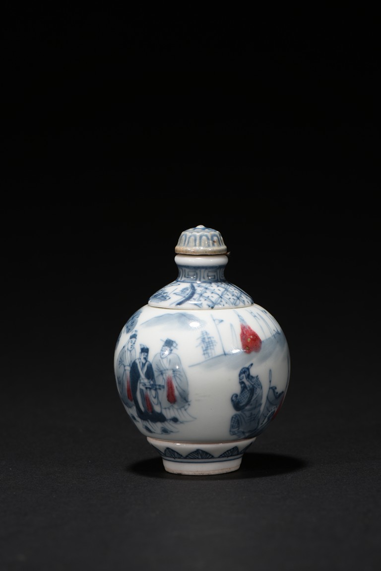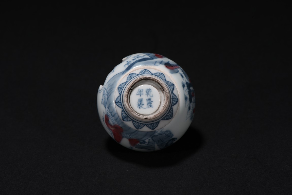 Of globular form, raised on short foot decorated with bands of leaf blades, the exterior finely depicts continuous scene of three officials meeting with a warrior in a war setting, the interior can be revolved at stopper to reveal various floral scenes. The neck circled by village settings below bands of key-fret pattern. The base with a four character mark 'QIAN LONG' mark. Qing Dynasty period.