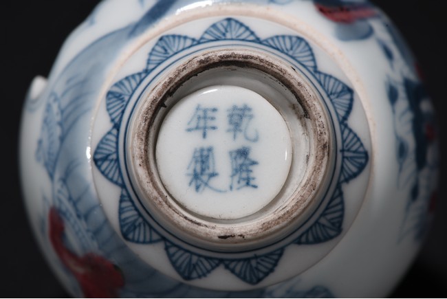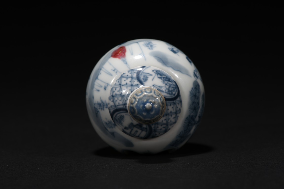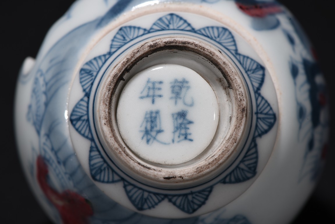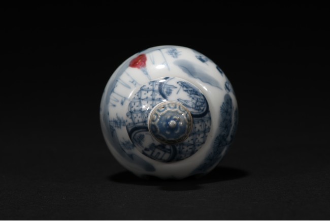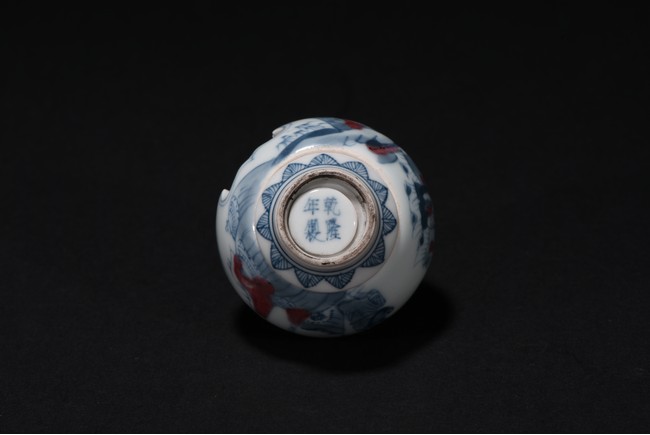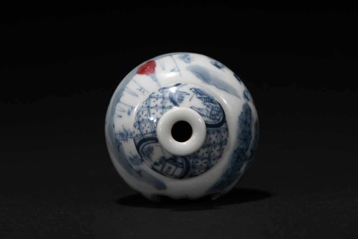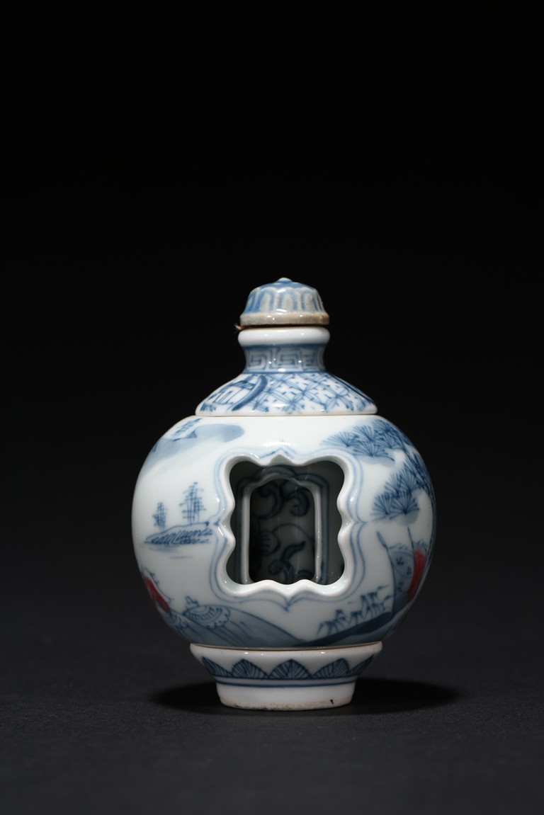 Of globular form, raised on short foot decorated with bands of leaf blades, the exterior finely depicts continuous scene of three officials meeting with a warrior in a war setting, the interior can be revolved at stopper to reveal various floral scenes. The neck circled by village settings below bands of key-fret pattern. The base with a four character mark 'QIAN LONG' mark. Qing Dynasty period.