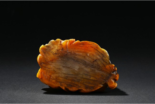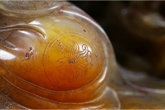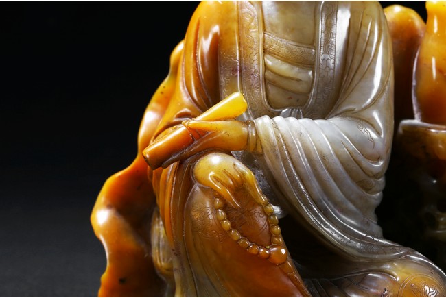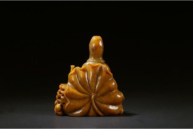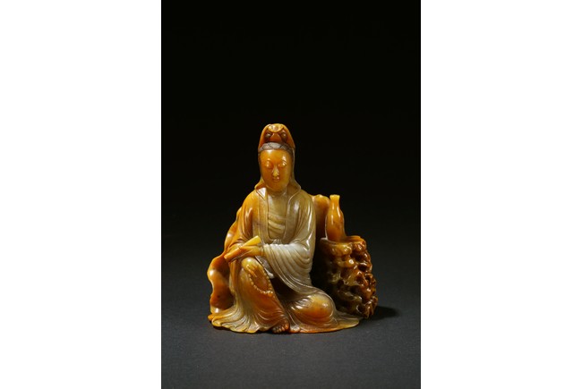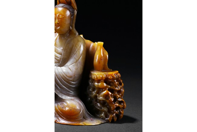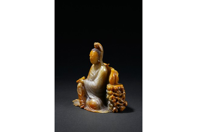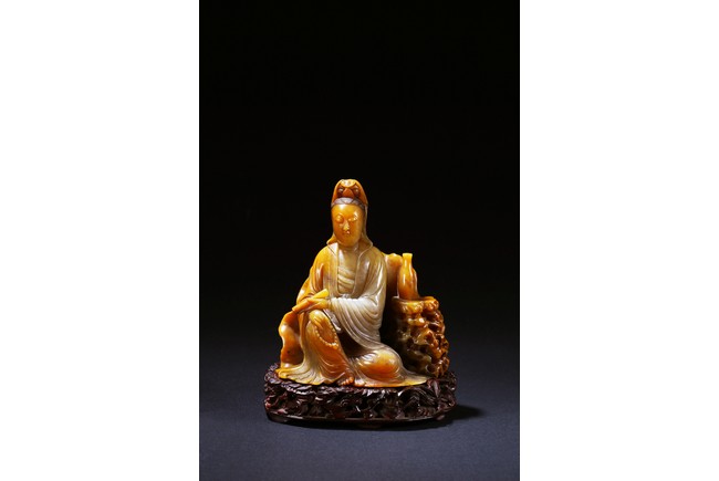 The figure is shown seated with one leg crossed in front of the other, partially exposing one bare foot, and with one hand holding a rosary resting on a raised knee, dressed in long, loose robes incised with scrolled decorations around the body. The hair is finely incised and pulled up into a tall chignon beneath a loosely draped cowl. The back hidden behind a large carved lotus leaf, seated next to a wood stand with a vase, all supported on reticulated hardwood stand. Qing Dynasty period.