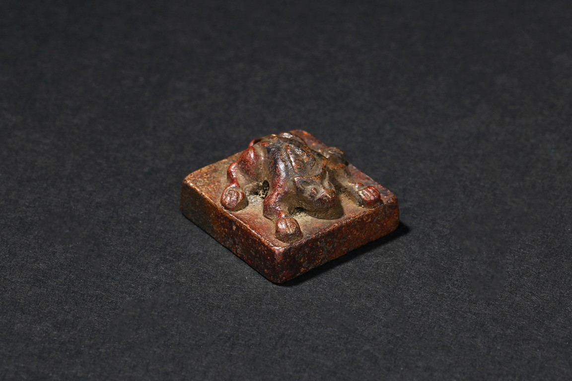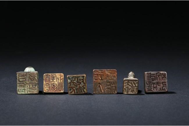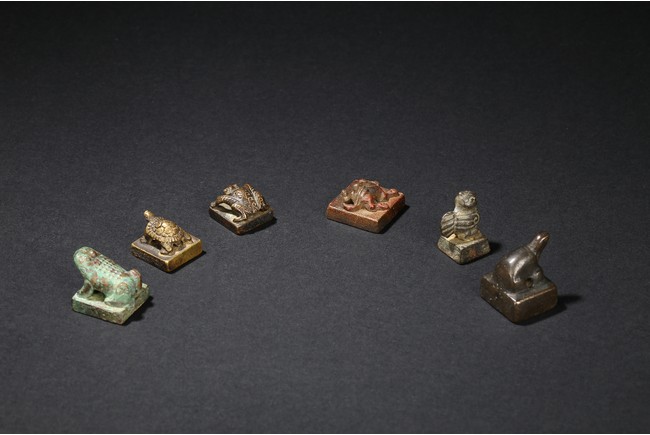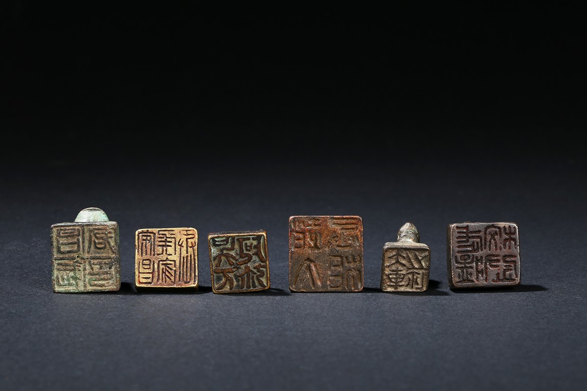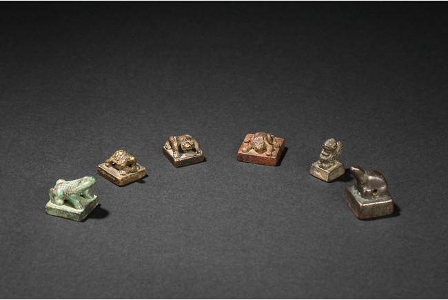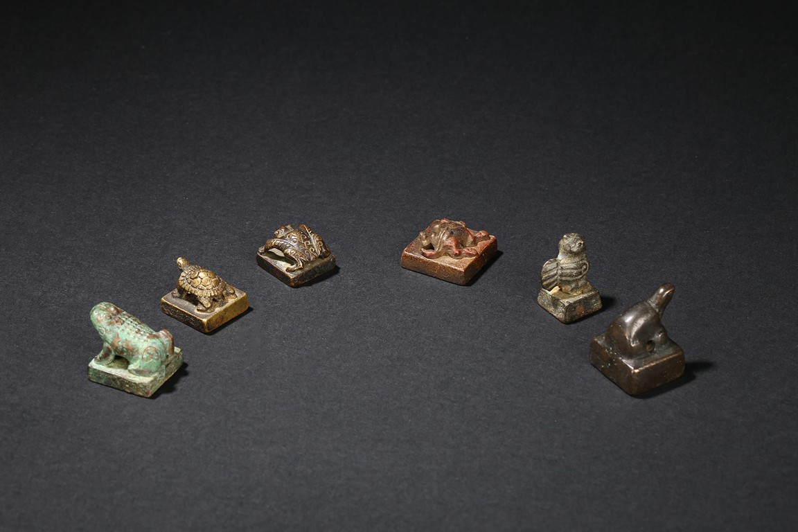 All of small section surmounted by various animal-formed handles, the undersides incised with varied zhuanshu inscriptions. Han Dynasty or later.